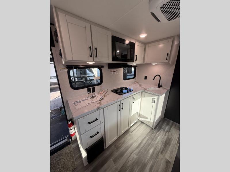Inside, you’ll find solid hardwood cabinet doors with hidden hinges, giving the space a modern, residential feel. Oversized cabinets and under-bed storage ensure there’s room for everything you need, while the lit exterior passthrough storage makes packing and unpacking a breeze.