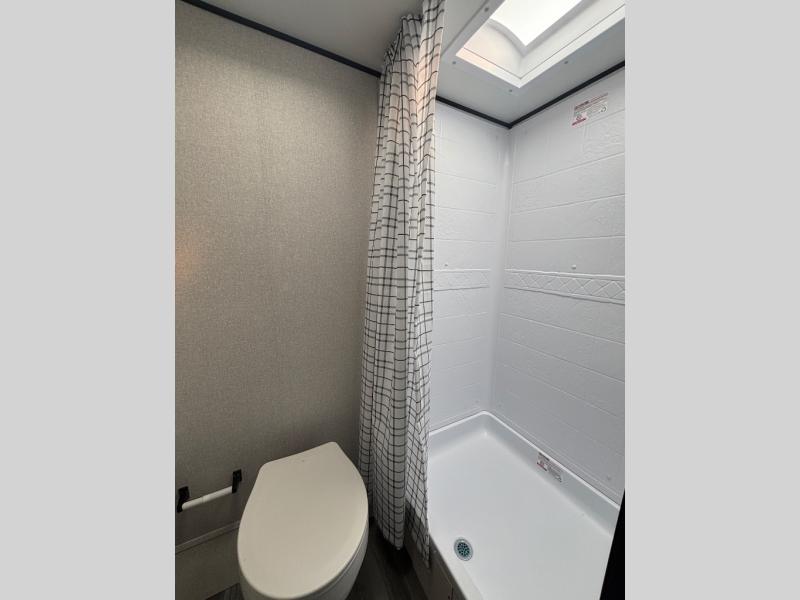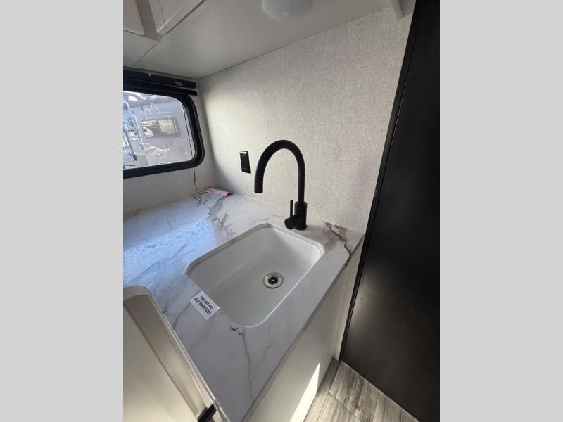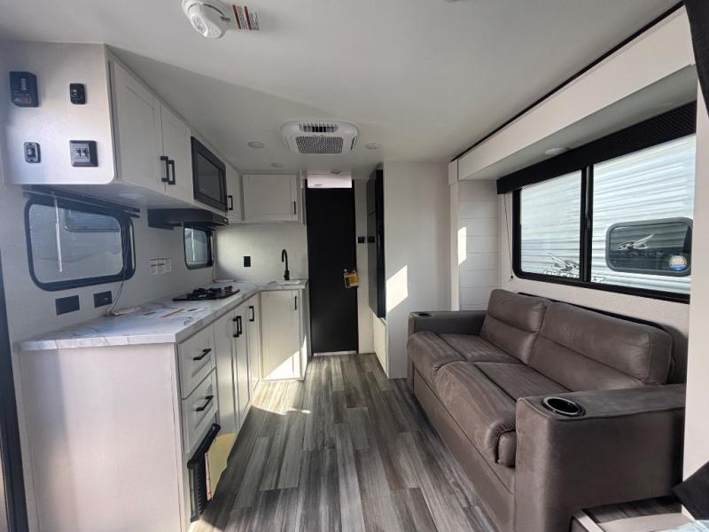 This single-axle couple's travel trailer is sure to bring you happiness at the campground. There is a front queen bed with a privacy curtain if you have a guest staying over on the jack-knife sofa, and the movable table in front of the sofa will provide more floor space when needed. A cooktop and microwave oven will let you make meals each day, and an 8 cu. ft. 12V refrigerator will be perfect for perishables. This model also includes a full rear bath with a tub/shower, a toilet, plus a sink and a linen closet for clean towels. The optional Baja Package can be added on this model which includes 16 in. off-road tires, a deluxe graphics package, triple entry steps, and more!