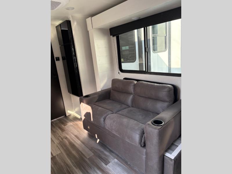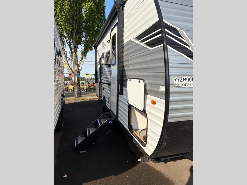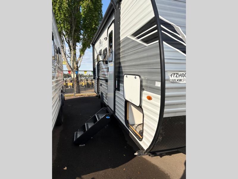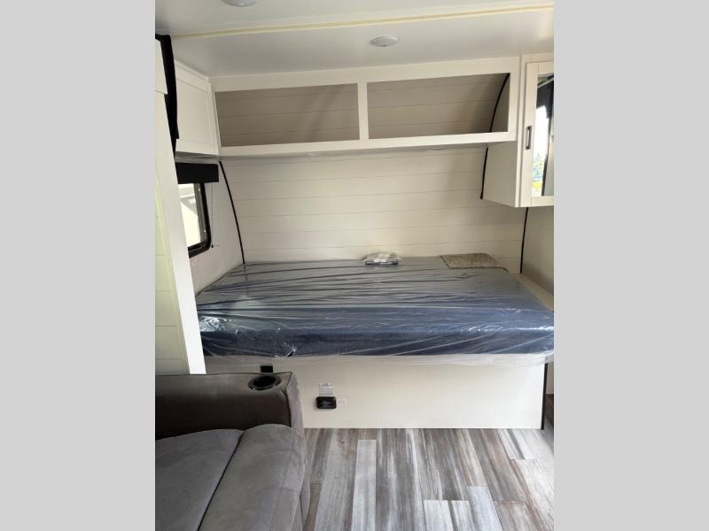 This single-axle couple's travel trailer is sure to bring you happiness at the campground. There is a front queen bed with a privacy curtain if you have a guest staying over on the jack-knife sofa, and the movable table in front of the sofa will provide more floor space when needed. A cooktop and microwave oven will let you make meals each day, and an 8 cu. ft. 12V refrigerator will be perfect for perishables. This model also includes a full rear bath with a shower, a toilet, plus a sink and a linen closet for clean towels.