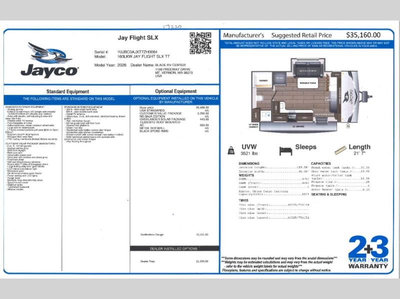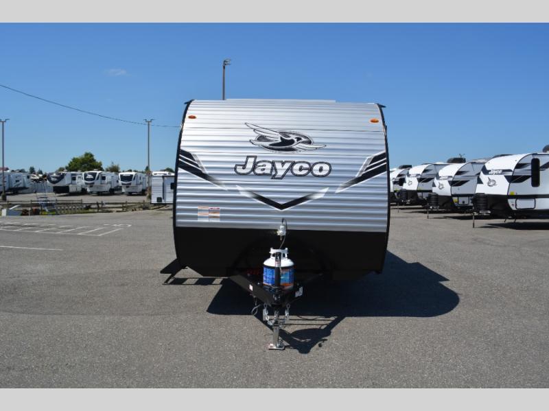 The Jayco Jay Flight SLX travel trailer is quite easy to own because it is lightweight for an easier towing experience. Built on a fully integrated A-frame with galvanized-steel, impact-resistant wheel wells, the Jay Flight SLX has quality at its very foundation. That quality continues on to the electric self-adjusting brakes, easy-lube hubs, Magnum Truss roof system, and LP quick connect. Some of what the mandatory Customer Value Package includes is backup camera prep, Keyed-Alike entry and baggage doors, and an on-demand tankless water heater.