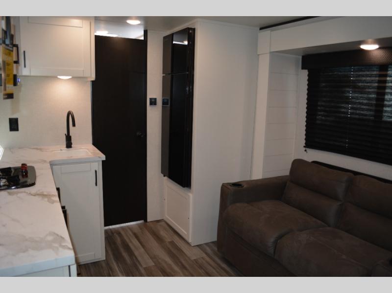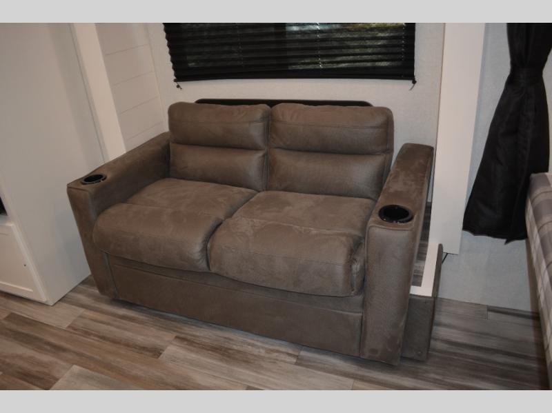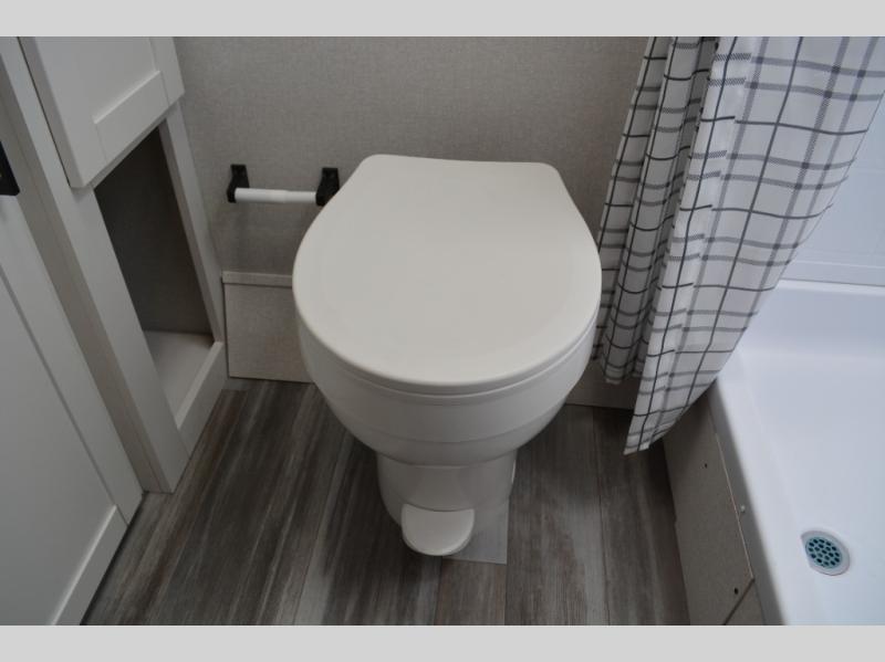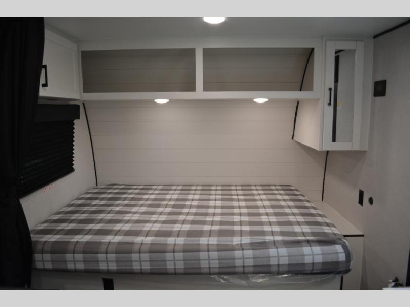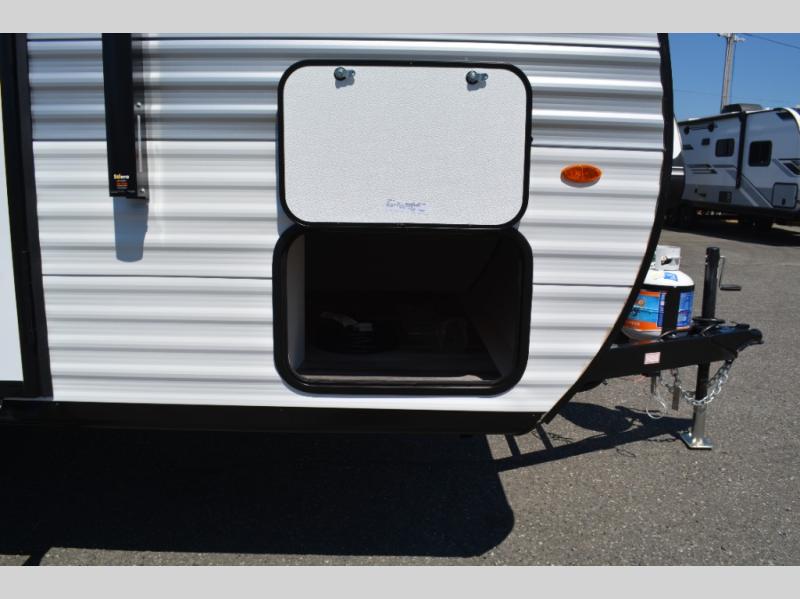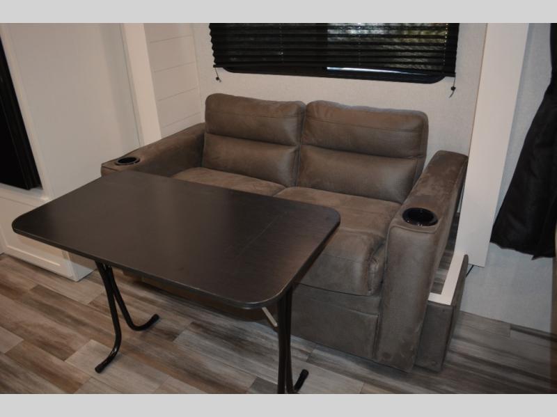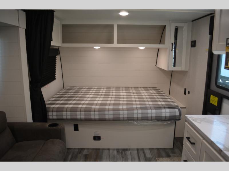 This single-axle couple's travel trailer is sure to bring you happiness at the campground. There is a front queen bed with a privacy curtain if you have a guest staying over on the jack-knife sofa, and the movable table in front of the sofa will provide more floor space when needed. A cooktop and microwave oven will let you make meals each day, and an 8 cu. ft. 12V refrigerator will be perfect for perishables. This model also includes a full rear bath with a shower, a toilet, plus a sink and a linen closet for clean towels.