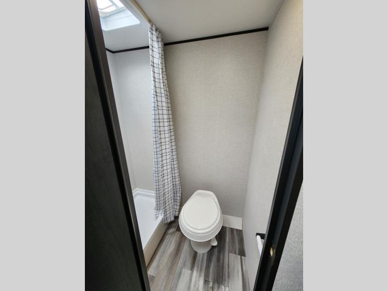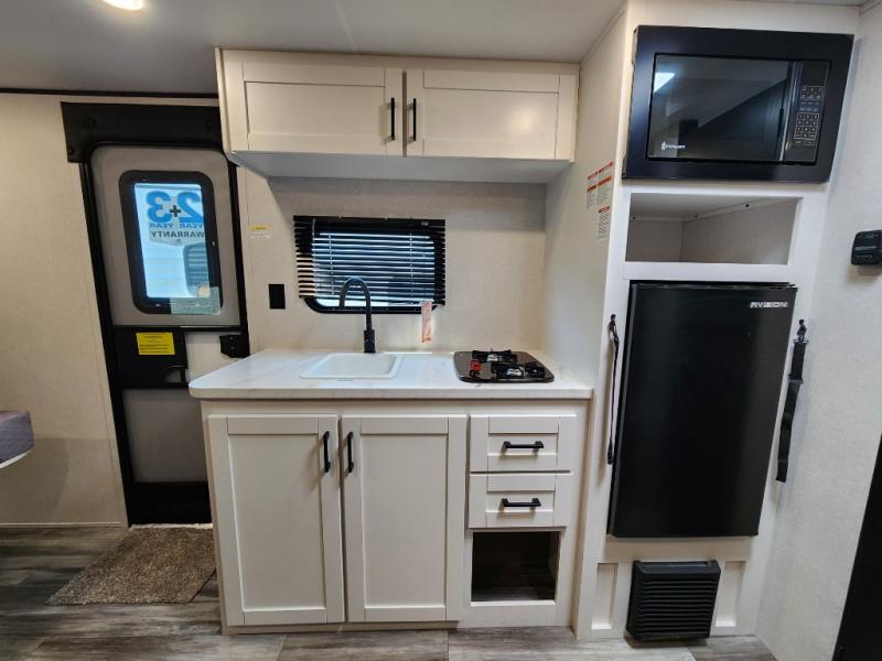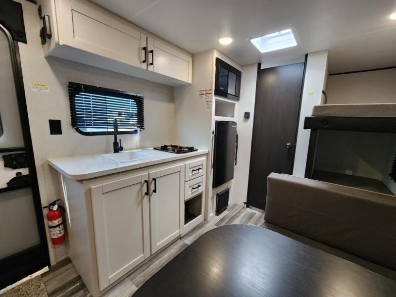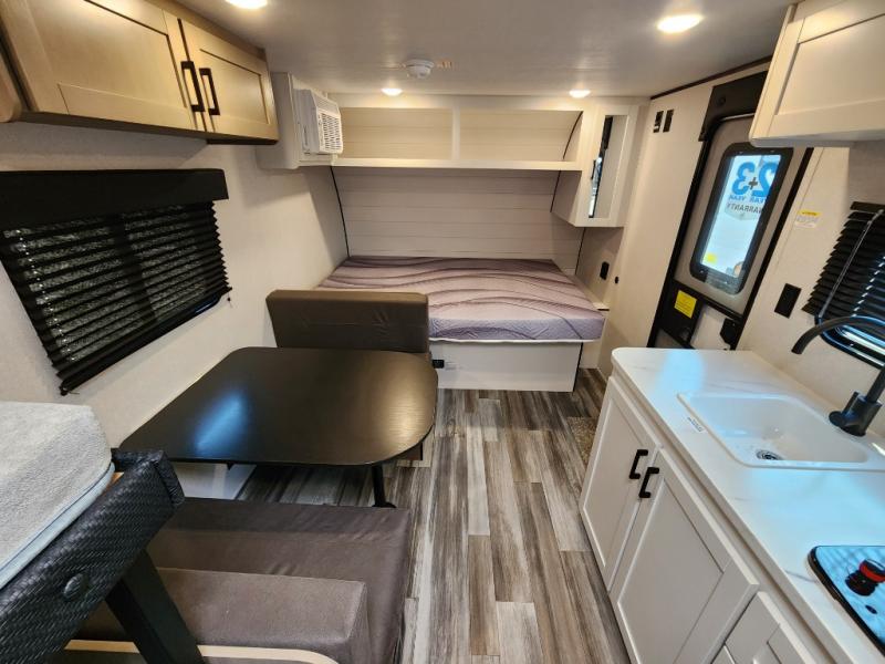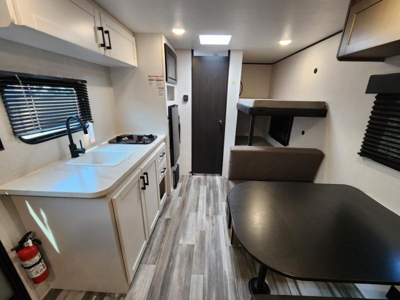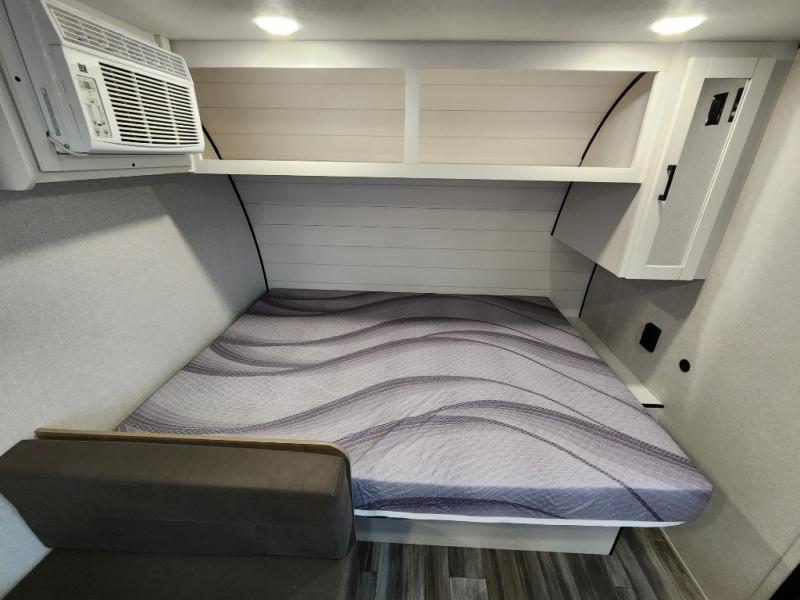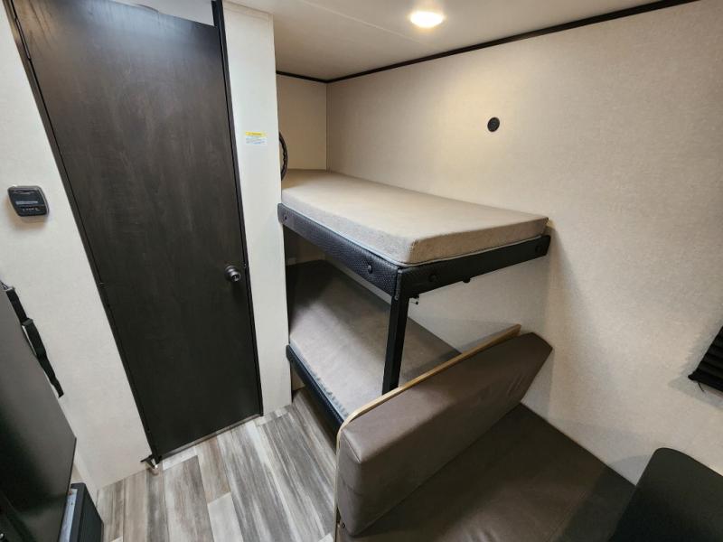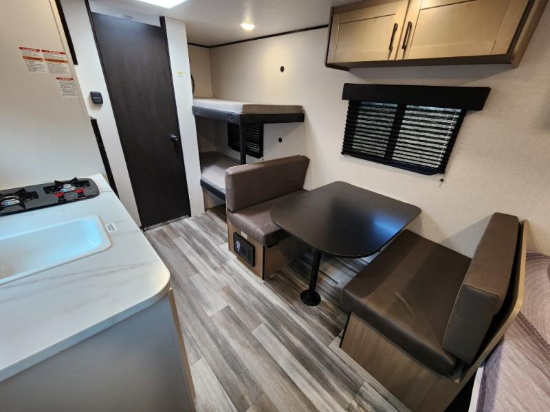 Your crew of five will love camping in this single-axle travel trailer! There are bunk beds in the rear corner and a full bath in the other rear corner for easy nighttime use. You will have the front queen bed to yourselves, along with an overhead shelf and a nightstand/wardrobe for your clothes. The booth dinette provides a place to dine, play games, and even let an extra guest stay over. The Customer Value Package on this Sport Edition model includes a 19K BTU furnace, stabilizer jacks, a power awning, an entry door with a window and shade prep, and many more stand-out features!