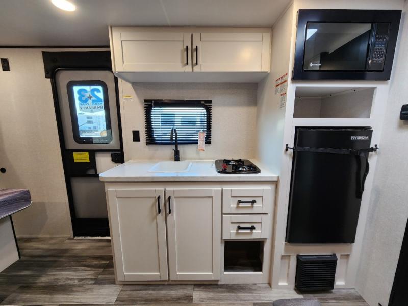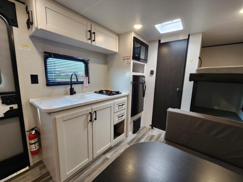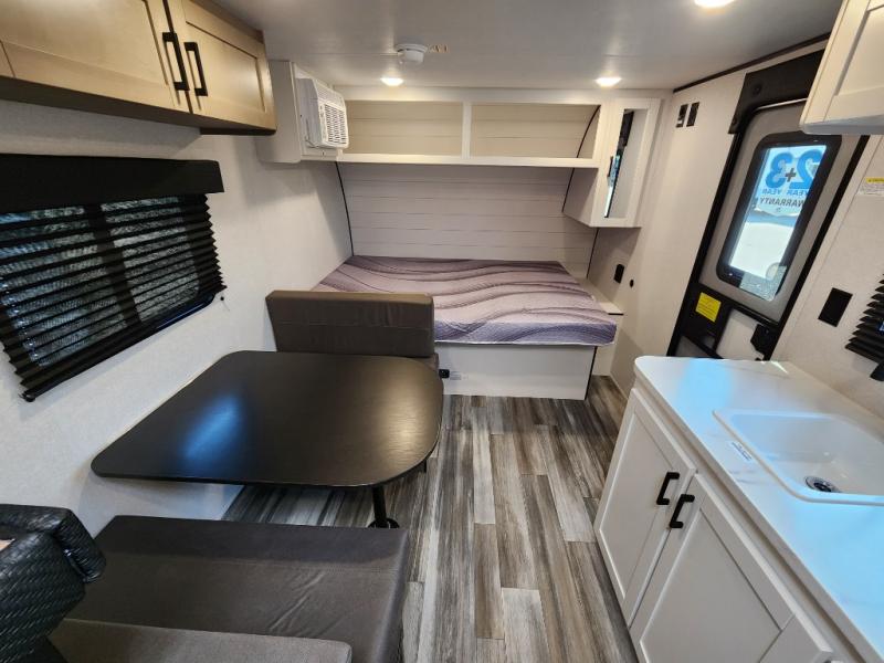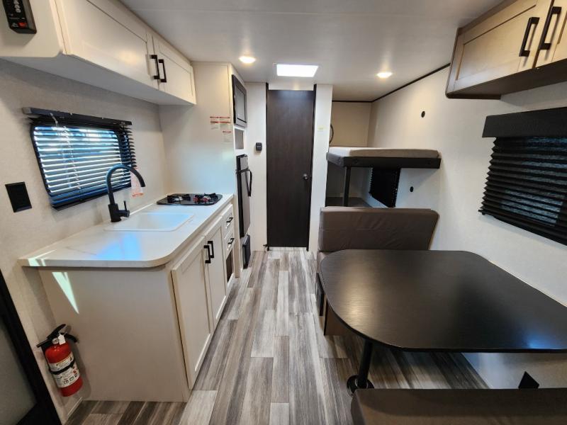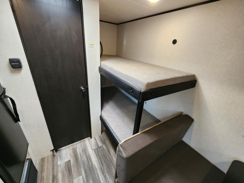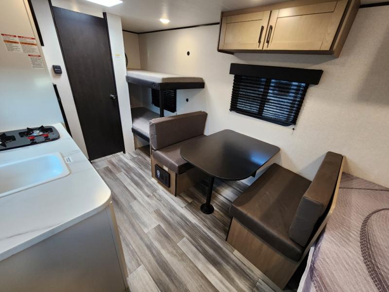 Your crew of five will love camping in this single-axle travel trailer! There are bunk beds in the rear corner and a full bath in the other rear corner for easy nighttime use. You will have the front queen bed to yourselves, along with an overhead shelf and a nightstand/wardrobe for your clothes. The booth dinette provides a place to dine, play games, and even let an extra guest stay over. The Customer Value Package on this Sport Edition model includes a 19K BTU furnace, stabilizer jacks, a power awning, an entry door with a window and shade prep, and many more stand-out features!