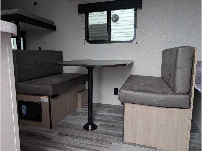 Your crew of five will love camping in this single-axle travel trailer! There are bunk beds in the rear corner and a full bath in the other rear corner for easy nighttime use. You will have the front queen bed to yourselves, along with an overhead shelf and a nightstand/wardrobe for your clothes. The booth dinette provides a place to dine, play games, and even let an extra guest stay over. The Customer Value Package on this Sport Edition model includes a 19K BTU furnace, stabilizer jacks, a power awning, an entry door with a window and shade prep, and many more stand-out features!