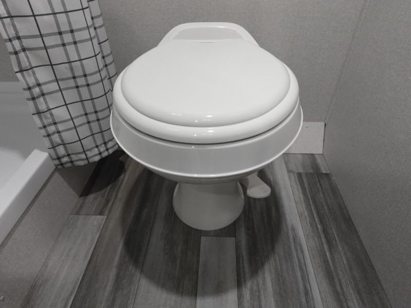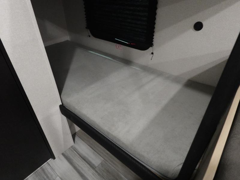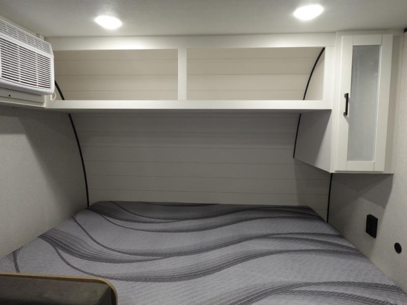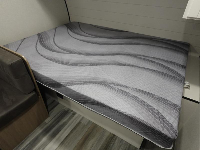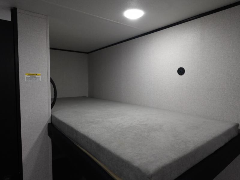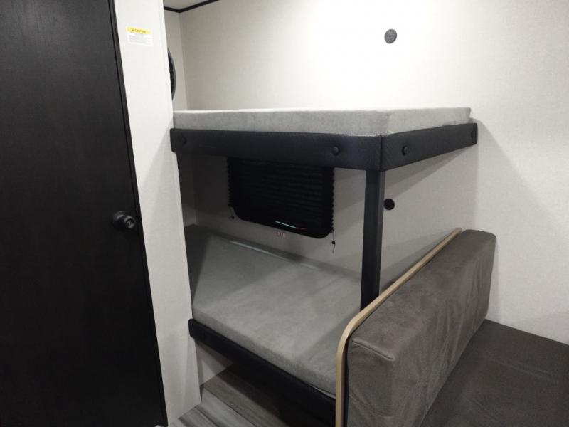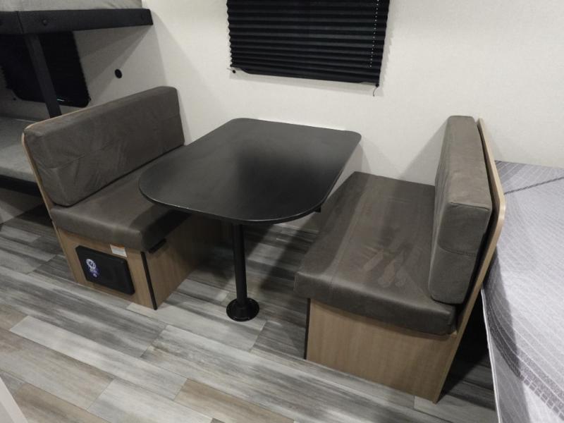 Your crew of five will love camping in this single-axle travel trailer! There are bunk beds in the rear corner and a full bath in the other rear corner for easy nighttime use. You will have the front queen bed to yourselves, along with an overhead shelf and a nightstand/wardrobe for your clothes. The booth dinette provides a place to dine, play games, and even let an extra guest stay over.