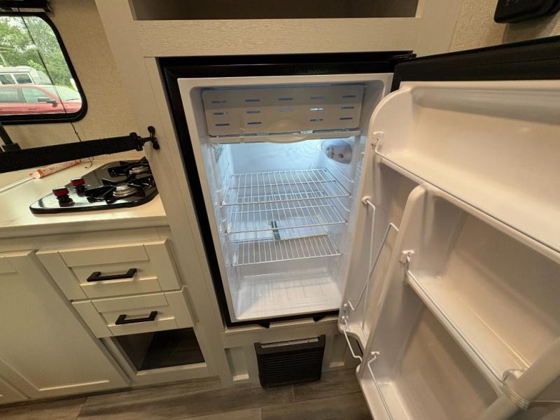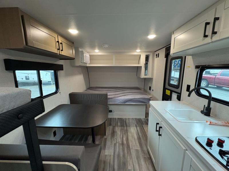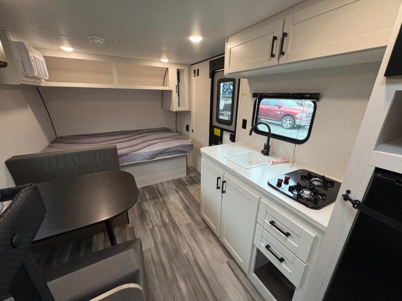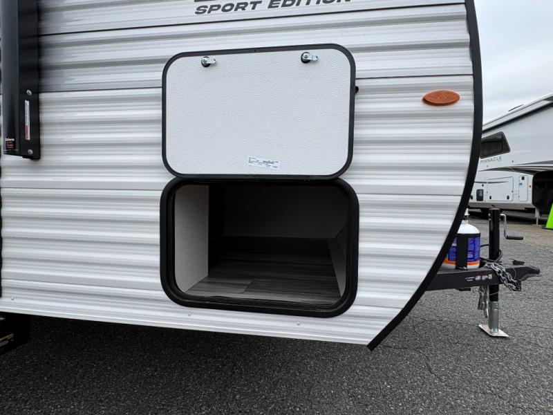 Your crew of five will love camping in this single-axle travel trailer! There are bunk beds in the rear corner and a full bath in the other rear corner for easy nighttime use. You will have the front queen bed to yourselves, along with an overhead shelf and a nightstand/wardrobe for your clothes. The booth dinette provides a place to dine, play games, and even let an extra guest stay over. The Customer Value Package on this Sport Edition model includes a 19K BTU furnace, stabilizer jacks, a power awning, an entry door with a window and shade prep, and many more stand-out features!