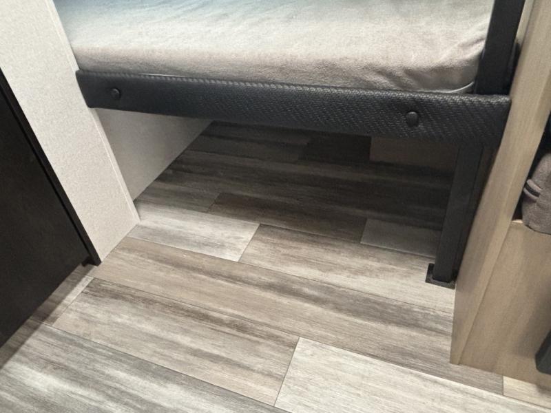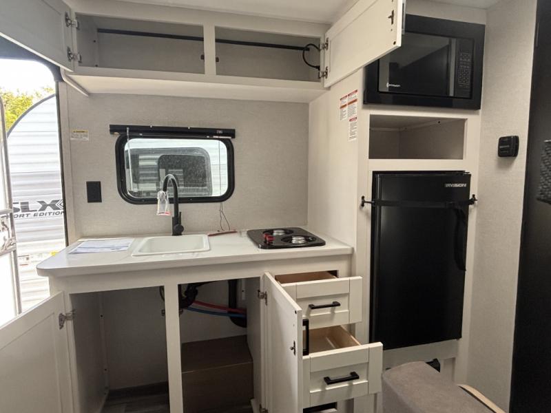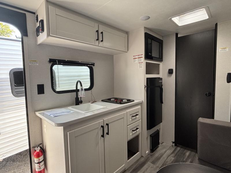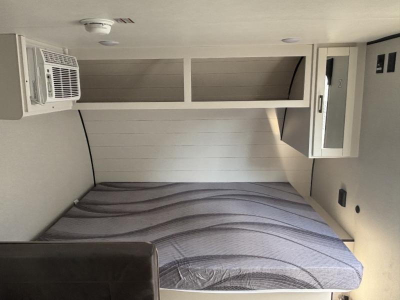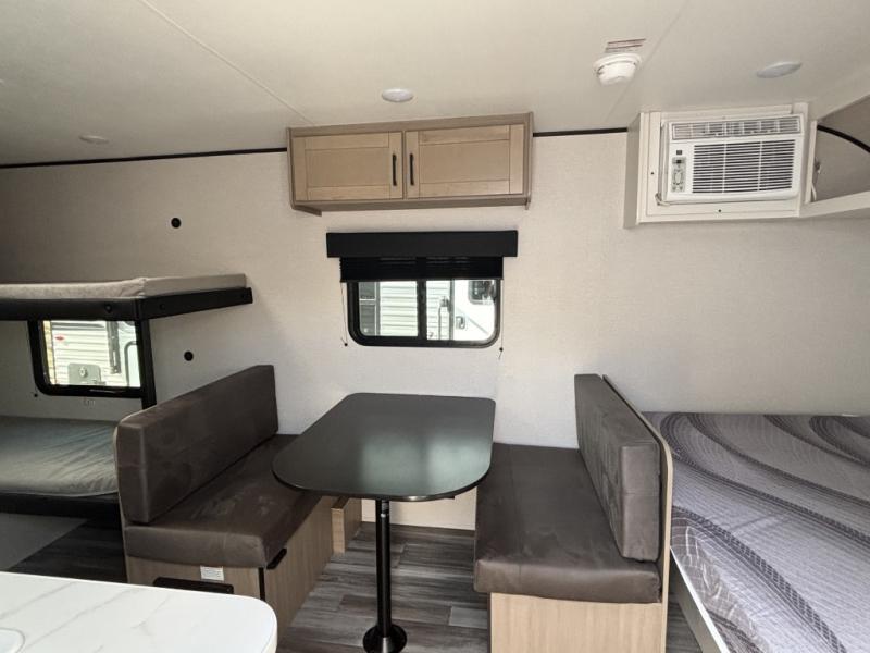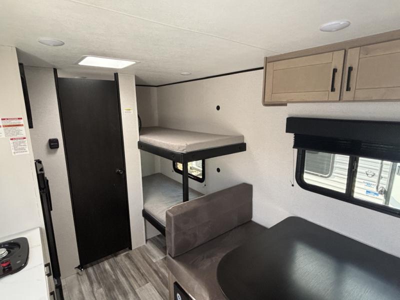 Your crew of five will love camping in this single-axle travel trailer! There are bunk beds in the rear corner and a full bath in the other rear corner for easy nighttime use. You will have the front queen bed to yourselves, along with an overhead shelf and a nightstand/wardrobe for your clothes. The booth dinette provides a place to dine, play games, and even let an extra guest stay over. The Customer Value Package on this Sport Edition model includes a 19K BTU furnace, stabilizer jacks, a power awning, an entry door with a window and shade prep, and many more stand-out features!