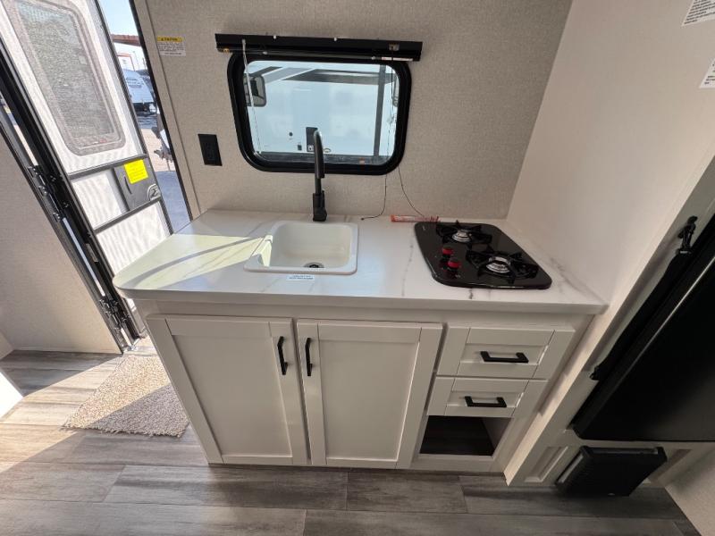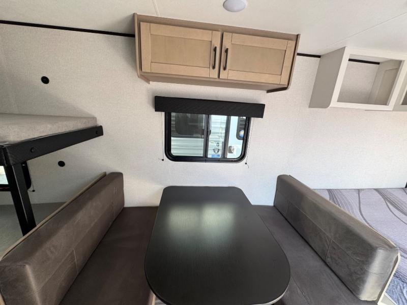 Your crew of five will love camping in this single-axle travel trailer! There are bunk beds in the rear corner and a full bath in the other rear corner for easy nighttime use. You will have the front queen bed to yourselves, along with an overhead shelf and a nightstand/wardrobe for your clothes. The booth dinette provides a place to dine, play games, and even let an extra guest stay over. The Customer Value Package on this Sport Edition model includes a 19K BTU furnace, stabilizer jacks, a power awning, an entry door with a window and shade prep, and many more stand-out features!