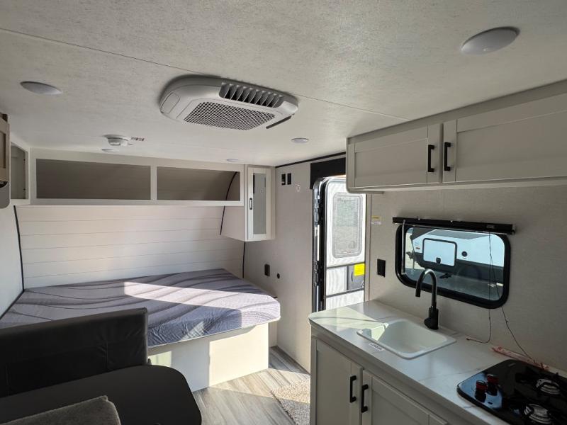 Your crew of five will love camping in this single-axle travel trailer! There are bunk beds in the rear corner and a full bath in the other rear corner for easy nighttime use. You will have the front queen bed to yourselves, along with an overhead shelf and a nightstand/wardrobe for your clothes. The booth dinette provides a place to dine, play games, and even let an extra guest stay over. The Customer Value Package on this Sport Edition model includes a 19K BTU furnace, stabilizer jacks, a power awning, an entry door with a window and shade prep, and many more stand-out features!
