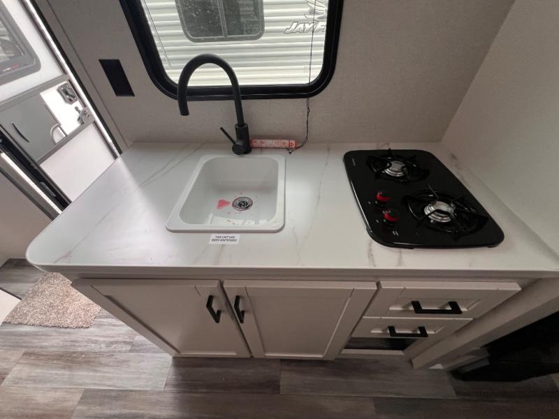 The Jayco Jay Flight SLX travel trailer is quite easy to own because it is lightweight for an easier towing experience. Built on a fully integrated A-frame with galvanized-steel, impact-resistant wheel wells, the Jay Flight SLX has quality at its very foundation. That quality continues on to the electric self-adjusting brakes, easy-lube hubs, Magnum Truss roof system, and LP quick connect. Some of what the mandatory Customer Value Package includes is backup camera prep, Keyed-Alike entry and baggage doors, and an on-demand tankless water heater.