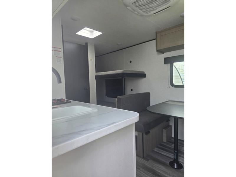 Your crew of five will love camping in this single-axle travel trailer! There are bunk beds in the rear corner and a full bath in the other rear corner for easy nighttime use. You will have the front queen bed to yourselves, along with an overhead shelf and a nightstand/wardrobe for your clothes. The booth dinette provides a place to dine, play games, and even let an extra guest stay over. The Customer Value Package on this Sport Edition model includes a 19K BTU furnace, stabilizer jacks, a power awning, an entry door with a window and shade prep, and many more stand-out features!