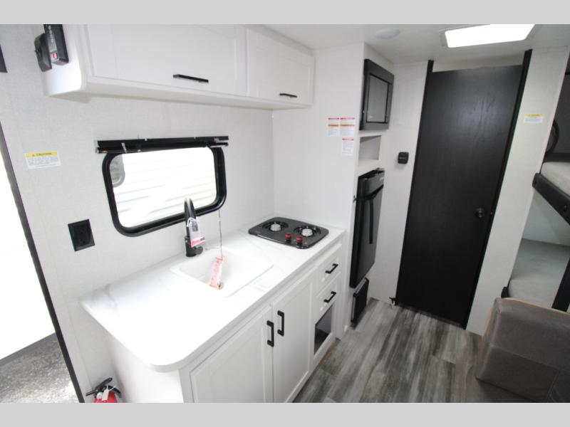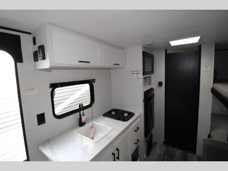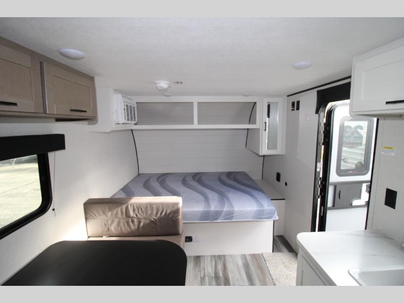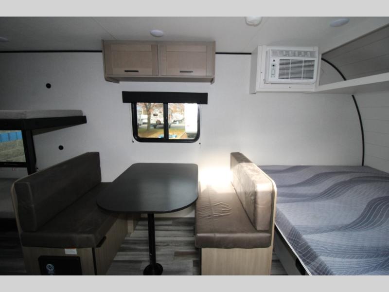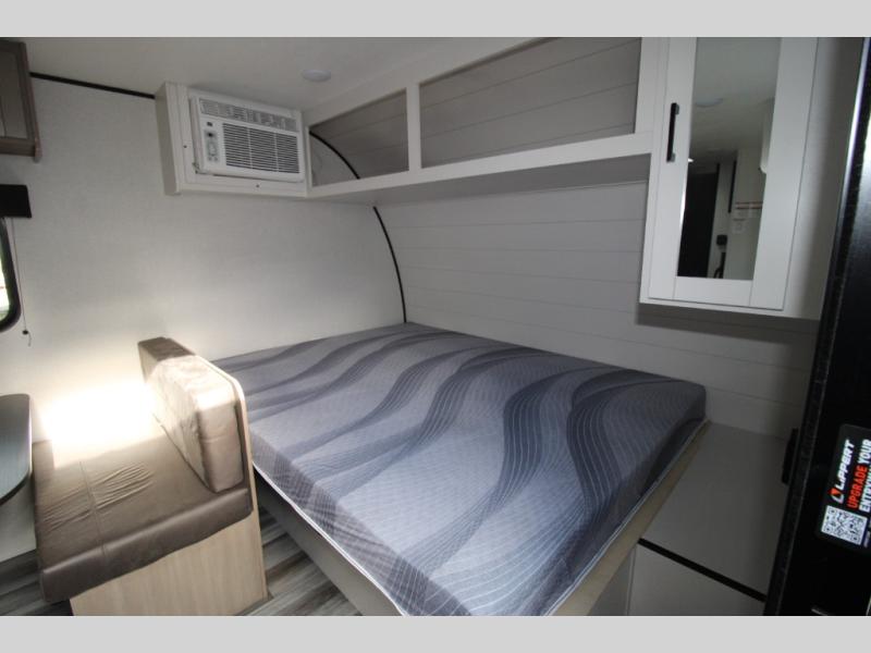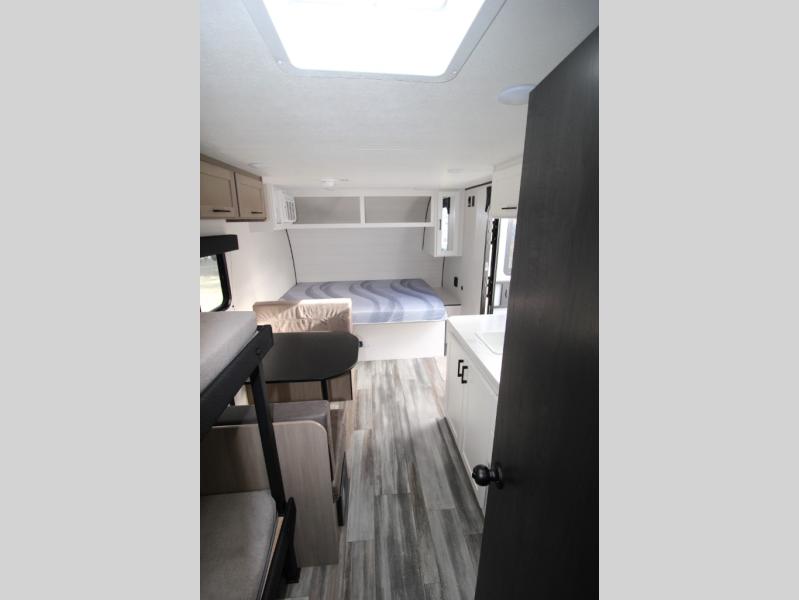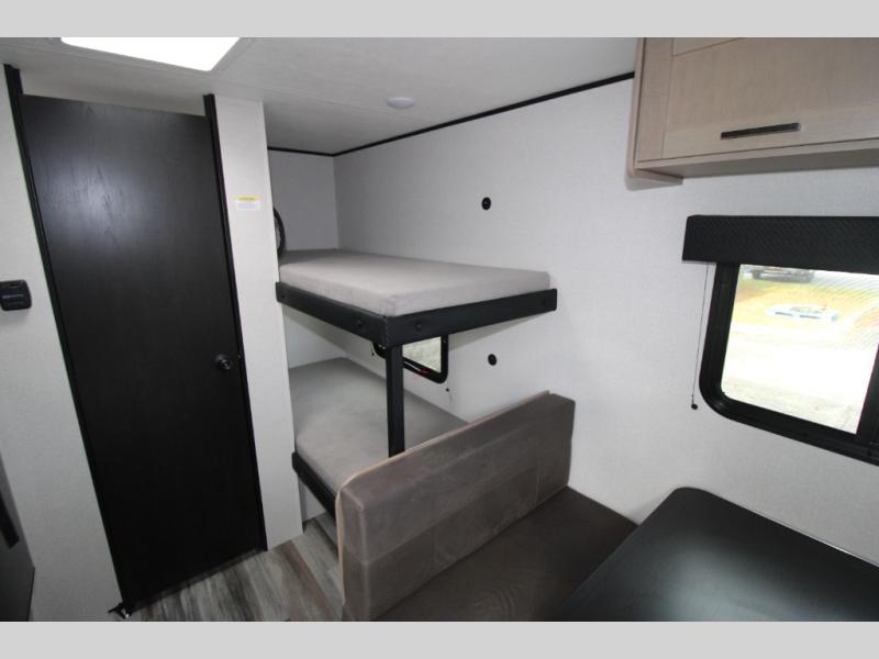 Your crew of five will love camping in this single-axle travel trailer! There are bunk beds in the rear corner and a full bath in the other rear corner for easy nighttime use. You will have the front queen bed to yourselves, along with an overhead shelf and a nightstand/wardrobe for your clothes. The booth dinette provides a place to dine, play games, and even let an extra guest stay over. The Customer Value Package on this Sport Edition model includes a 19K BTU furnace, stabilizer jacks, a power awning, an entry door with a window and shade prep, and many more stand-out features!
