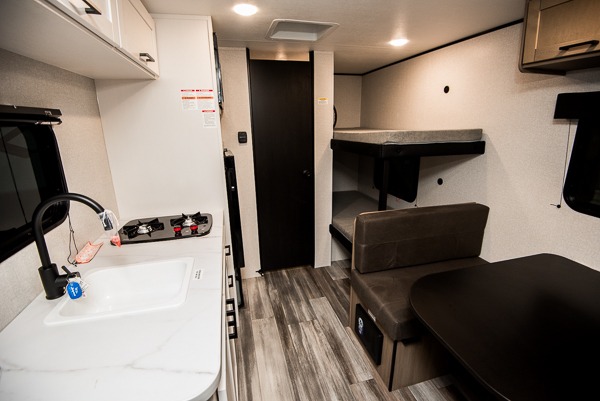 Your crew of five will love camping in this single-axle travel trailer! There are bunk beds in the rear corner and a full bath in the other rear corner for easy nighttime use. You will have the front queen bed to yourselves, along with an overhead shelf and a nightstand/wardrobe for your clothes. The booth dinette provides a place to dine, play games, and even let an extra guest stay over. The Customer Value Package on this Sport Edition model includes a 19K BTU furnace, stabilizer jacks, a power awning, an entry door with a window and shade prep, and many more stand-out features!