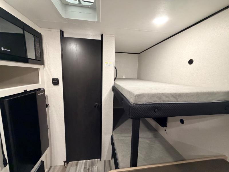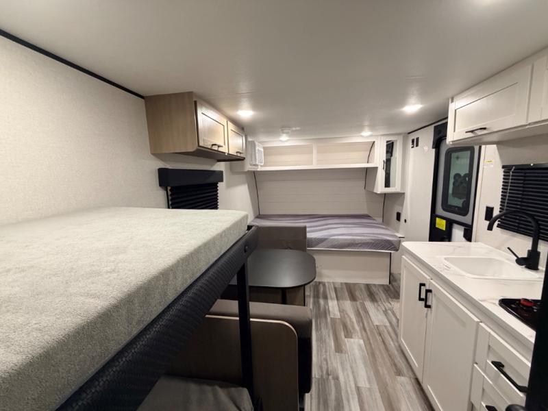 Your crew of five will love camping in this single-axle travel trailer! There are bunk beds in the rear corner and a full bath in the other rear corner for easy nighttime use. You will have the front queen bed to yourselves, along with an overhead shelf and a nightstand/wardrobe for your clothes. The booth dinette provides a place to dine, play games, and even let an extra guest stay over. The Customer Value Package on this Sport Edition model includes a 19K BTU furnace, stabilizer jacks, a power awning, an entry door with a window and shade prep, and many more stand-out features!