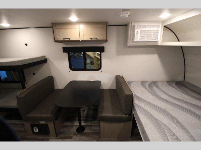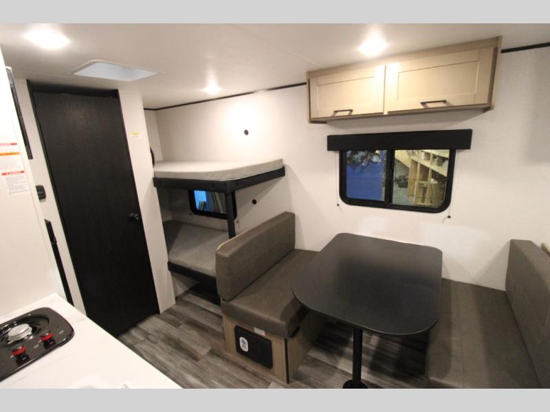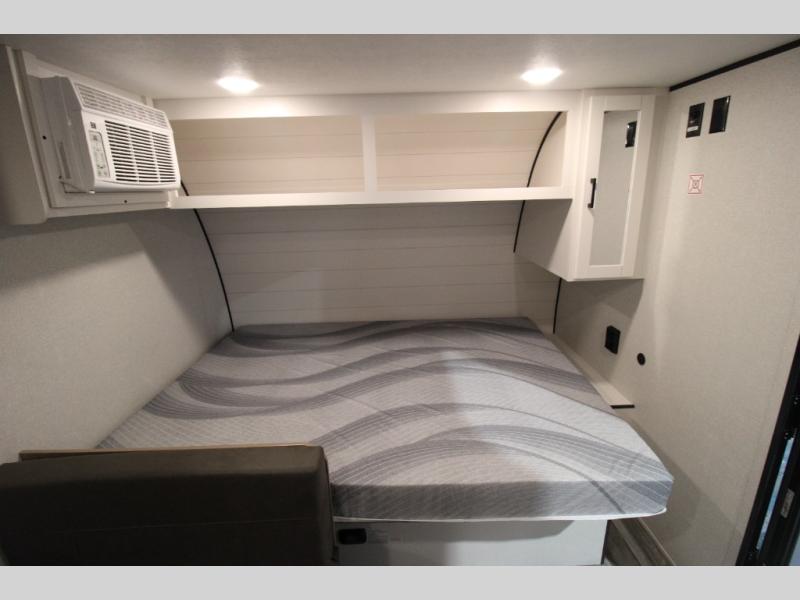 Your crew of five will love camping in this single-axle travel trailer! There are bunk beds in the rear corner and a full bath in the other rear corner for easy nighttime use. You will have the front queen bed to yourselves, along with an overhead shelf and a nightstand/wardrobe for your clothes. The booth dinette provides a place to dine, play games, and even let an extra guest stay over. The Customer Value Package on this Sport Edition model includes a 19K BTU furnace, stabilizer jacks, a power awning, an entry door with a window and shade prep, and many more stand-out features!