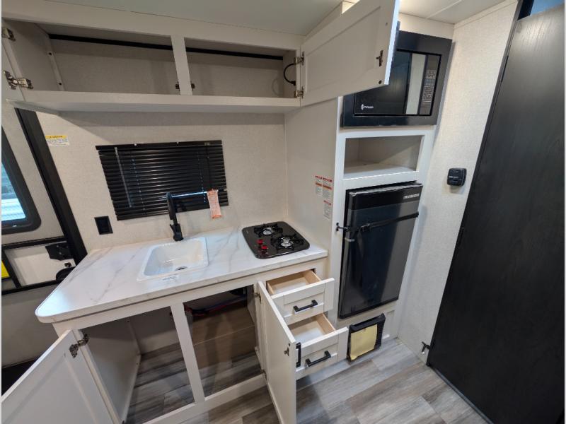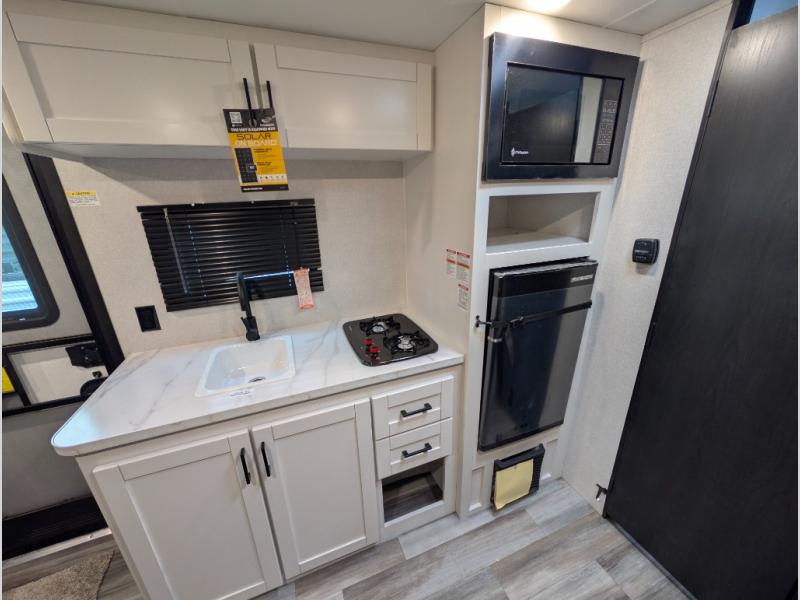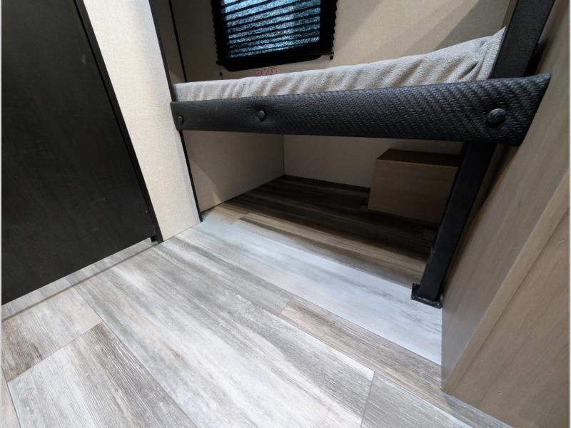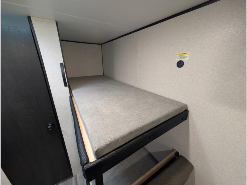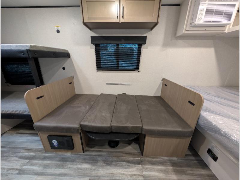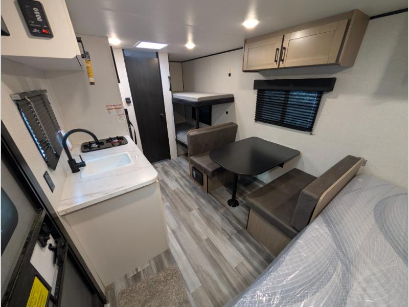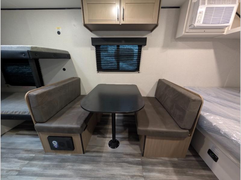 Your crew of five will love camping in this single-axle travel trailer! There are bunk beds in the rear corner and a full bath in the other rear corner for easy nighttime use. You will have the front queen bed to yourselves, along with an overhead shelf and a nightstand/wardrobe for your clothes. The booth dinette provides a place to dine, play games, and even let an extra guest stay over. The Customer Value Package on this Sport Edition model includes a 19K BTU furnace, stabilizer jacks, a power awning, an entry door with a window and shade prep, and many more stand-out features!