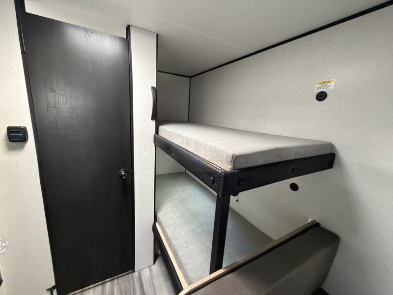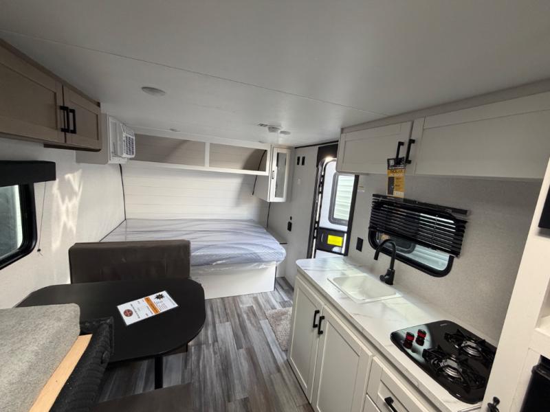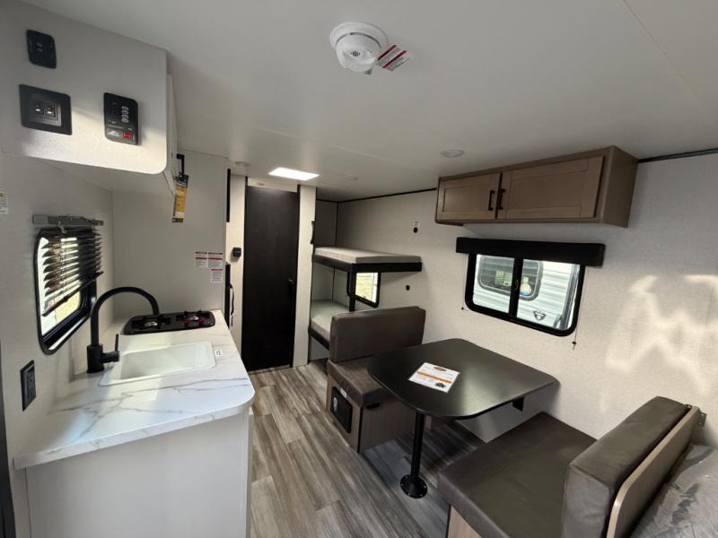 Your crew of five will love camping in this single-axle travel trailer! There are bunk beds in the rear corner and a full bath in the other rear corner for easy nighttime use. You will have the front queen bed to yourselves, along with an overhead shelf and a nightstand/wardrobe for your clothes. The booth dinette provides a place to dine, play games, and even let an extra guest stay over. The Customer Value Package on this Sport Edition model includes a 19K BTU furnace, stabilizer jacks, a power awning, an entry door with a window and shade prep, and many more stand-out features!