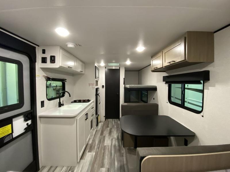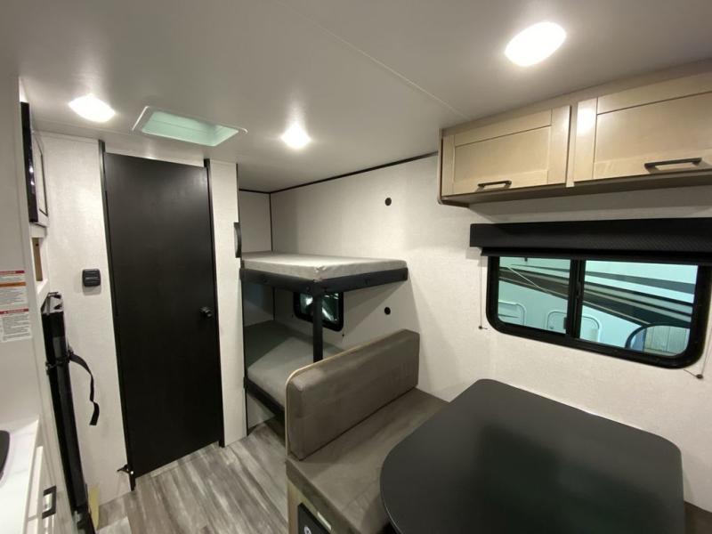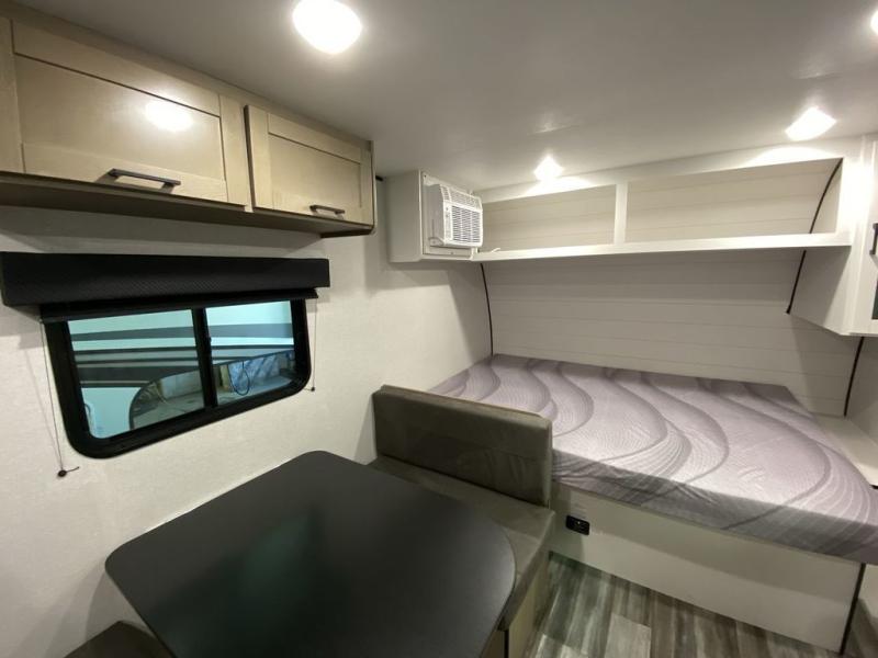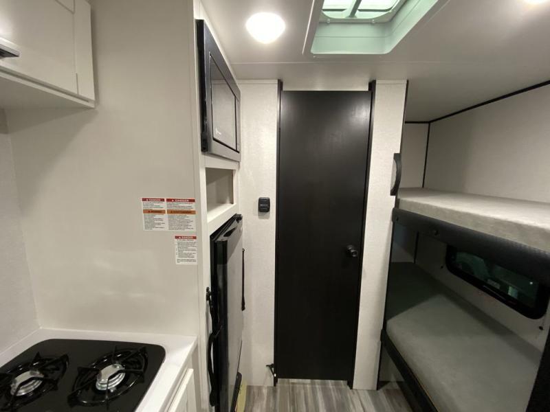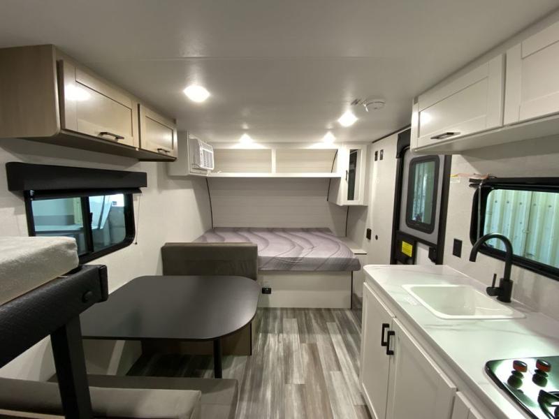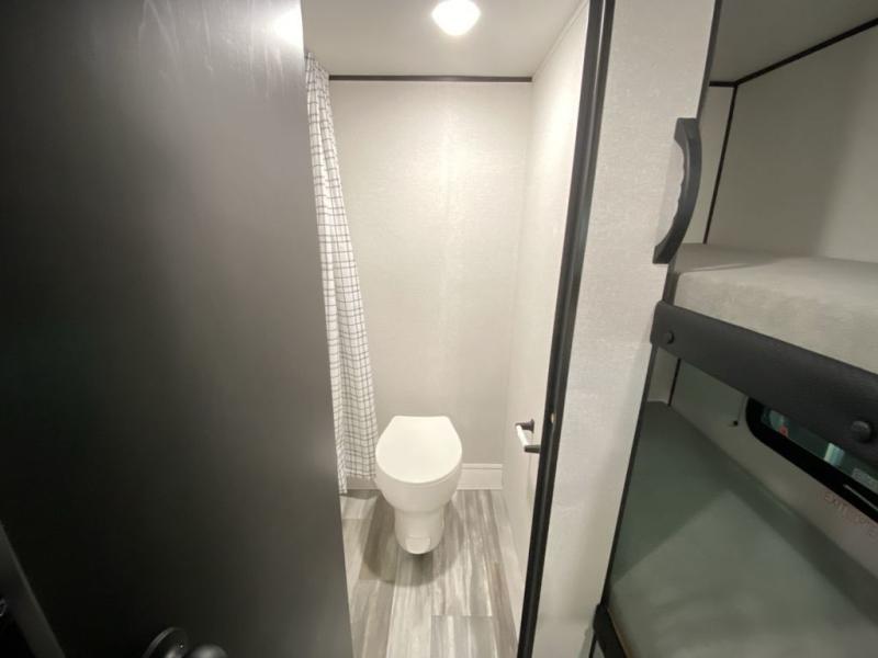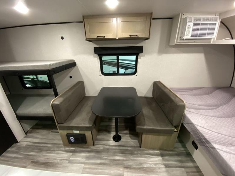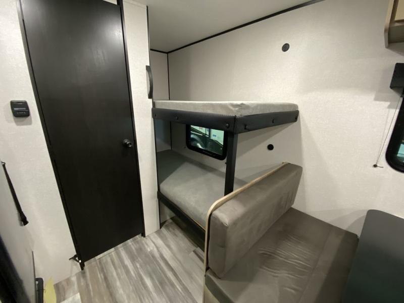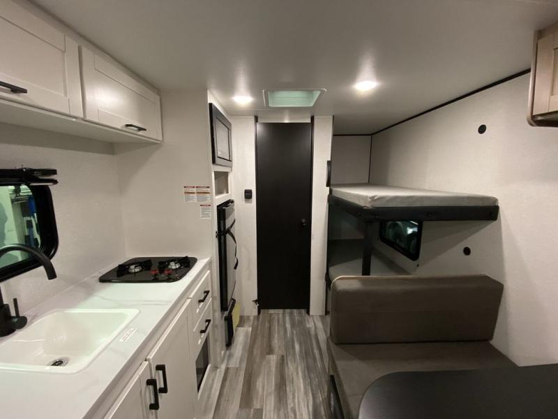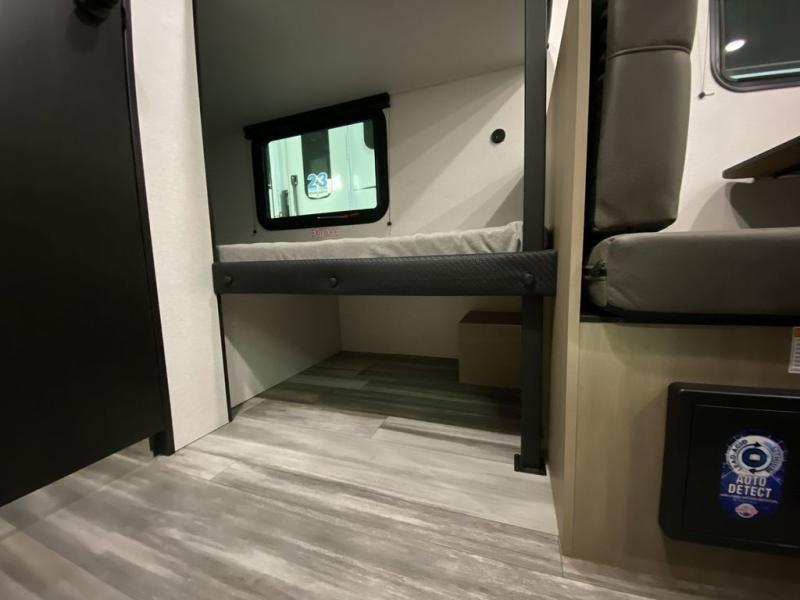 Your crew of five will love camping in this single-axle travel trailer! There are bunk beds in the rear corner and a full bath in the other rear corner for easy nighttime use. You will have the front queen bed to yourselves, along with an overhead shelf and a nightstand/wardrobe for your clothes. The booth dinette provides a place to dine, play games, and even let an extra guest stay over. The Customer Value Package on this Sport Edition model includes a 19K BTU furnace, stabilizer jacks, a power awning, an entry door with a window and shade prep, and many more stand-out features!