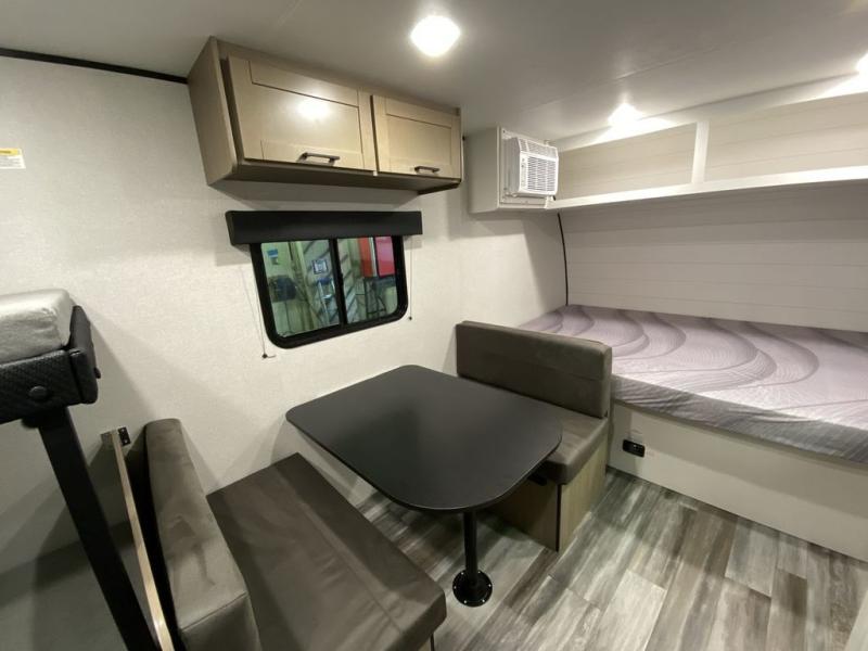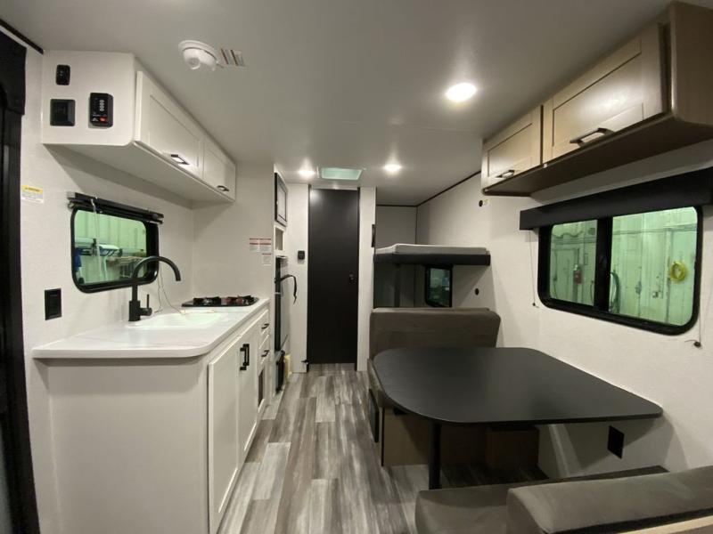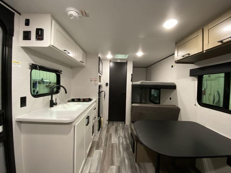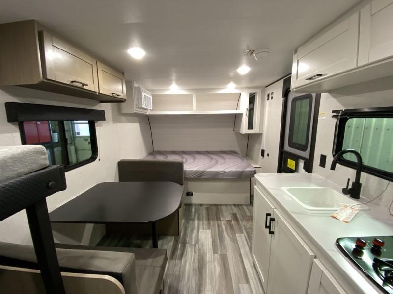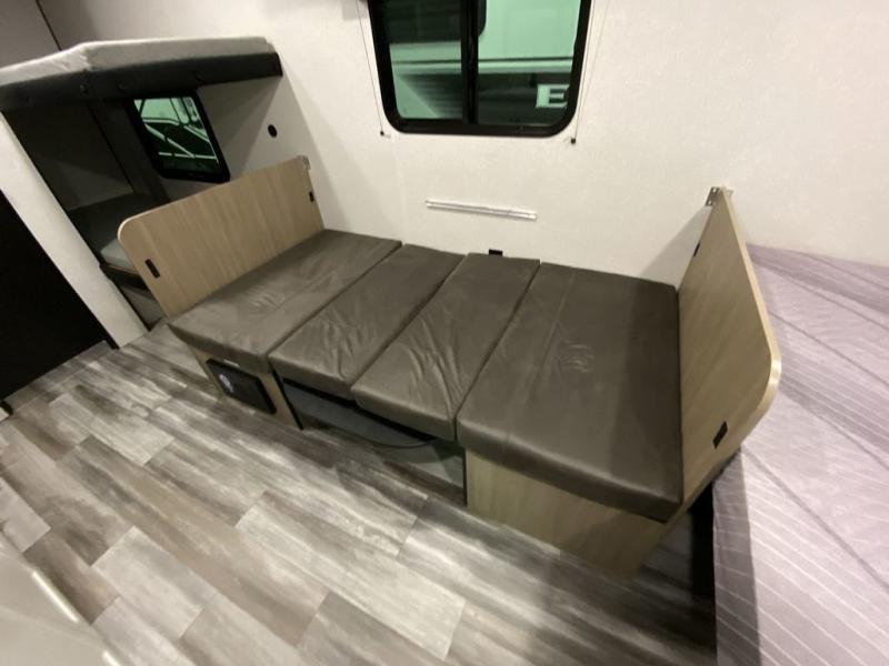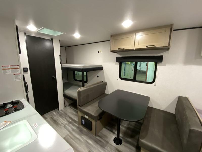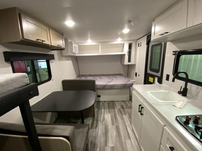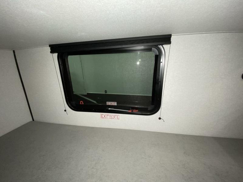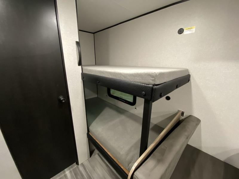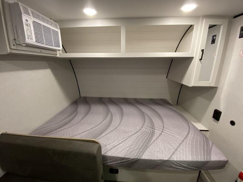 Your crew of five will love camping in this single-axle travel trailer! There are bunk beds in the rear corner and a full bath in the other rear corner for easy nighttime use. You will have the front queen bed to yourselves, along with an overhead shelf and a nightstand/wardrobe for your clothes. The booth dinette provides a place to dine, play games, and even let an extra guest stay over. The Customer Value Package on this Sport Edition model includes a 19K BTU furnace, stabilizer jacks, a power awning, an entry door with a window and shade prep, and many more stand-out features!