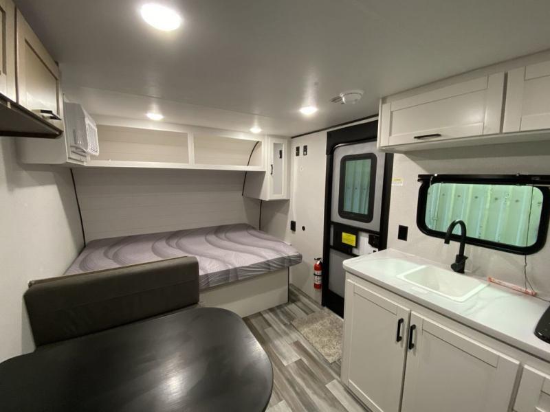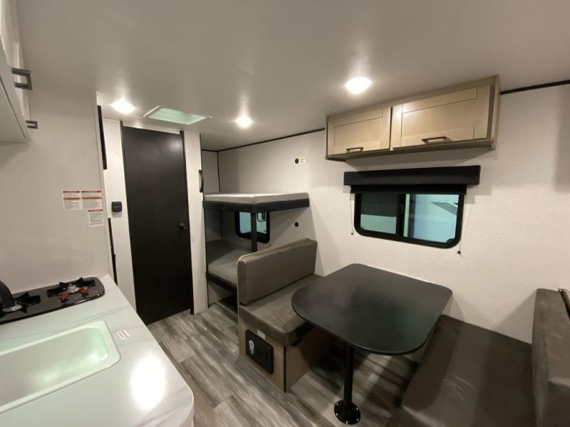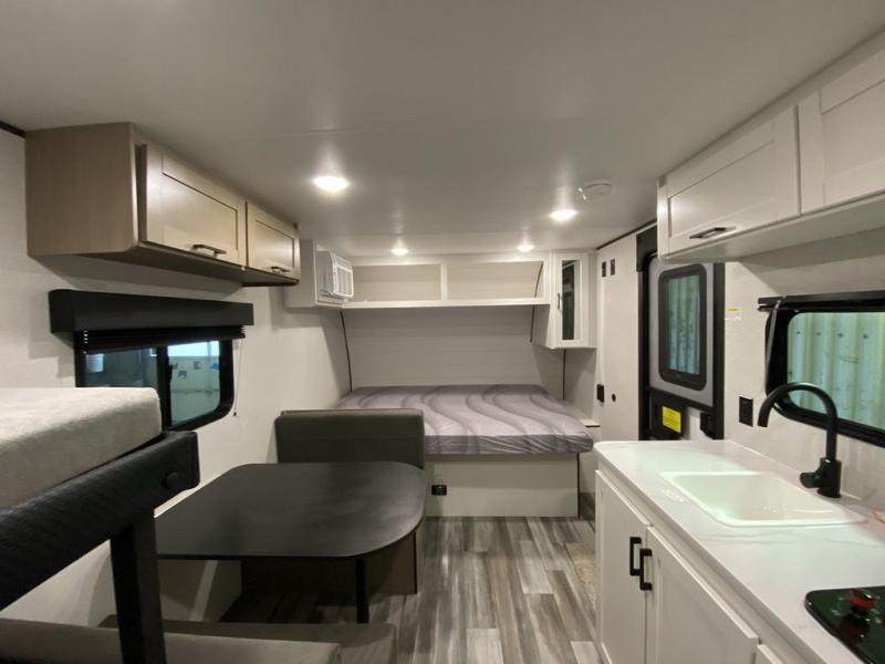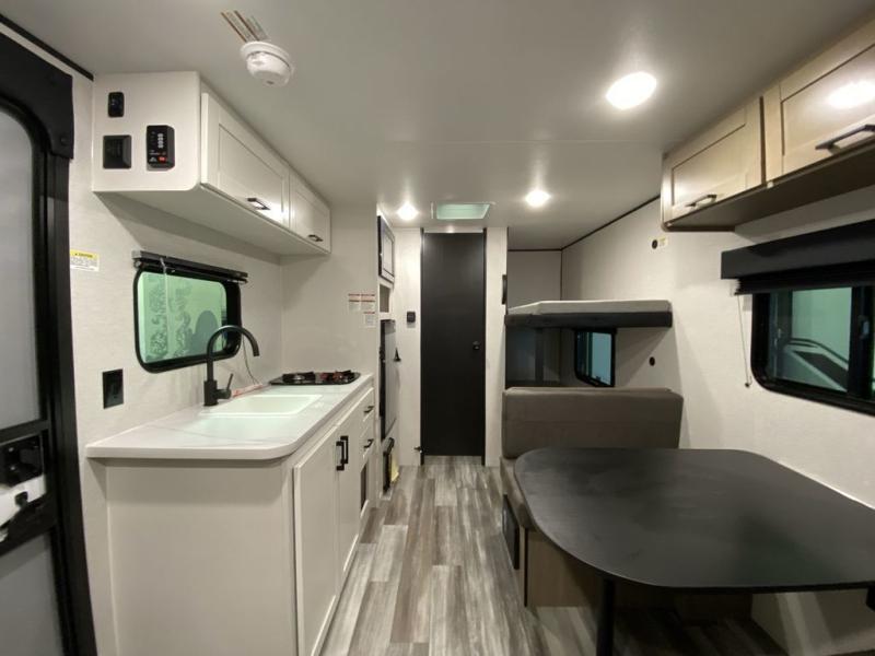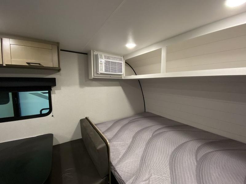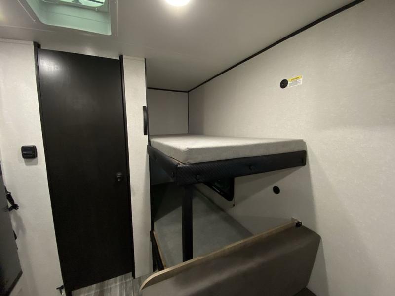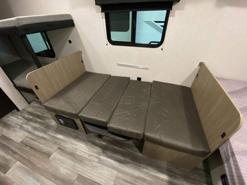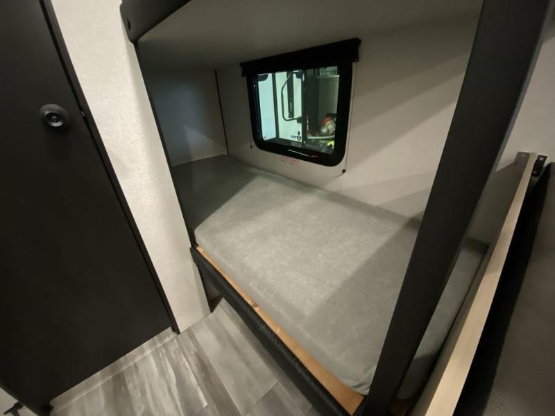 Your crew of five will love camping in this single-axle travel trailer! There are bunk beds in the rear corner and a full bath in the other rear corner for easy nighttime use. You will have the front queen bed to yourselves, along with an overhead shelf and a nightstand/wardrobe for your clothes. The booth dinette provides a place to dine, play games, and even let an extra guest stay over. The Customer Value Package on this Sport Edition model includes a 19K BTU furnace, stabilizer jacks, a power awning, an entry door with a window and shade prep, and many more stand-out features!