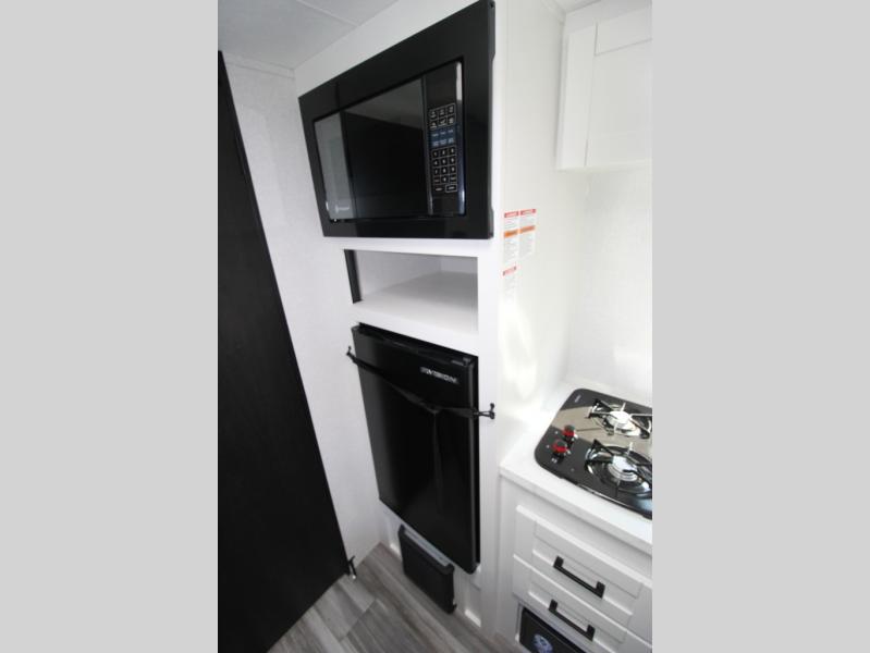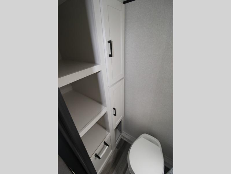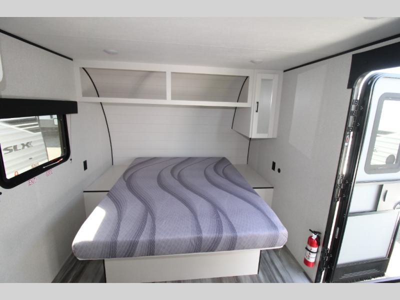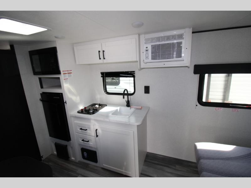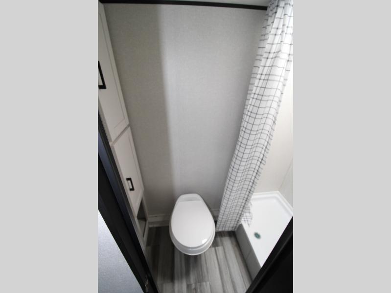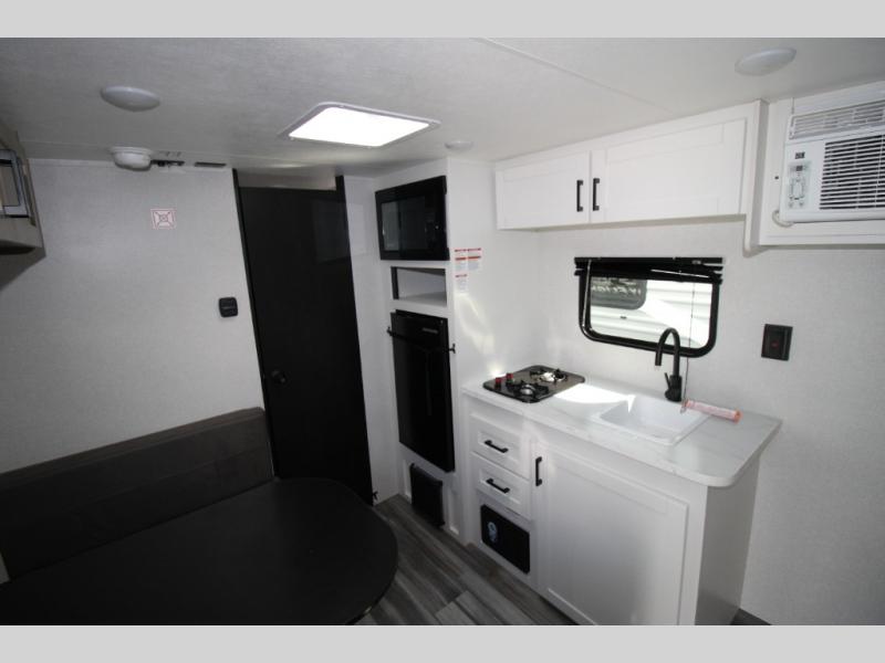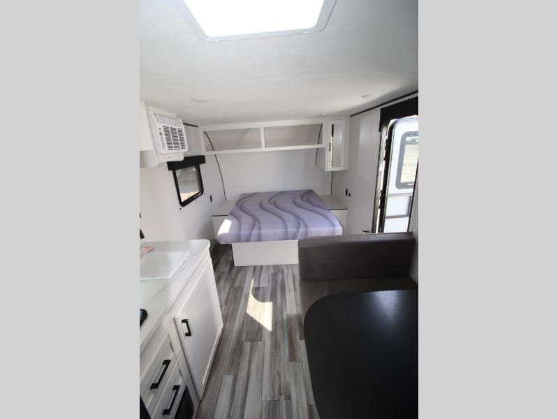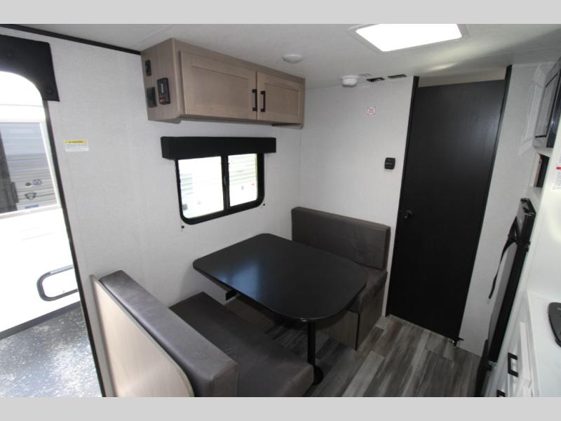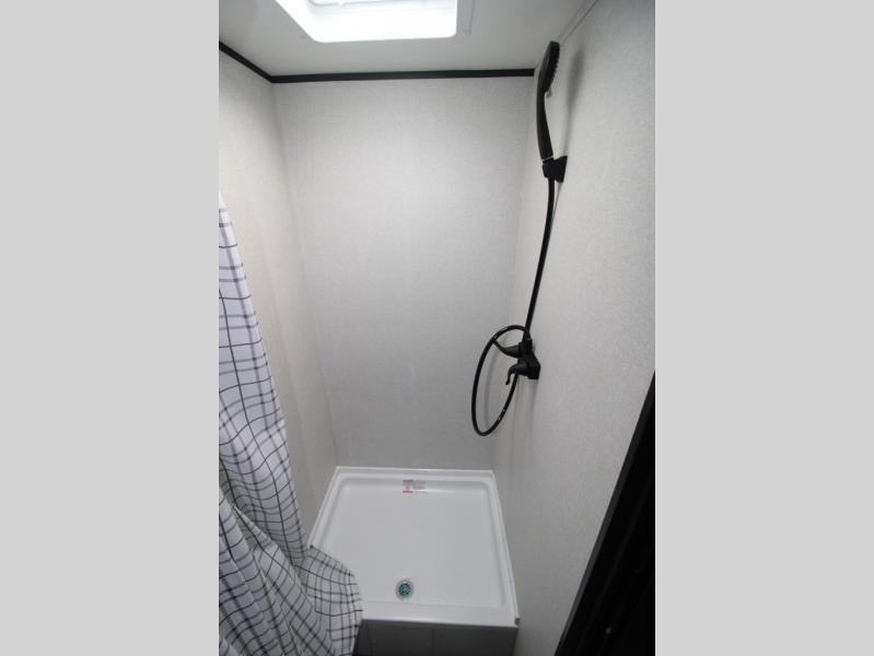 This travel trailer includes everything you need for fun trips at the lake. When you arrive at the campground, you can unload the exterior storage, then put out the 10' power awning. The booth dinette inside will provide a place to dine together, and the full rear bath with a shower will make it easier than ever to clean up after a day of hiking. A front RV queen bed will provide a great night's rest, and the overhead shelf will be perfect for books or personal belongings.