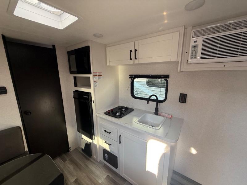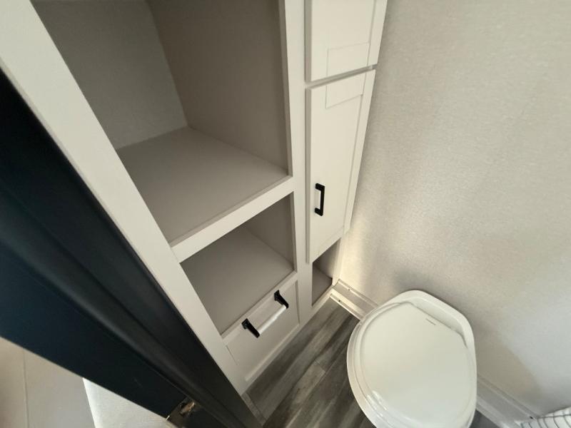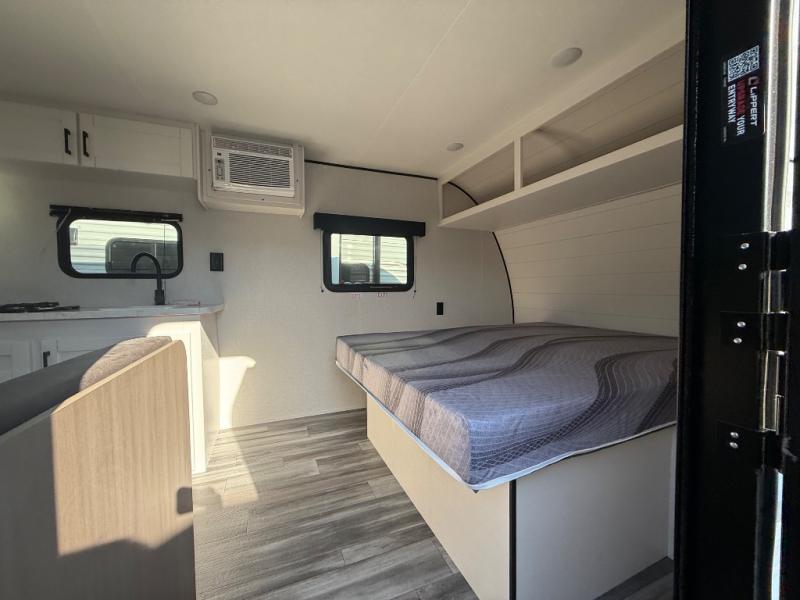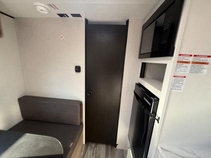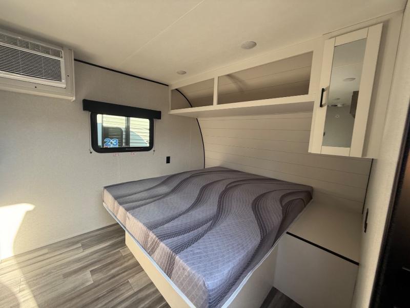 This travel trailer includes everything you need for fun trips at the lake. When you arrive at the campground, you can unload the exterior storage, then put out the 10' power awning. The booth dinette inside will provide a place to dine together, and the full rear bath with a shower will make it easier than ever to clean up after a day of hiking. A front RV queen bed will provide a great night's rest, and the overhead shelf will be perfect for books or personal belongings.
