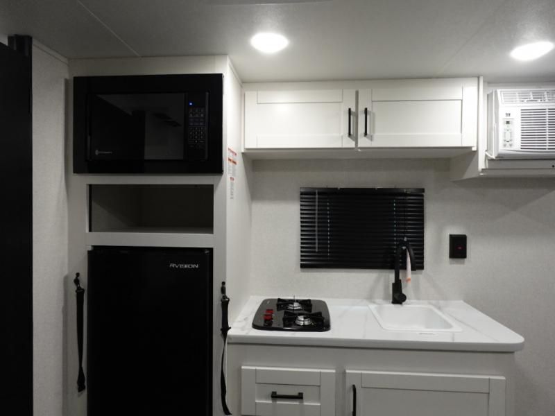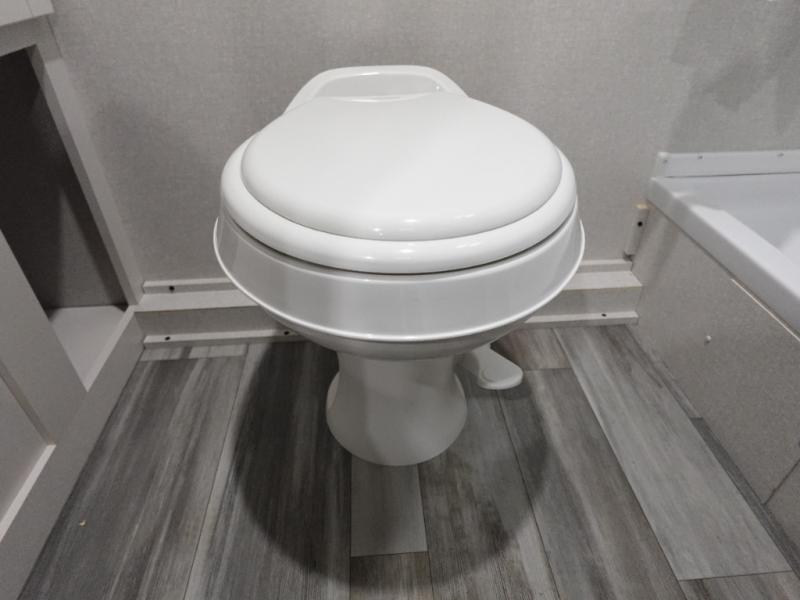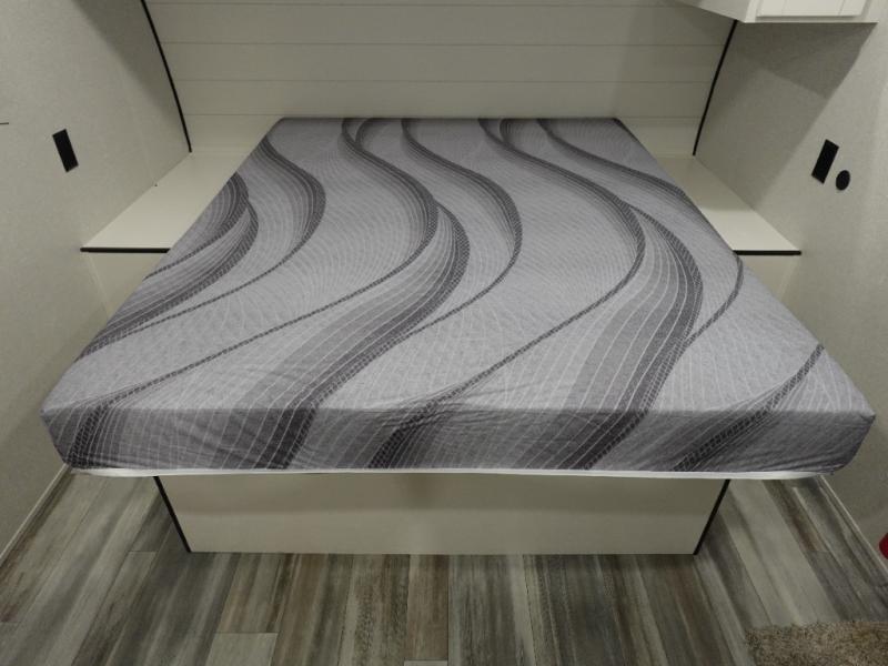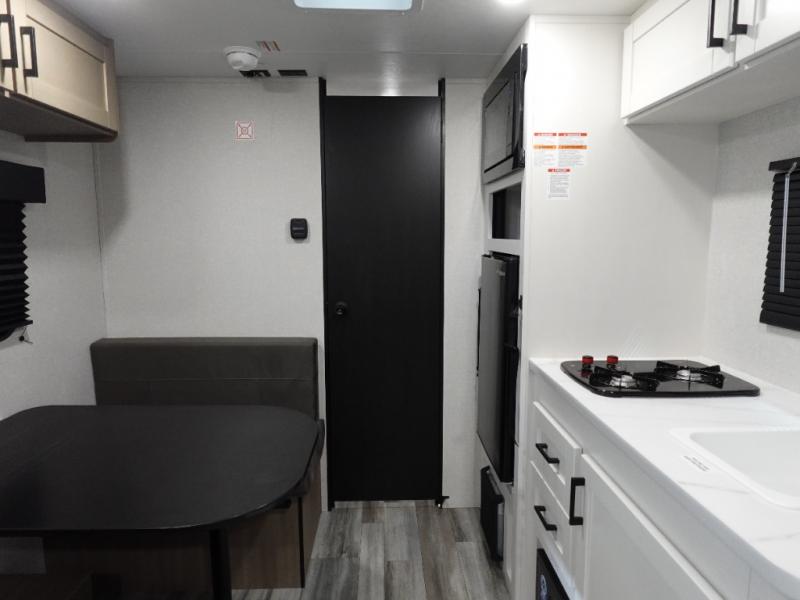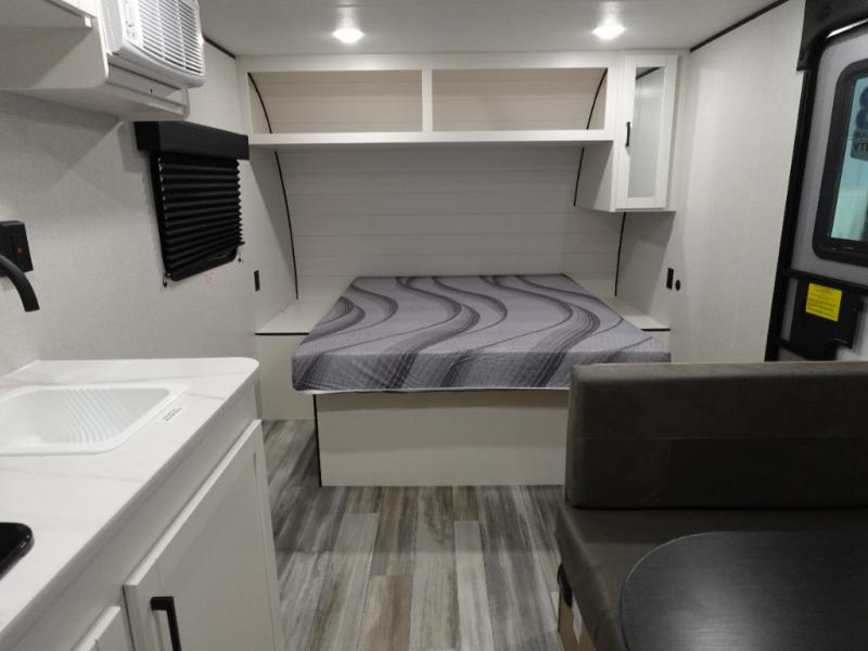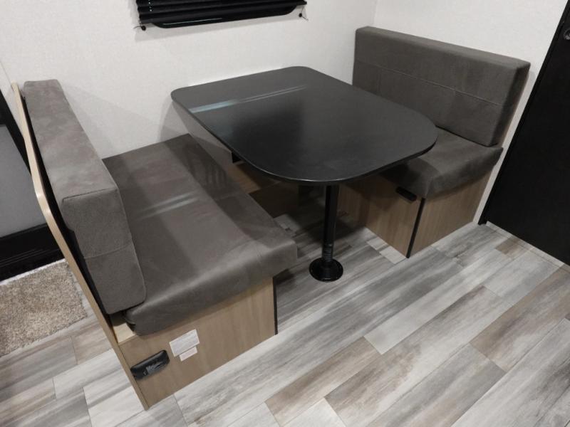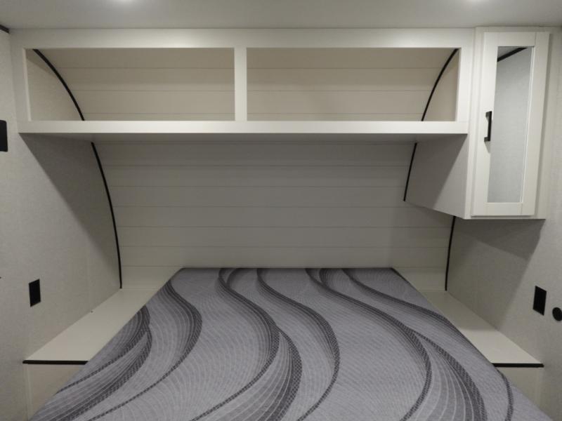 This travel trailer includes everything you need for fun trips at the lake. When you arrive at the campground, you can unload the exterior storage, then put out the 10' power awning. The booth dinette inside will provide a place to dine together, and the full rear bath with a shower will make it easier than ever to clean up after a day of hiking. A front RV queen bed will provide a great night's rest, and the overhead shelf will be perfect for books or personal belongings.