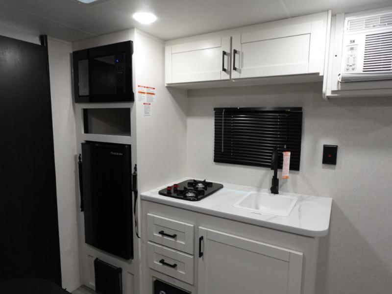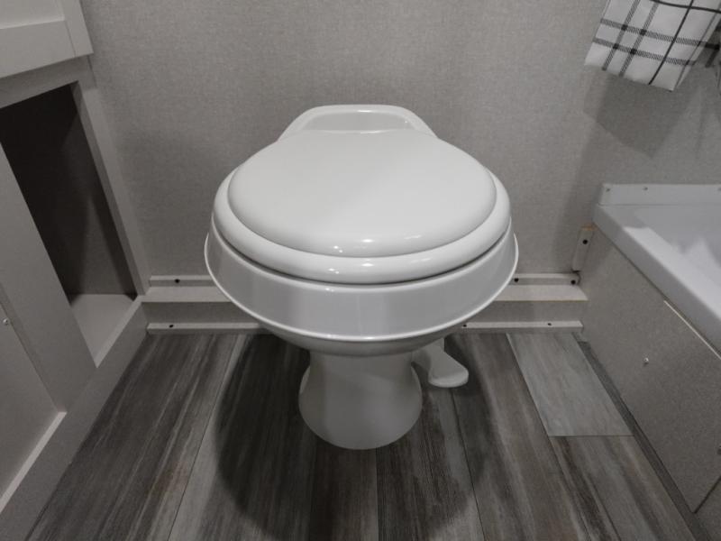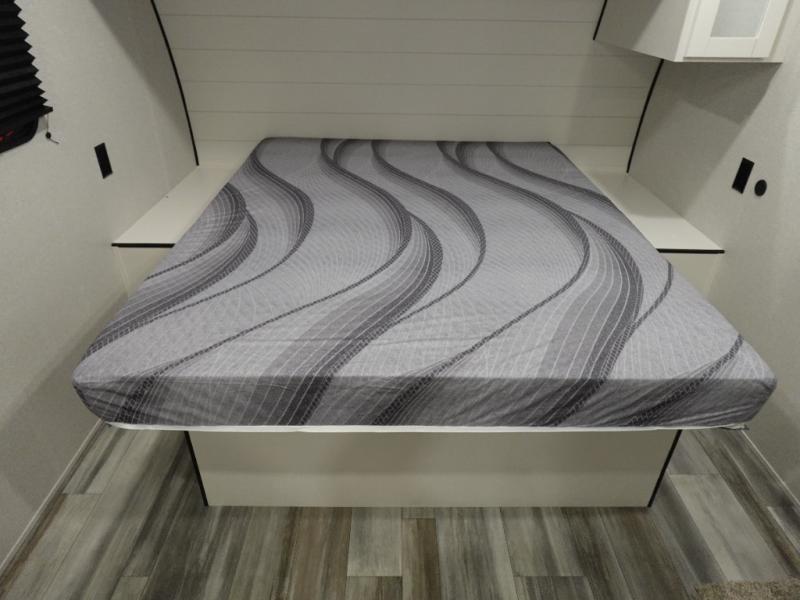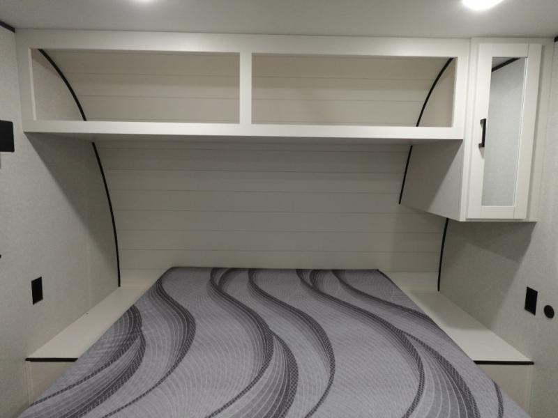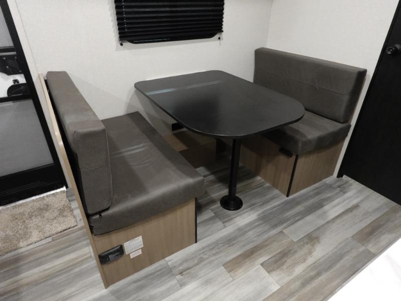 This travel trailer includes everything you need for fun trips at the lake. When you arrive at the campground, you can unload the exterior storage, then put out the 10' power awning. The booth dinette inside will provide a place to dine together, and the full rear bath with a shower will make it easier than ever to clean up after a day of hiking. A front RV queen bed will provide a great night's rest, and the overhead shelf will be perfect for books or personal belongings.
