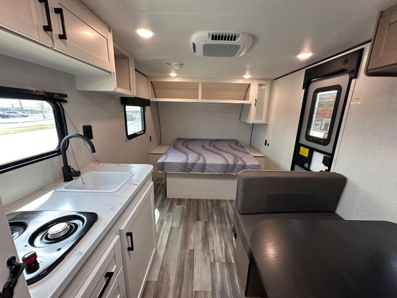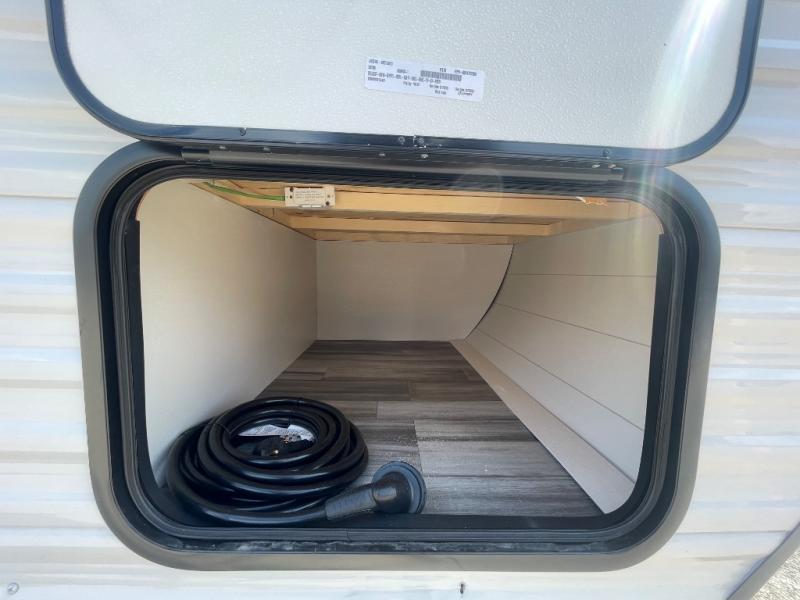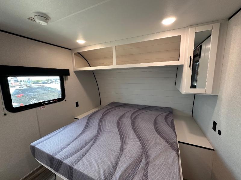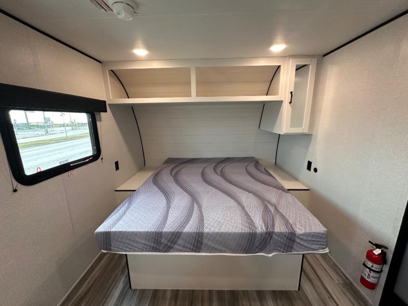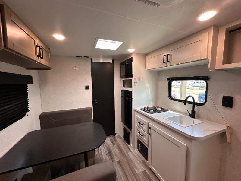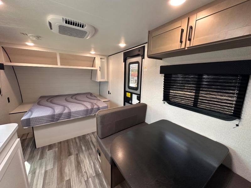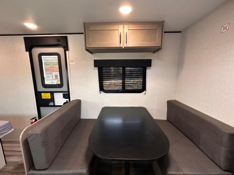 This travel trailer includes everything you need for fun trips at the lake. When you arrive at the campground, you can unload the exterior storage, then put out the 10' power awning. The booth dinette inside will provide a place to dine together, and the full rear bath with a shower will make it easier than ever to clean up after a day of hiking. A front RV queen bed will provide a great night's rest, and the overhead shelf will be perfect for books or personal belongings.