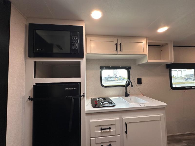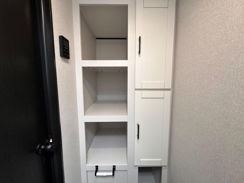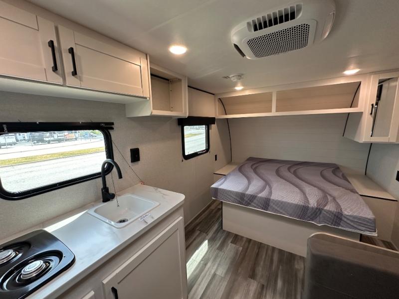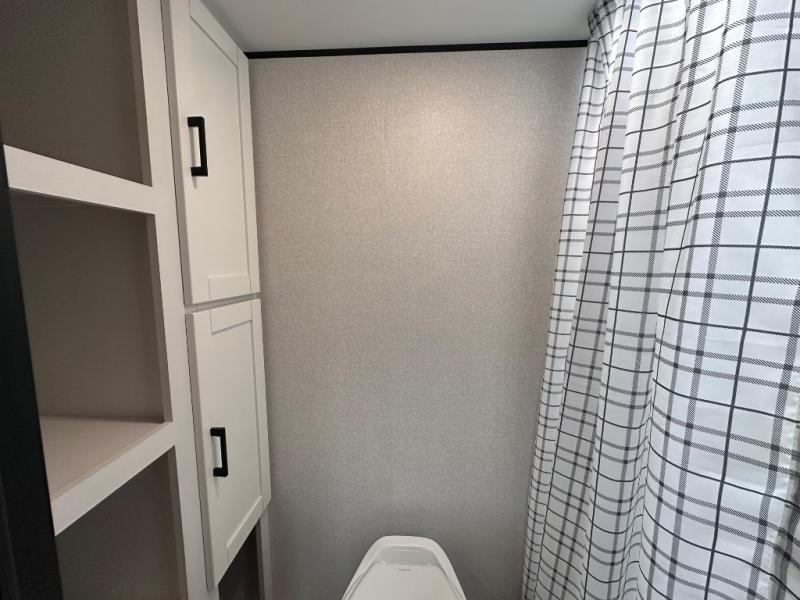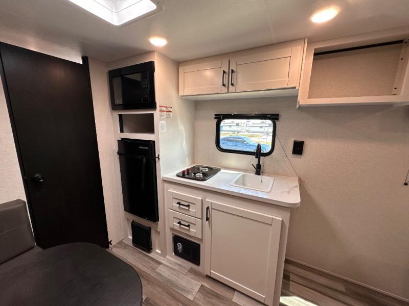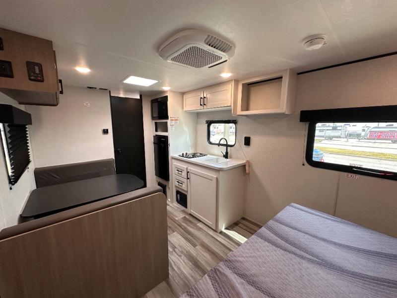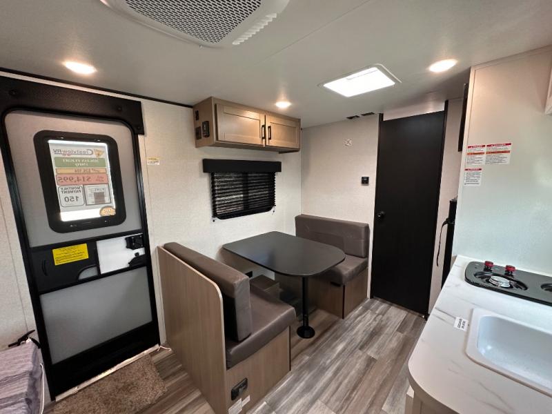 This travel trailer includes everything you need for fun trips at the lake. When you arrive at the campground, you can unload the exterior storage, then put out the 10' power awning. The booth dinette inside will provide a place to dine together, and the full rear bath with a shower will make it easier than ever to clean up after a day of hiking. A front RV queen bed will provide a great night's rest, and the overhead shelf will be perfect for books or personal belongings.