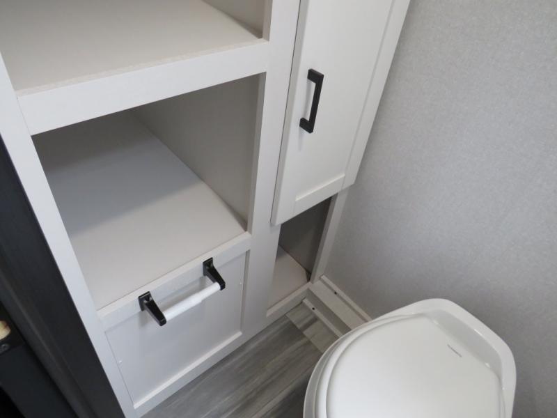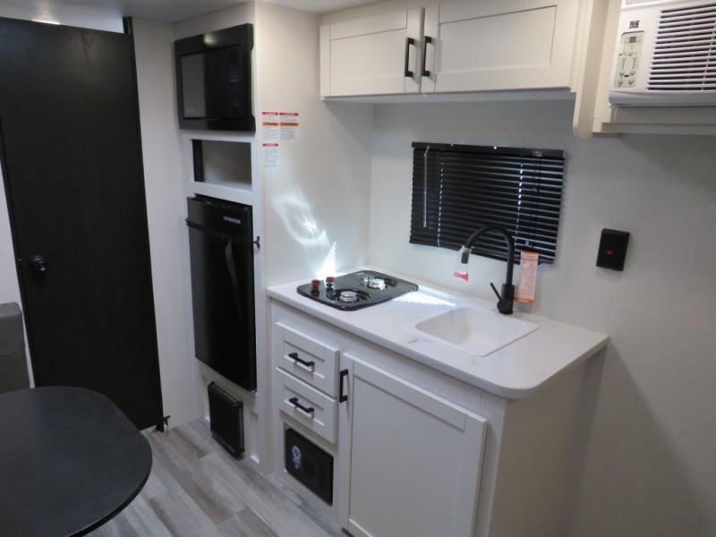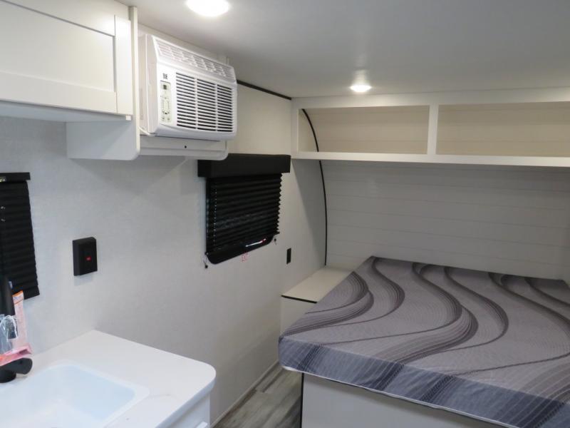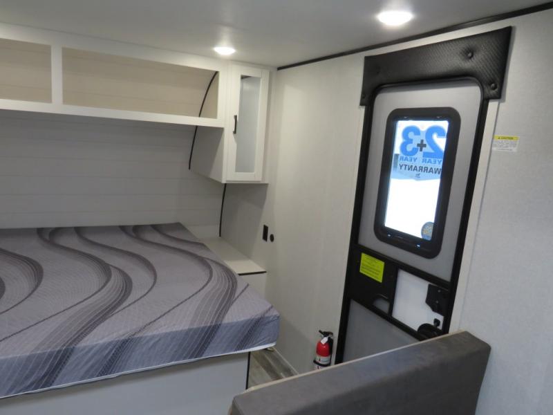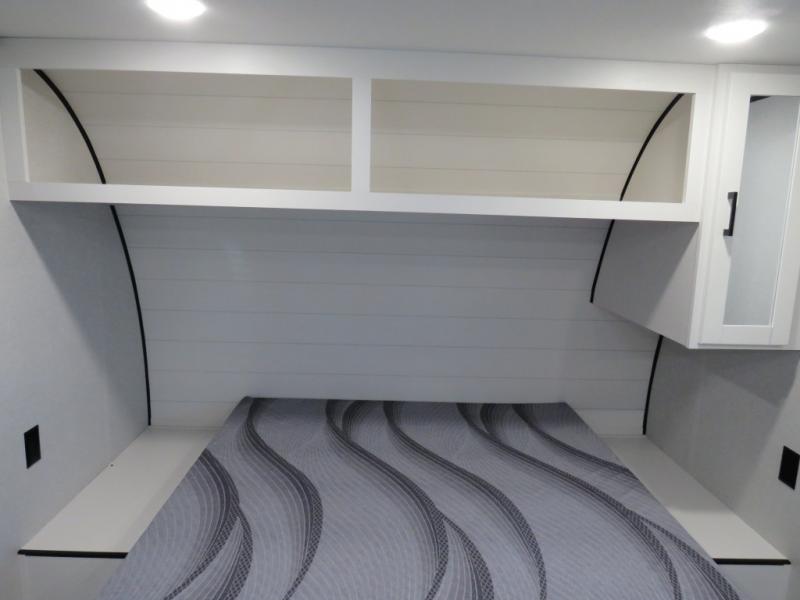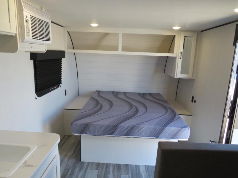 This travel trailer includes everything you need for fun trips at the lake. When you arrive at the campground, you can unload the exterior storage, then put out the 10' power awning. The booth dinette inside will provide a place to dine together, and the full rear bath with a shower will make it easier than ever to clean up after a day of hiking. A front RV queen bed will provide a great night's rest, and the overhead shelf will be perfect for books or personal belongings.