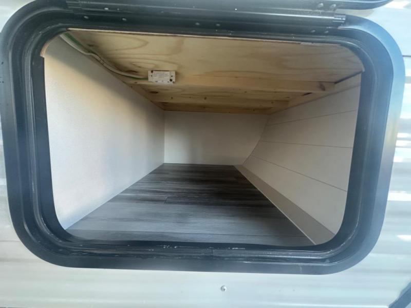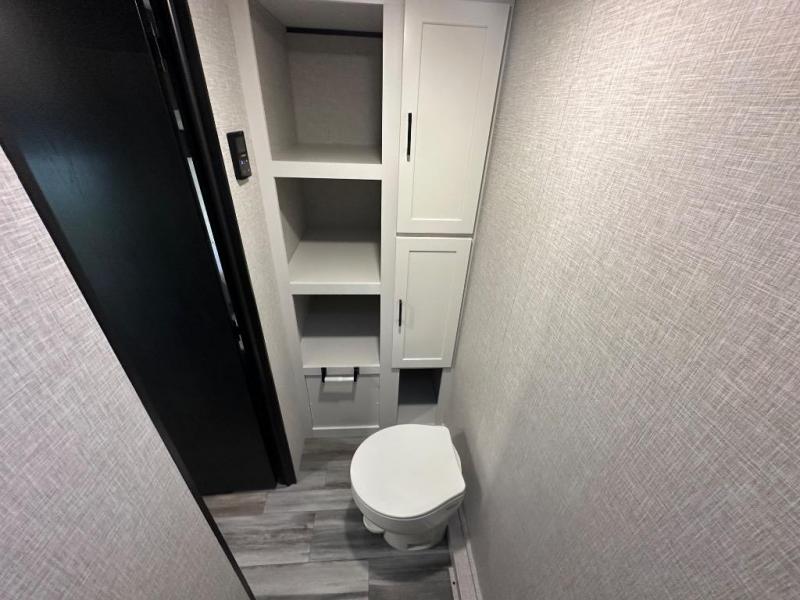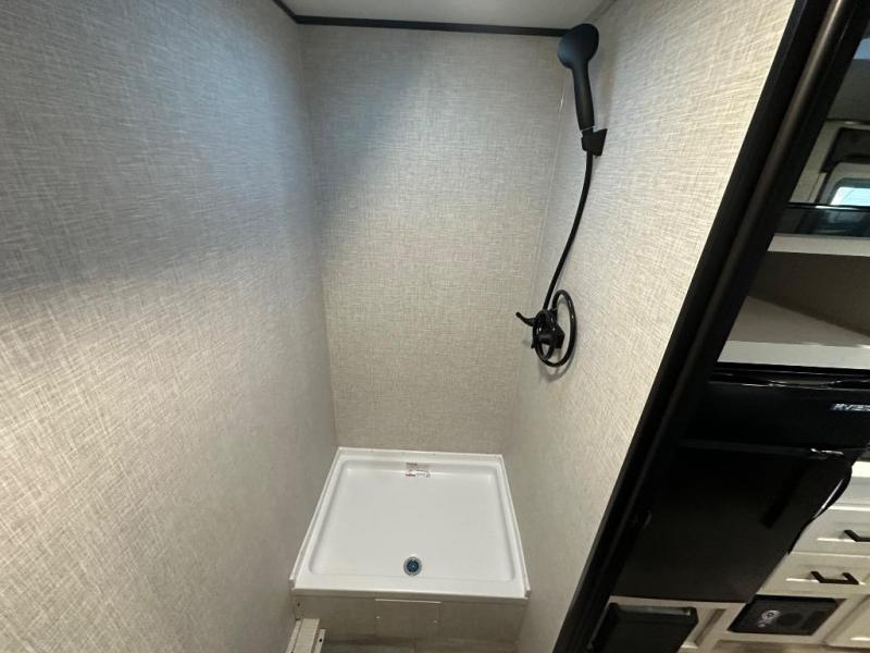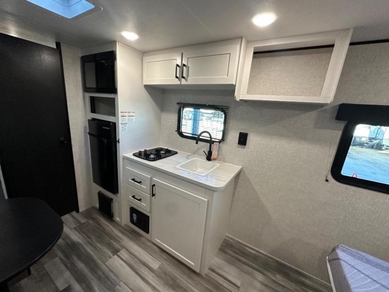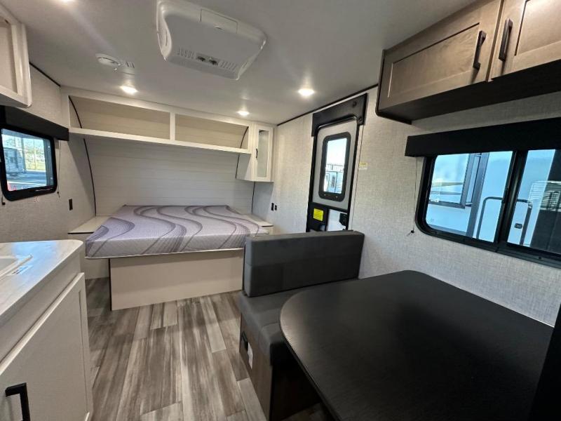 This travel trailer includes everything you need for fun trips at the lake. When you arrive at the campground, you can unload the exterior storage, then put out the 10' power awning. The booth dinette inside will provide a place to dine together, and the full rear bath with a shower will make it easier than ever to clean up after a day of hiking. A front RV queen bed will provide a great night's rest, and the overhead shelf will be perfect for books or personal belongings.