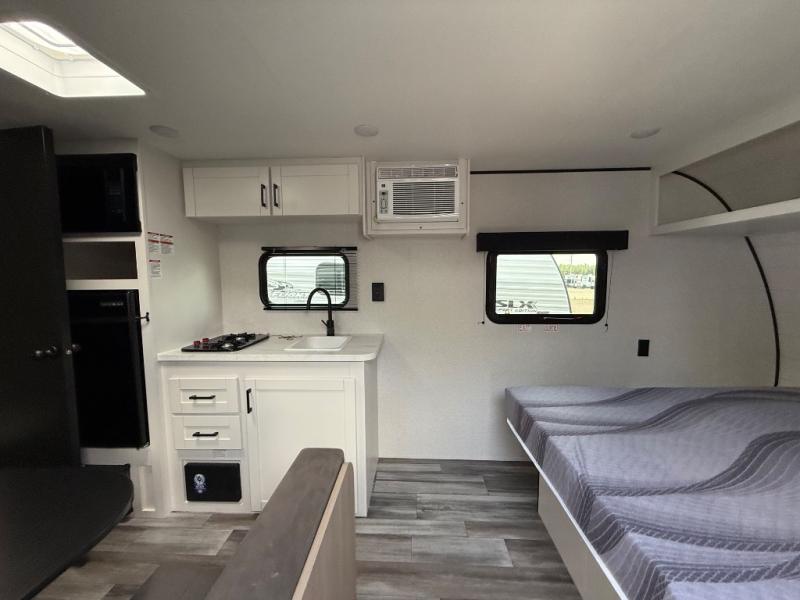 The Jayco Jay Flight SLX travel trailer is quite easy to own because it is lightweight for an easier towing experience. Built on a fully integrated A-frame with galvanized-steel, impact-resistant wheel wells, the Jay Flight SLX has quality at its very foundation. That quality continues on to the electric self-adjusting brakes, easy-lube hubs, Magnum Truss roof system, and LP quick connect. Some of what the mandatory Customer Value Package includes is backup camera prep, Keyed-Alike entry and baggage doors, and an on-demand tankless water heater.