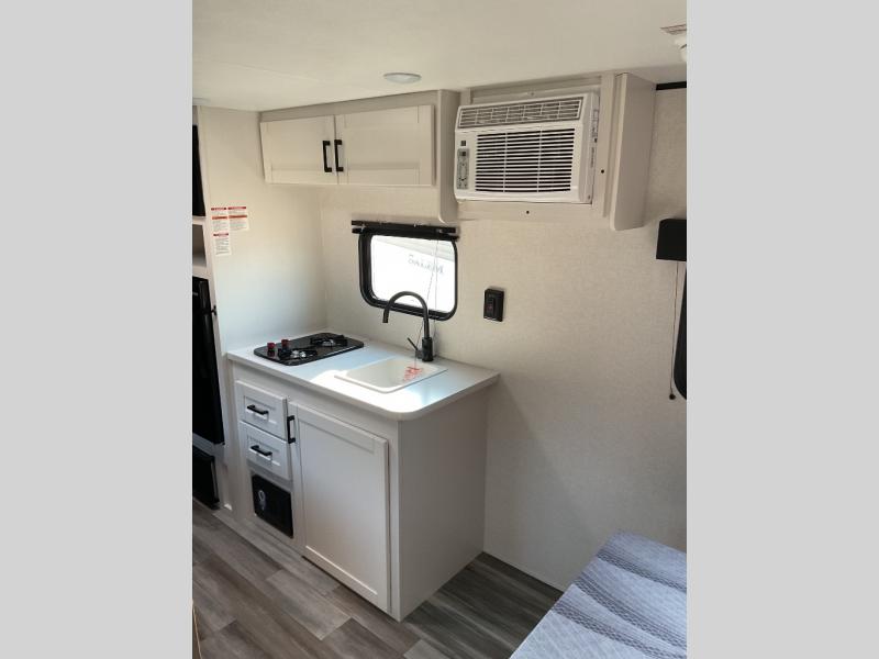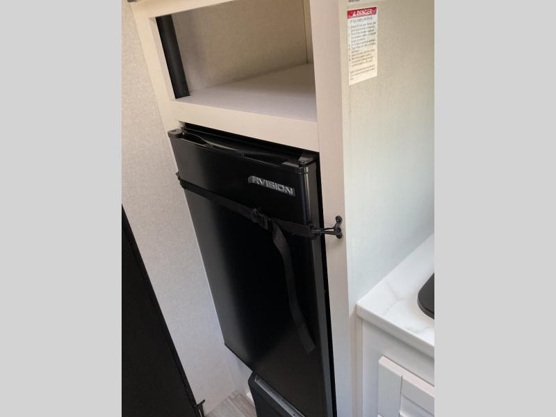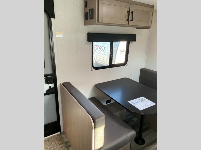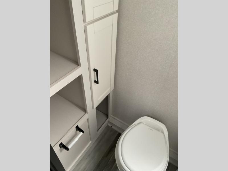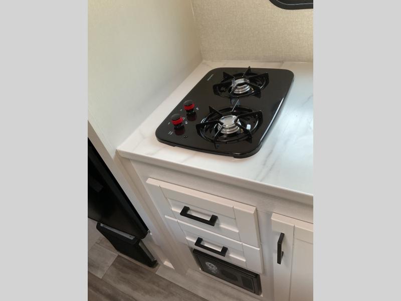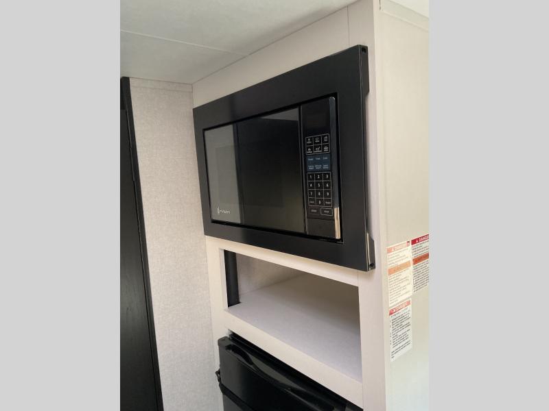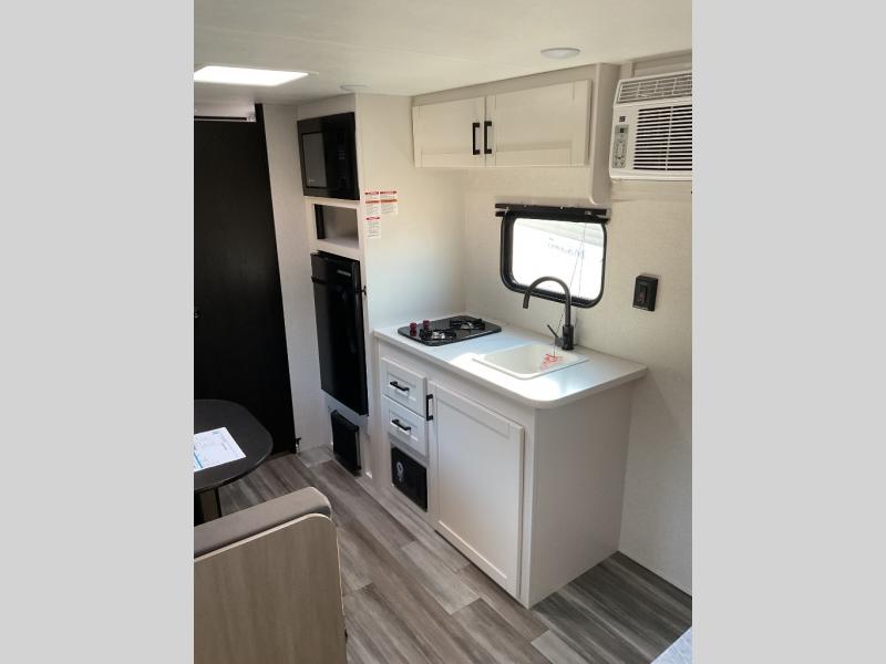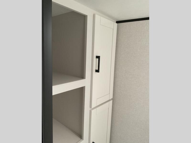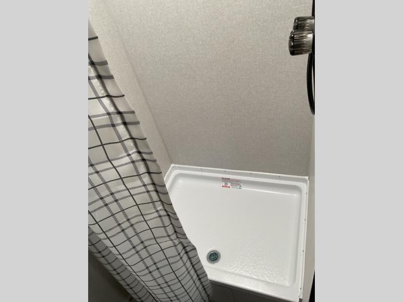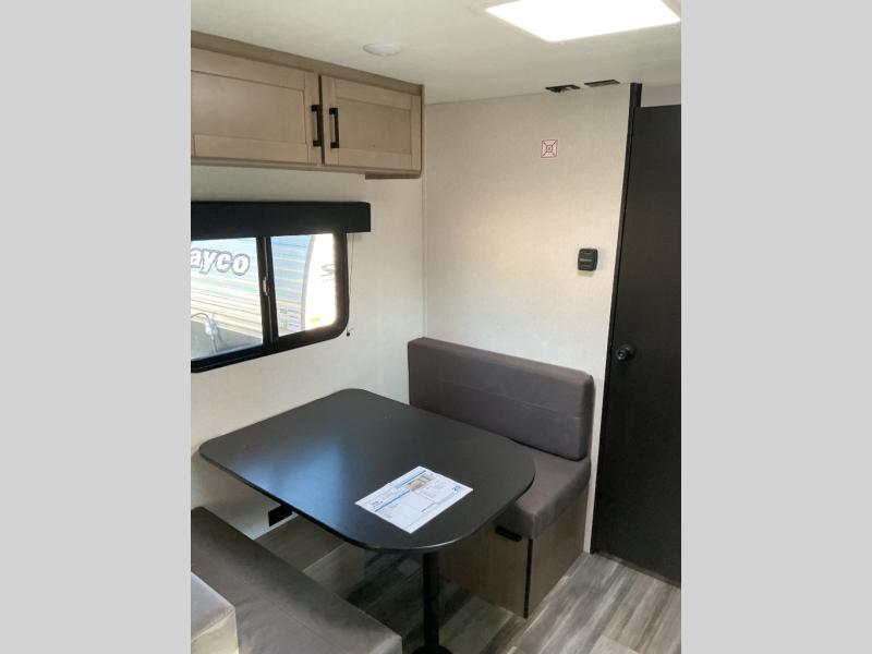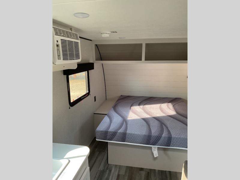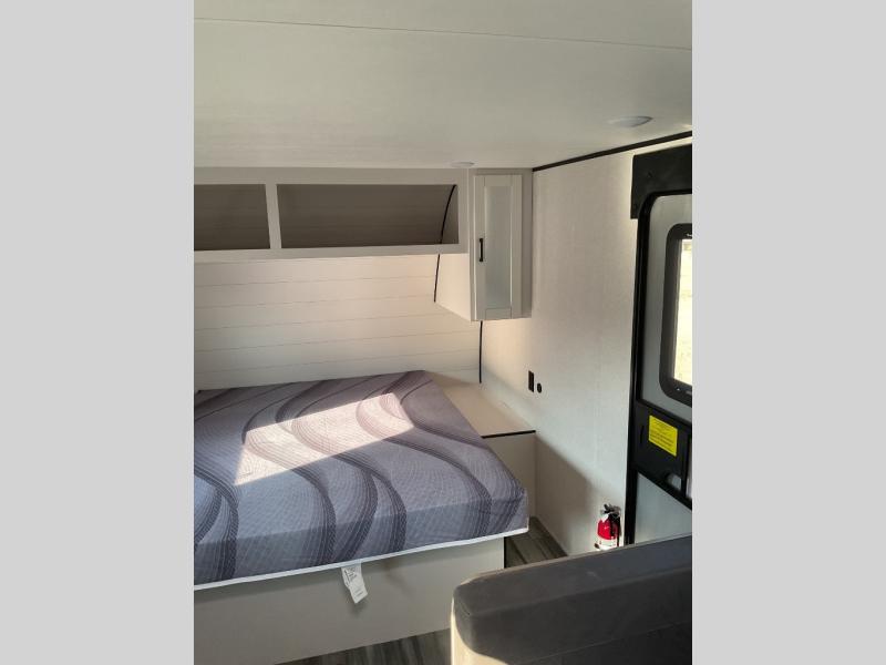 This travel trailer includes everything you need for fun trips at the lake. When you arrive at the campground, you can unload the exterior storage, then put out the 10' power awning. The booth dinette inside will provide a place to dine together, and the full rear bath with a shower will make it easier than ever to clean up after a day of hiking. A front RV queen bed will provide a great night's rest, and the overhead shelf will be perfect for books or personal belongings.