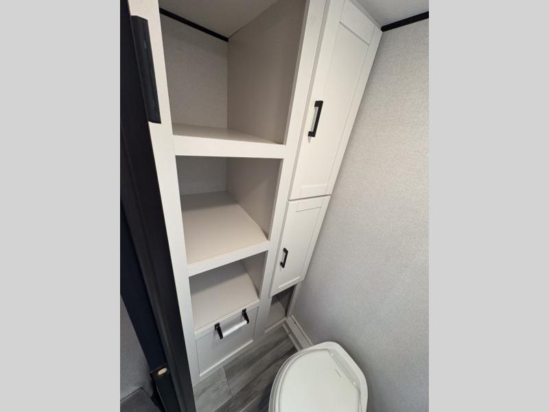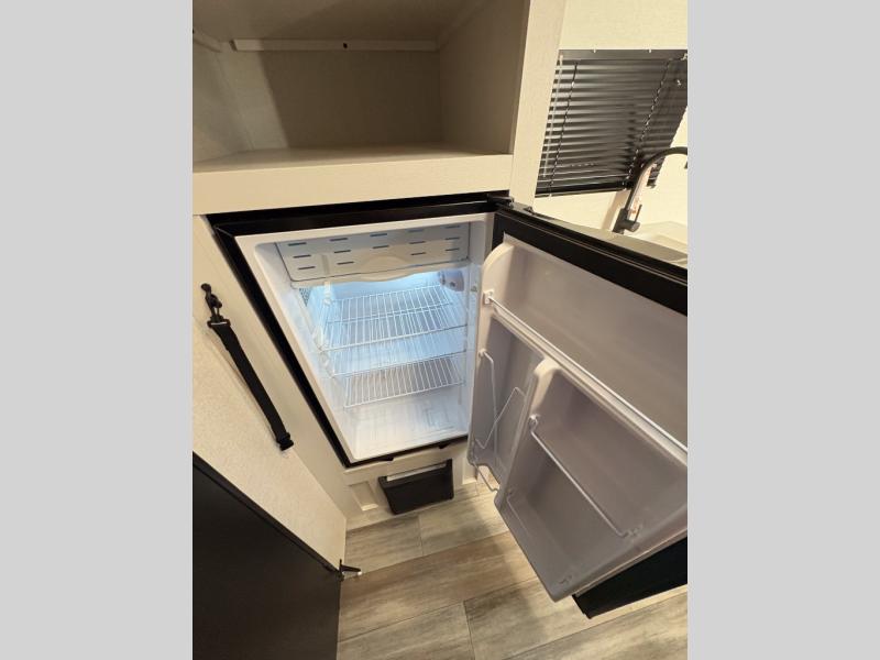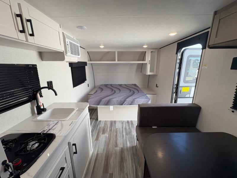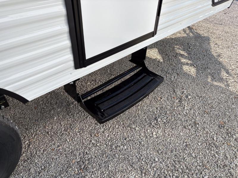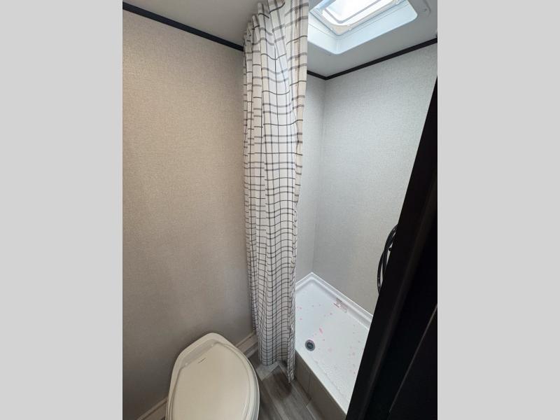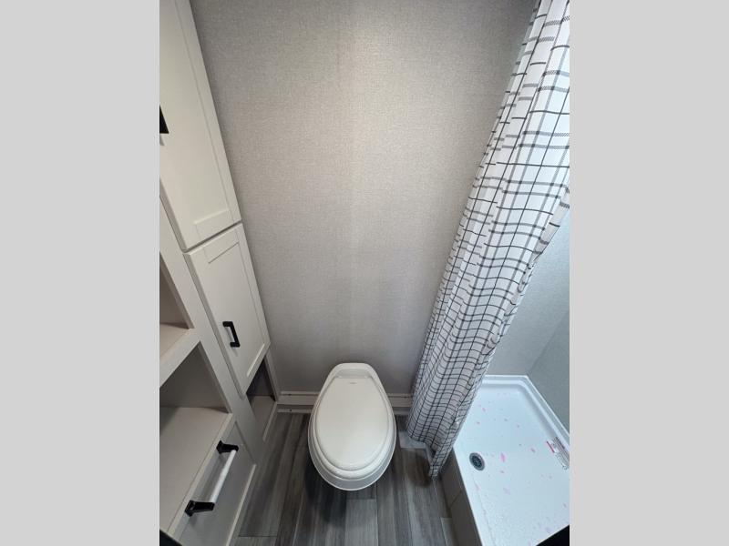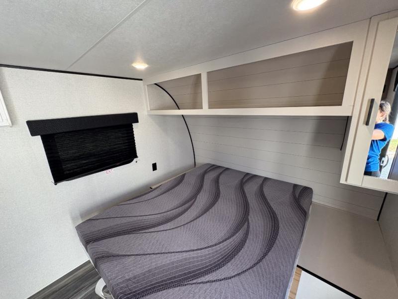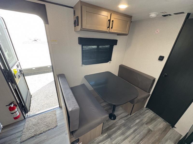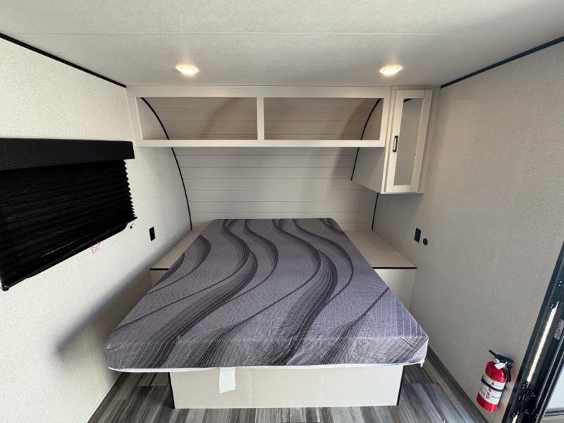 This travel trailer includes everything you need for fun trips at the lake. When you arrive at the campground, you can unload the exterior storage, then put out the 10' power awning. The booth dinette inside will provide a place to dine together, and the full rear bath with a shower will make it easier than ever to clean up after a day of hiking. A front RV queen bed will provide a great night's rest, and the overhead shelf will be perfect for books or personal belongings.