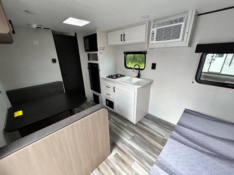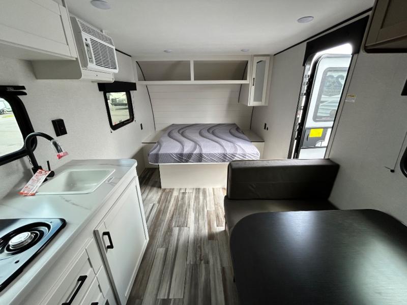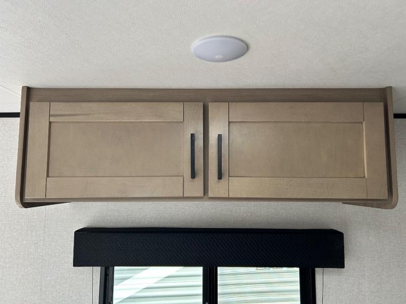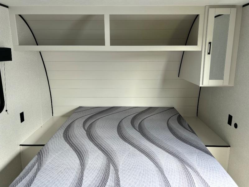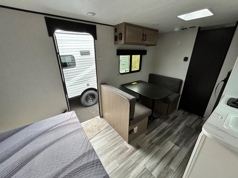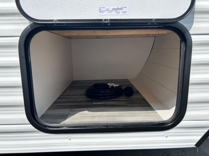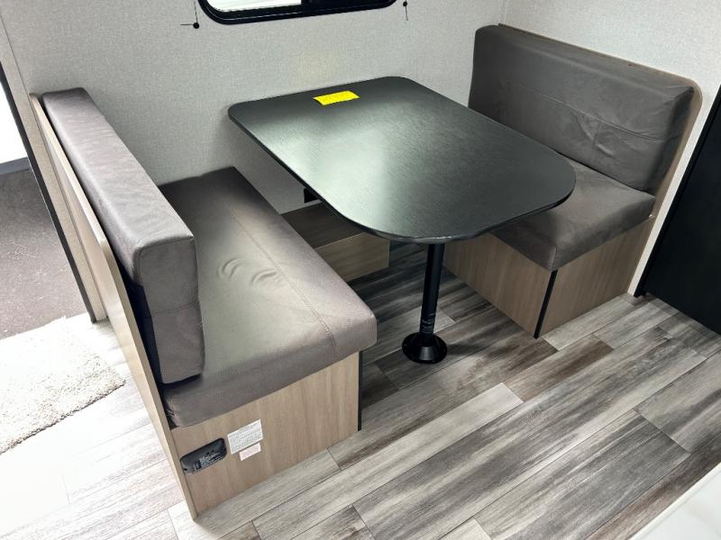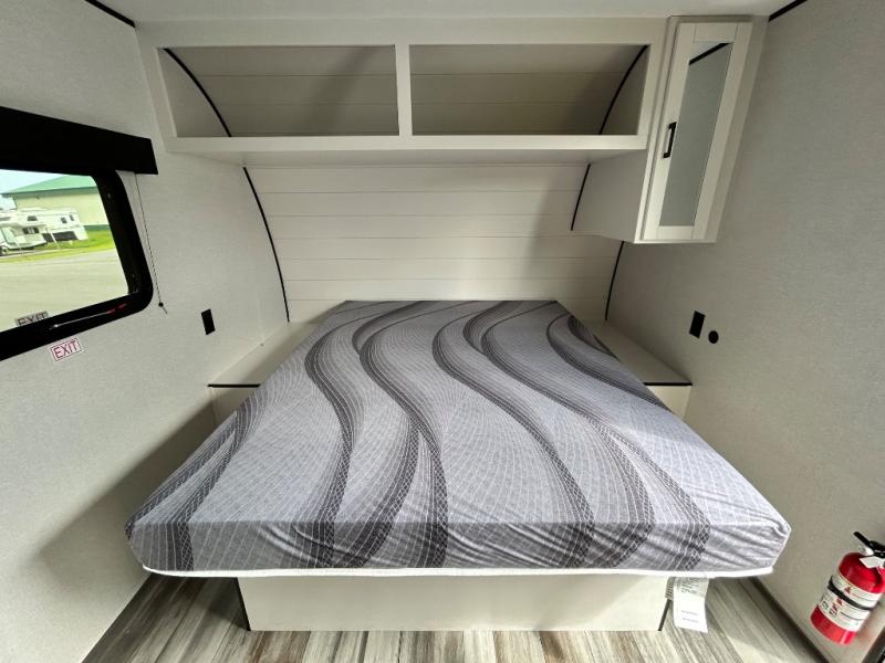 This travel trailer includes everything you need for fun trips at the lake. When you arrive at the campground, you can unload the exterior storage, then put out the 10' power awning. The booth dinette inside will provide a place to dine together, and the full rear bath with a shower will make it easier than ever to clean up after a day of hiking. A front RV queen bed will provide a great night's rest, and the overhead shelf will be perfect for books or personal belongings.