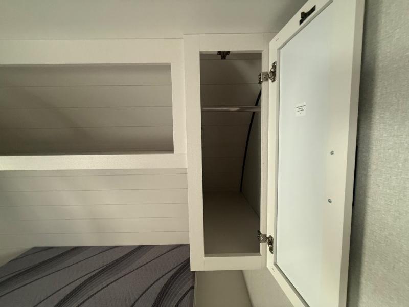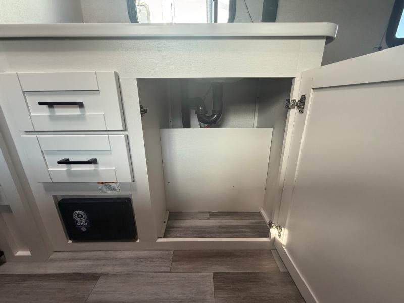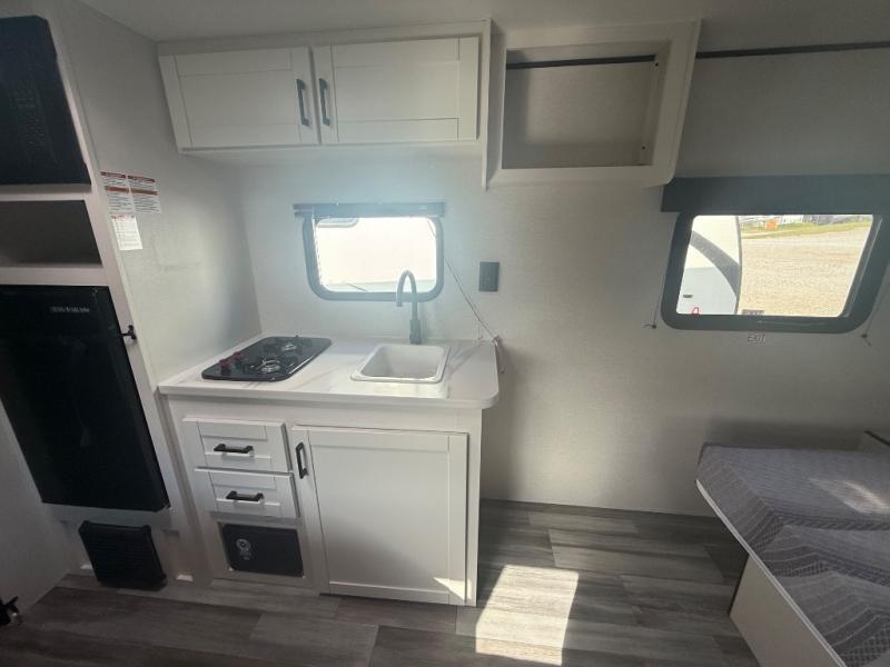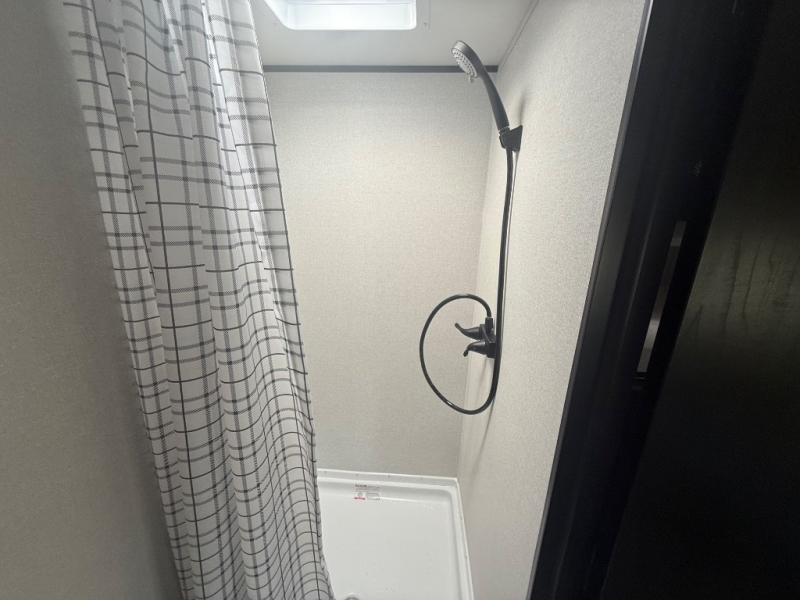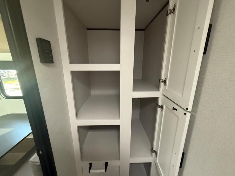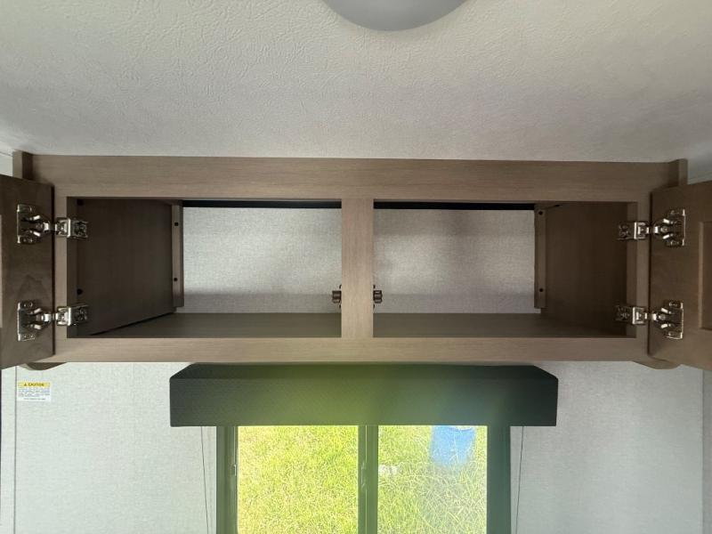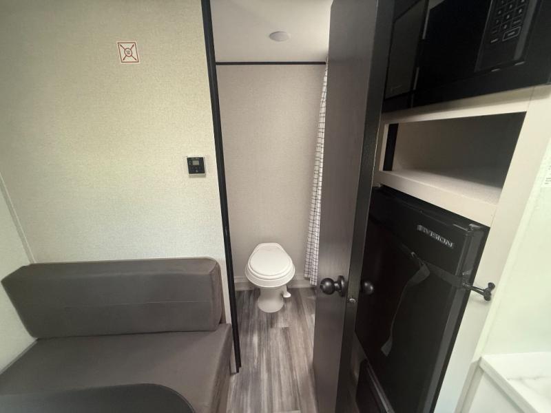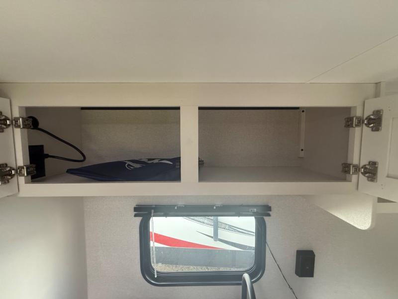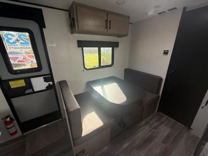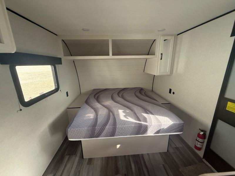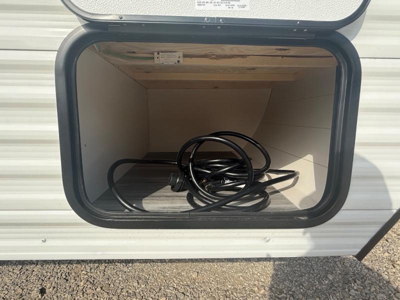This travel trailer includes everything you need for fun trips at the lake. When you arrive at the campground, you can unload the exterior storage, then put out the 10' power awning. The booth dinette inside will provide a place to dine together, and the full rear bath with a shower will make it easier than ever to clean up after a day of hiking. A front RV queen bed will provide a great night's rest, and the overhead shelf will be perfect for books or personal belongings.