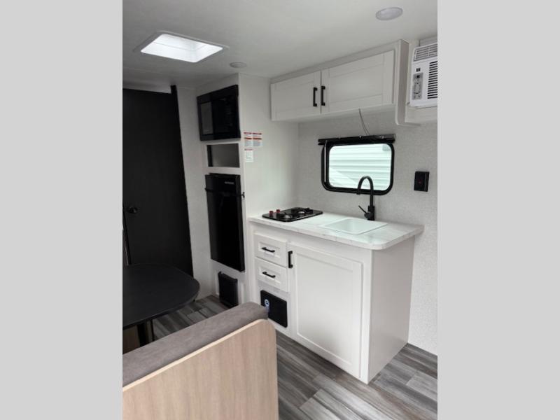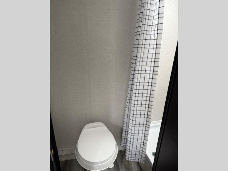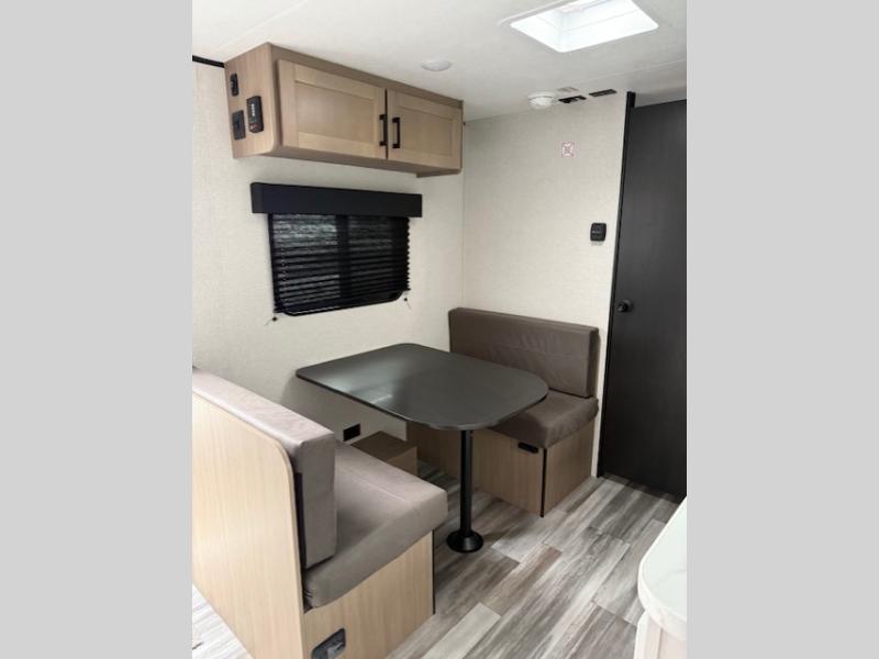 This travel trailer includes everything you need for fun trips at the lake. When you arrive at the campground, you can unload the exterior storage, then put out the 10' power awning. The booth dinette inside will provide a place to dine together, and the full rear bath with a shower will make it easier than ever to clean up after a day of hiking. A front RV queen bed will provide a great night's rest, and the overhead shelf will be perfect for books or personal belongings.