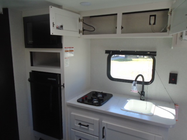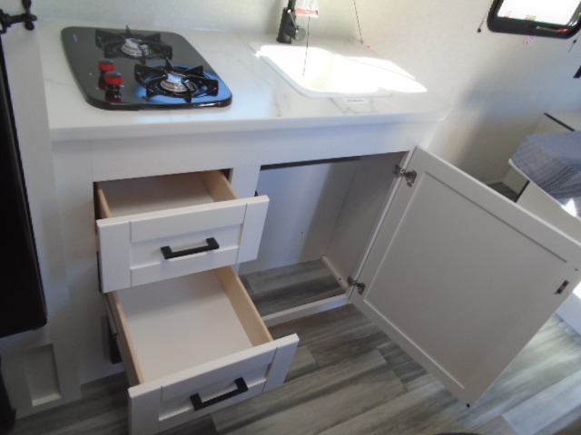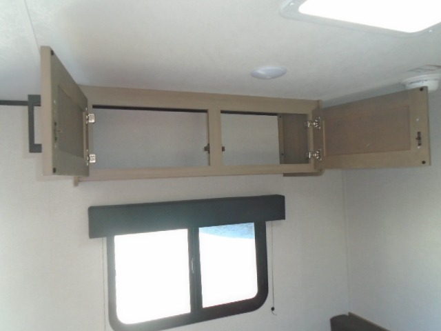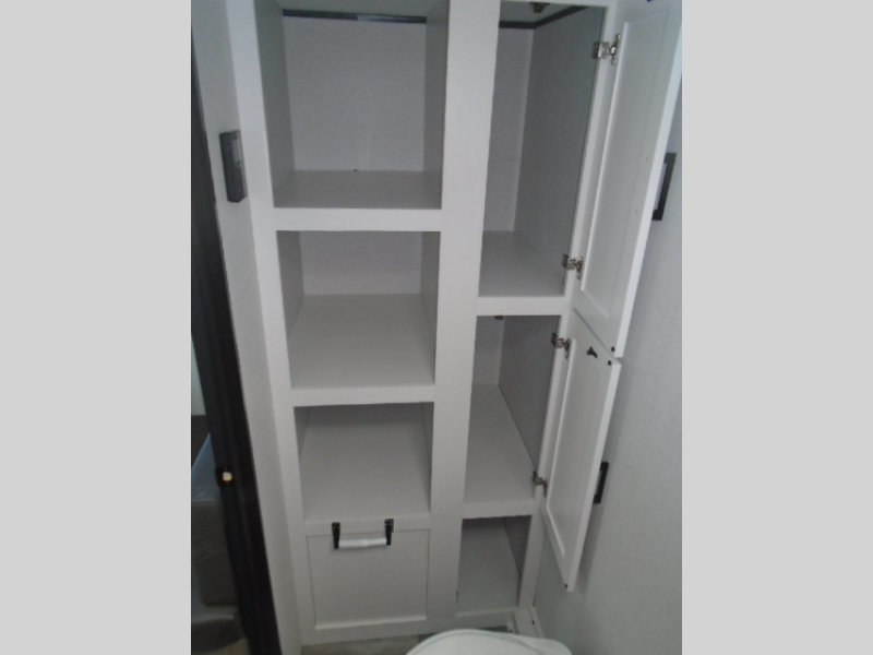 This travel trailer includes everything you need for fun trips at the lake. When you arrive at the campground, you can unload the exterior storage, then put out the 10' power awning. The booth dinette inside will provide a place to dine together, and the full rear bath with a shower will make it easier than ever to clean up after a day of hiking. A front RV queen bed will provide a great night's rest, and the overhead shelf will be perfect for books or personal belongings.