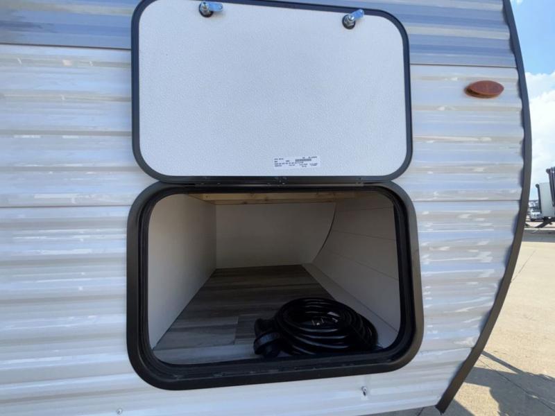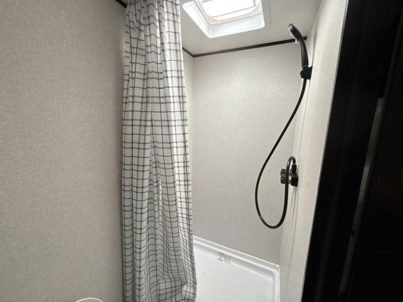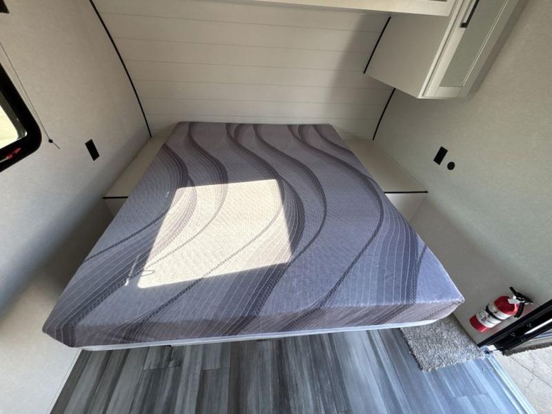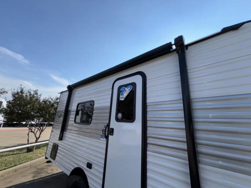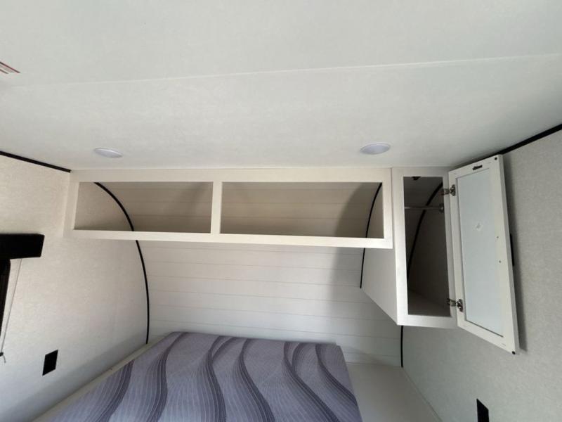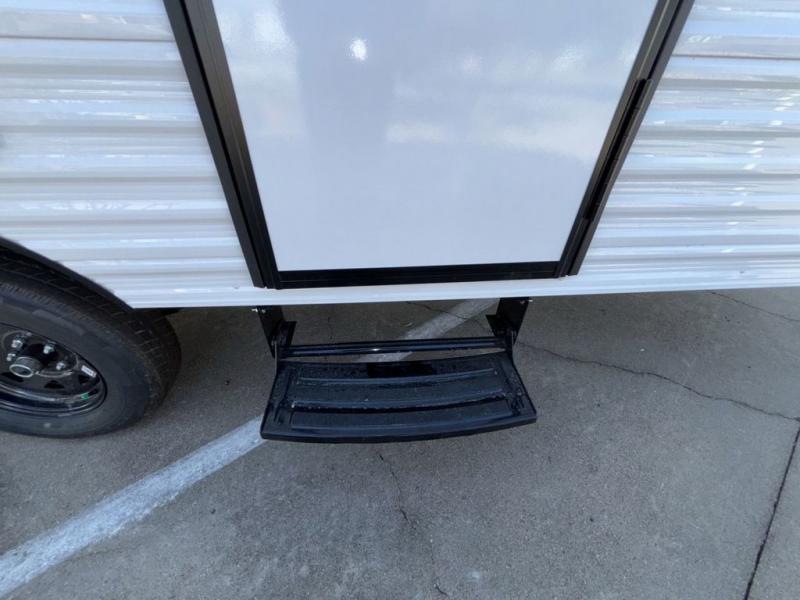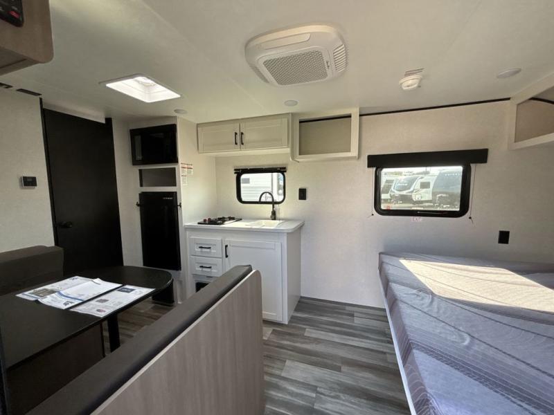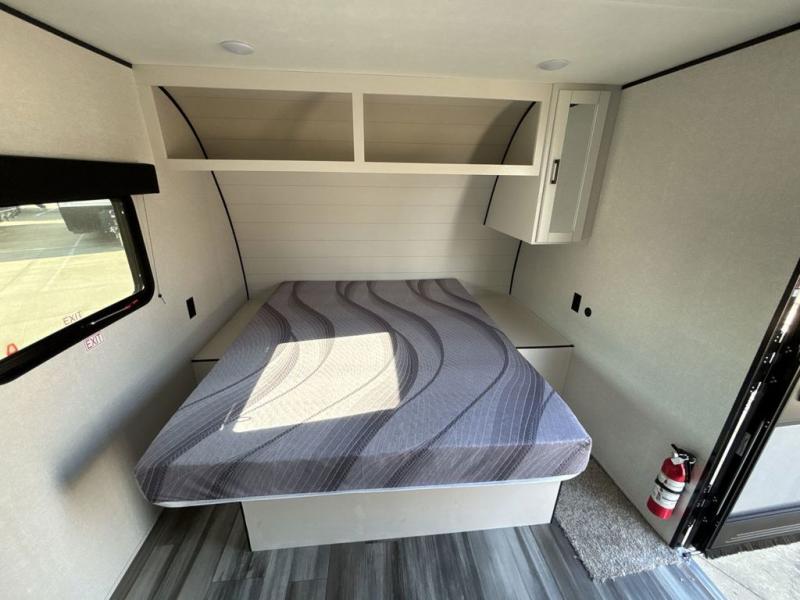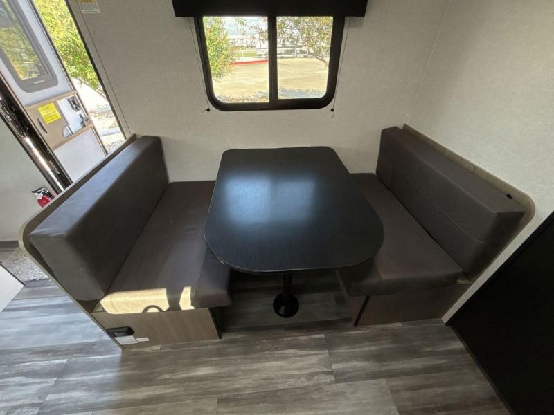 This travel trailer includes everything you need for fun trips at the lake. When you arrive at the campground, you can unload the exterior storage, then put out the 10' power awning. The booth dinette inside will provide a place to dine together, and the full rear bath with a shower will make it easier than ever to clean up after a day of hiking. A front RV queen bed will provide a great night's rest, and the overhead shelf will be perfect for books or personal belongings.