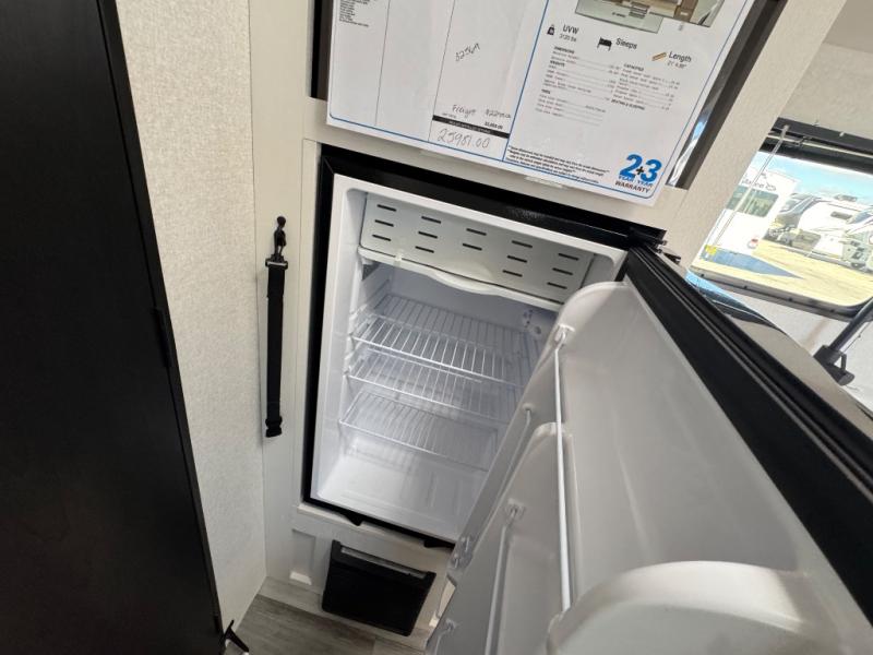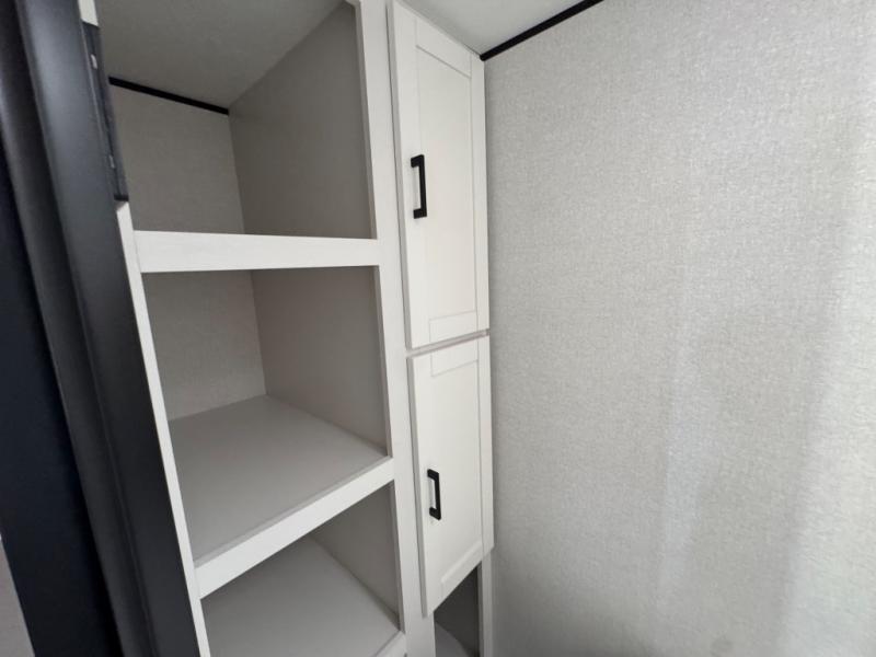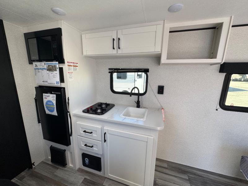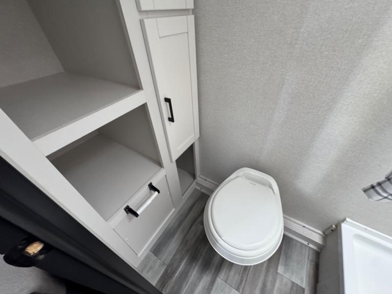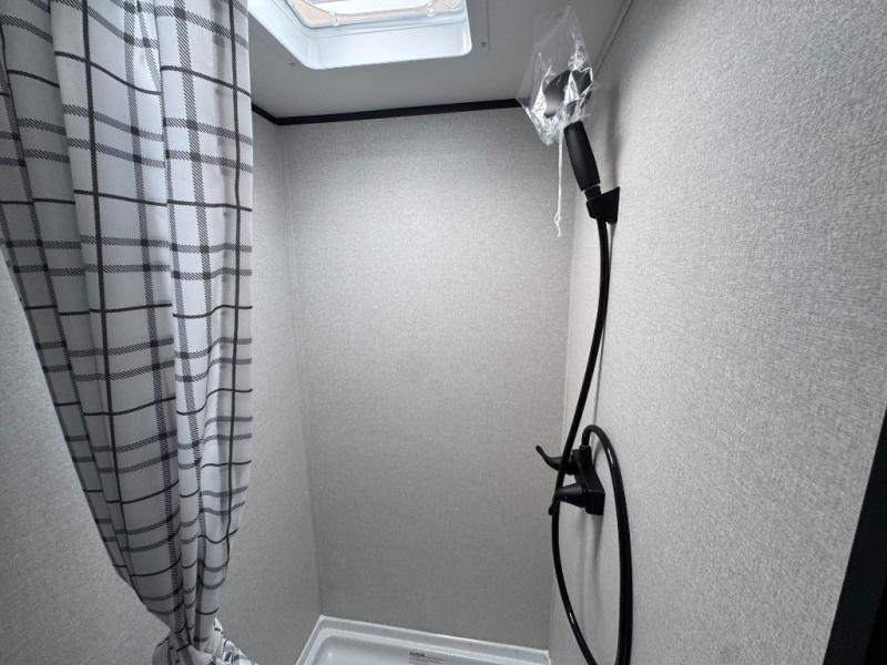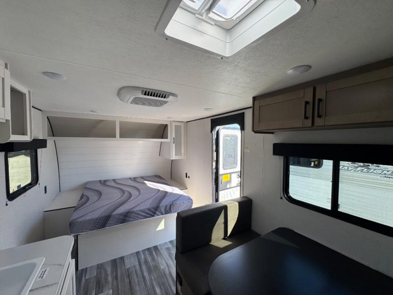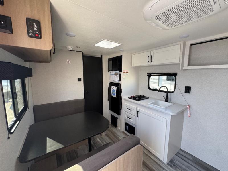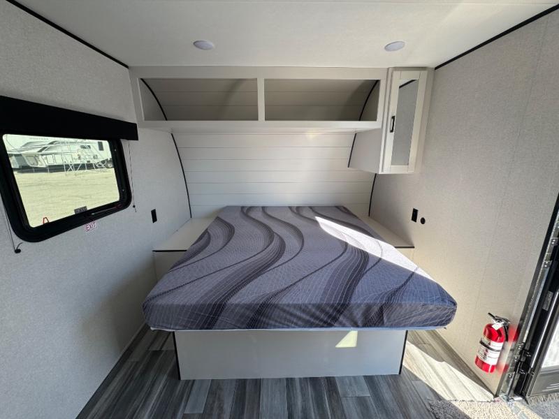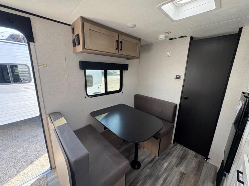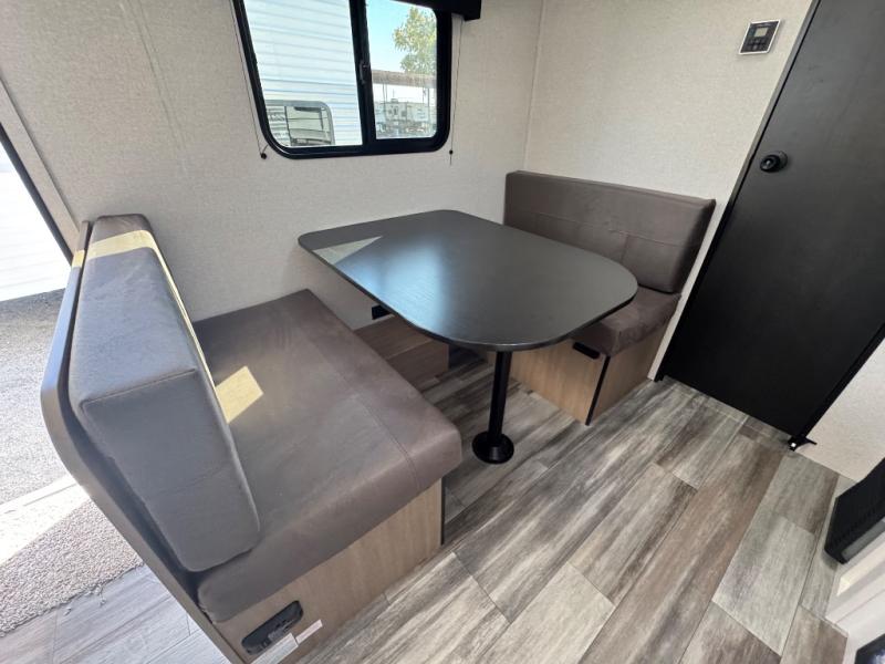 This travel trailer includes everything you need for fun trips at the lake. When you arrive at the campground, you can unload the exterior storage, then put out the 10' power awning. The booth dinette inside will provide a place to dine together, and the full rear bath with a shower will make it easier than ever to clean up after a day of hiking. A front RV queen bed will provide a great night's rest, and the overhead shelf will be perfect for books or personal belongings.