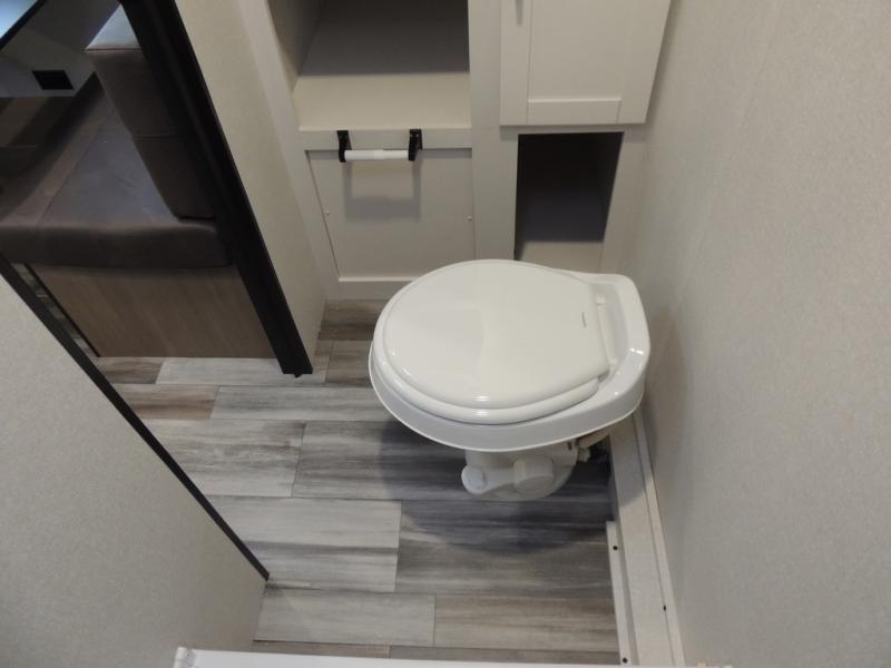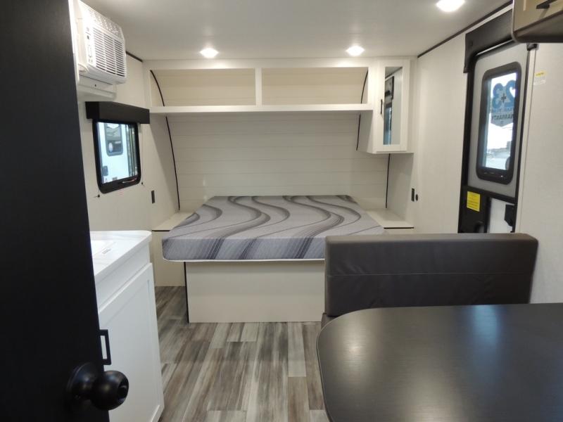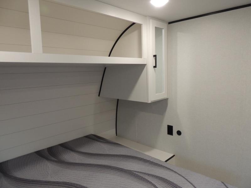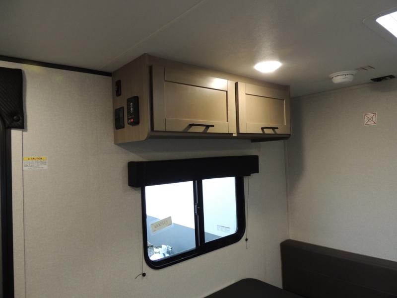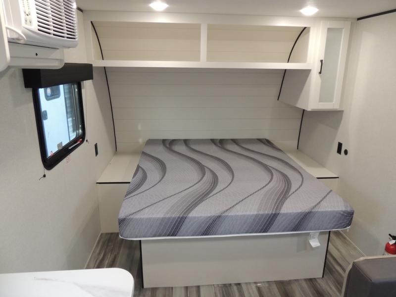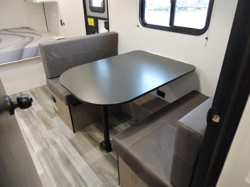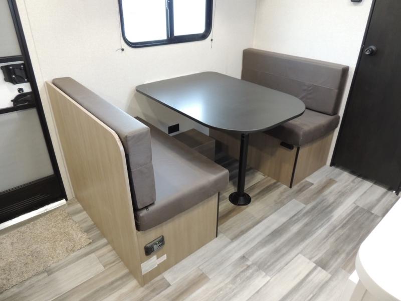 This travel trailer includes everything you need for fun trips at the lake. When you arrive at the campground, you can unload the exterior storage, then put out the 10' power awning. The booth dinette inside will provide a place to dine together, and the full rear bath with a shower will make it easier than ever to clean up after a day of hiking. A front RV queen bed will provide a great night's rest, and the overhead shelf will be perfect for books or personal belongings.