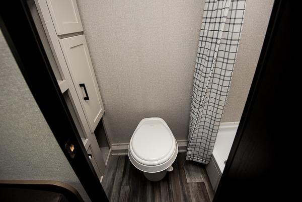This travel trailer includes everything you need for fun trips at the lake. When you arrive at the campground, you can unload the exterior storage, then put out the 10' power awning. The booth dinette inside will provide a place to dine together, and the full rear bath with a shower will make it easier than ever to clean up after a day of hiking. A front RV queen bed will provide a great night's rest, and the overhead shelf will be perfect for books or personal belongings.