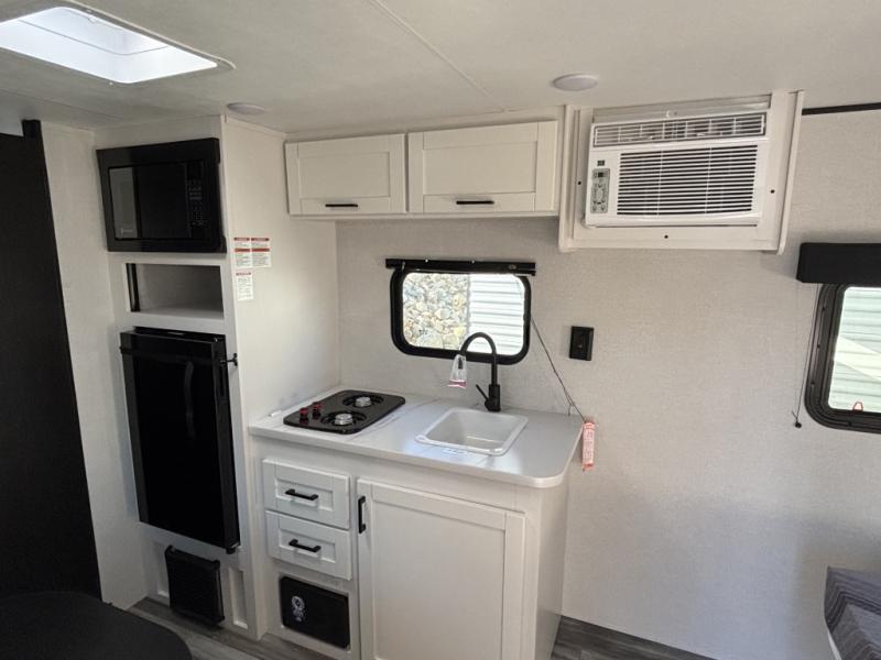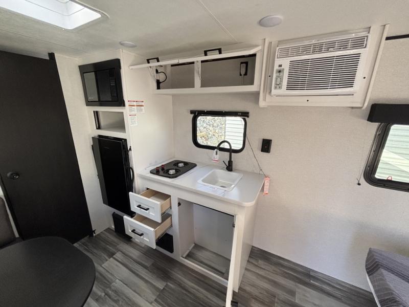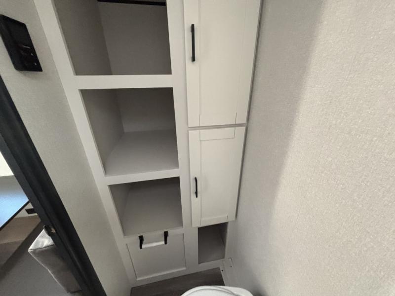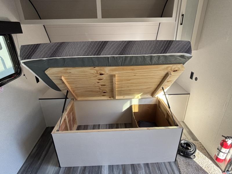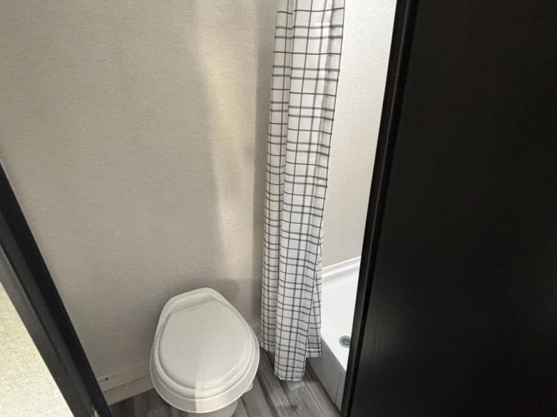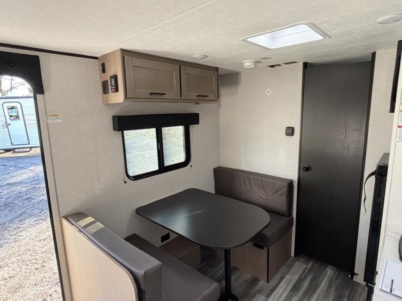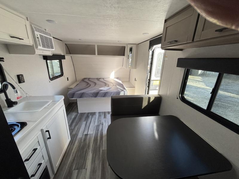 This travel trailer includes everything you need for fun trips at the lake. When you arrive at the campground, you can unload the exterior storage, then put out the 10' power awning. The booth dinette inside will provide a place to dine together, and the full rear bath with a shower will make it easier than ever to clean up after a day of hiking. A front RV queen bed will provide a great night's rest, and the overhead shelf will be perfect for books or personal belongings.