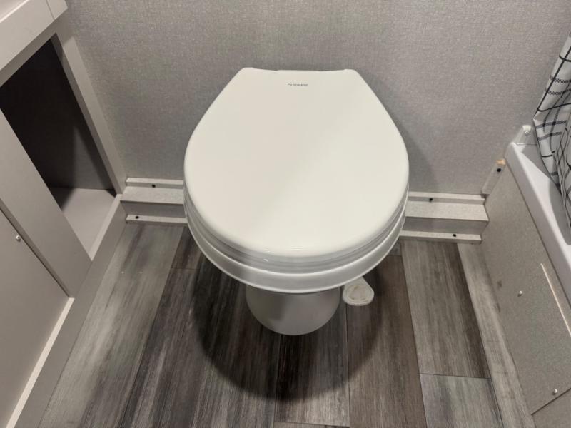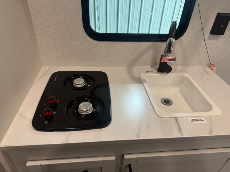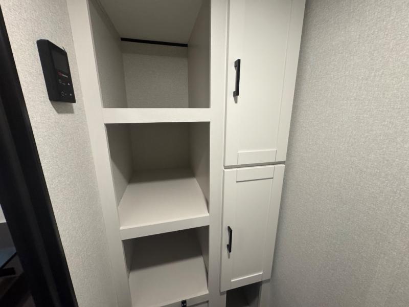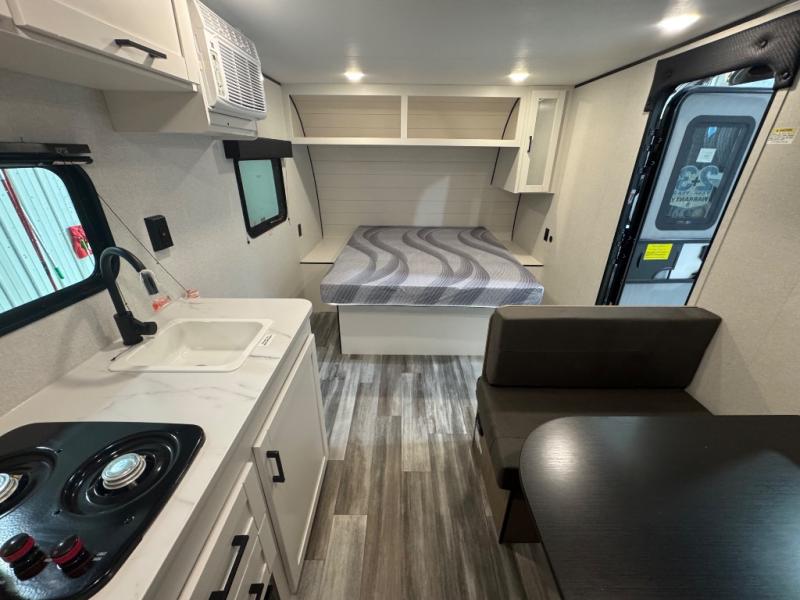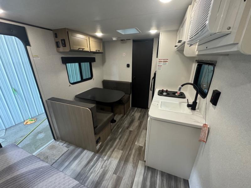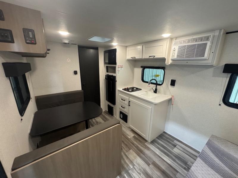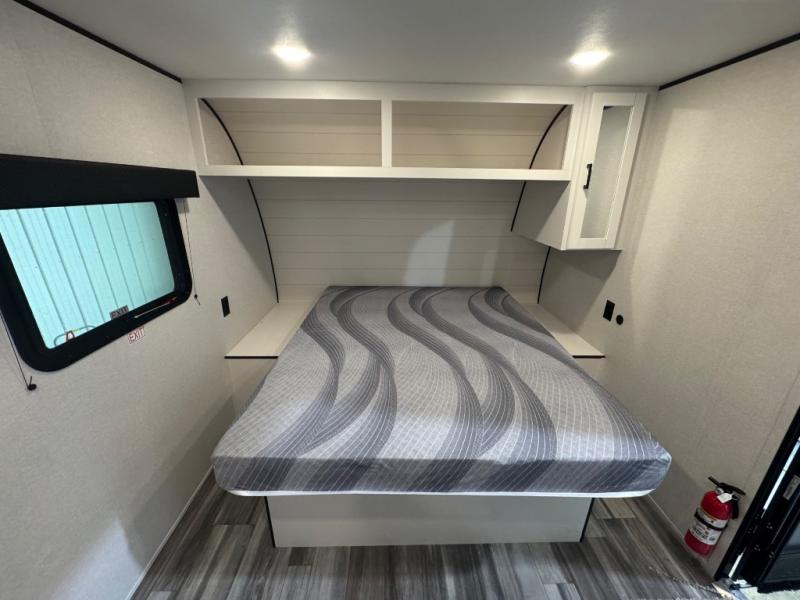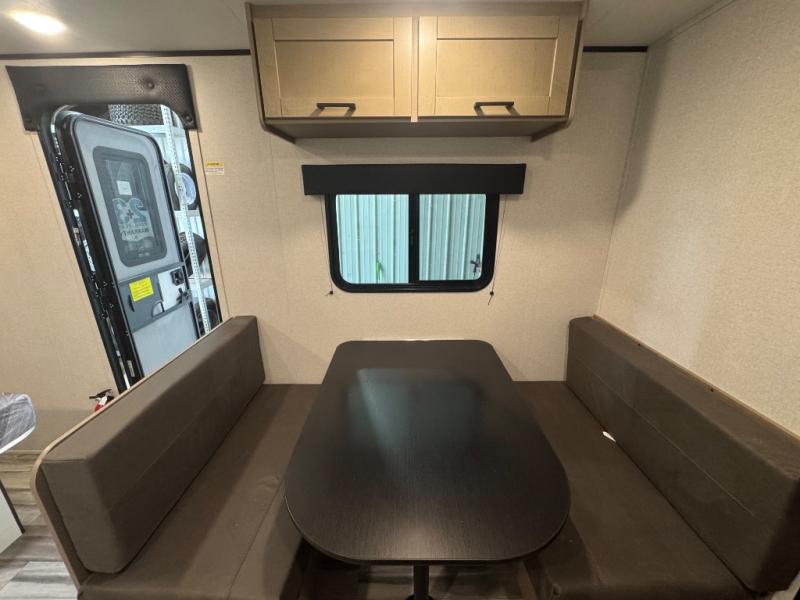 This travel trailer includes everything you need for fun trips at the lake. When you arrive at the campground, you can unload the exterior storage, then put out the 10' power awning. The booth dinette inside will provide a place to dine together, and the full rear bath with a shower will make it easier than ever to clean up after a day of hiking. A front RV queen bed will provide a great night's rest, and the overhead shelf will be perfect for books or personal belongings.