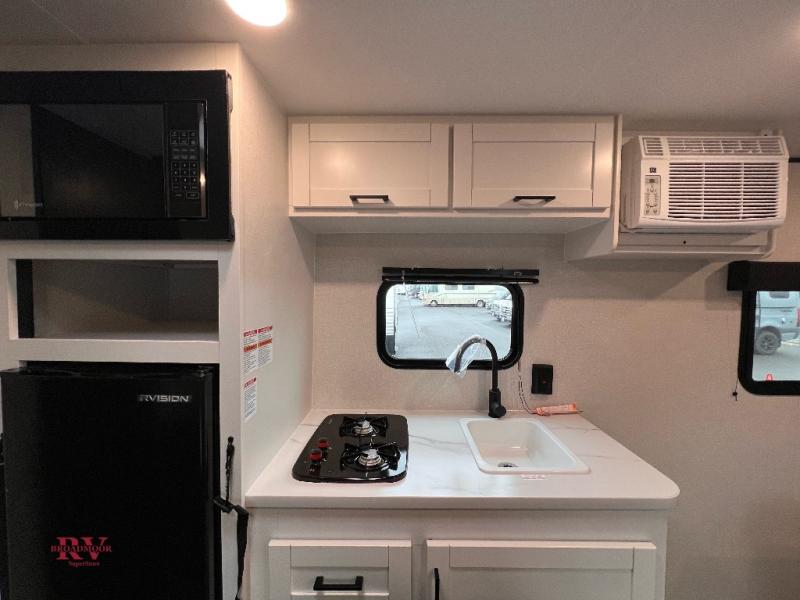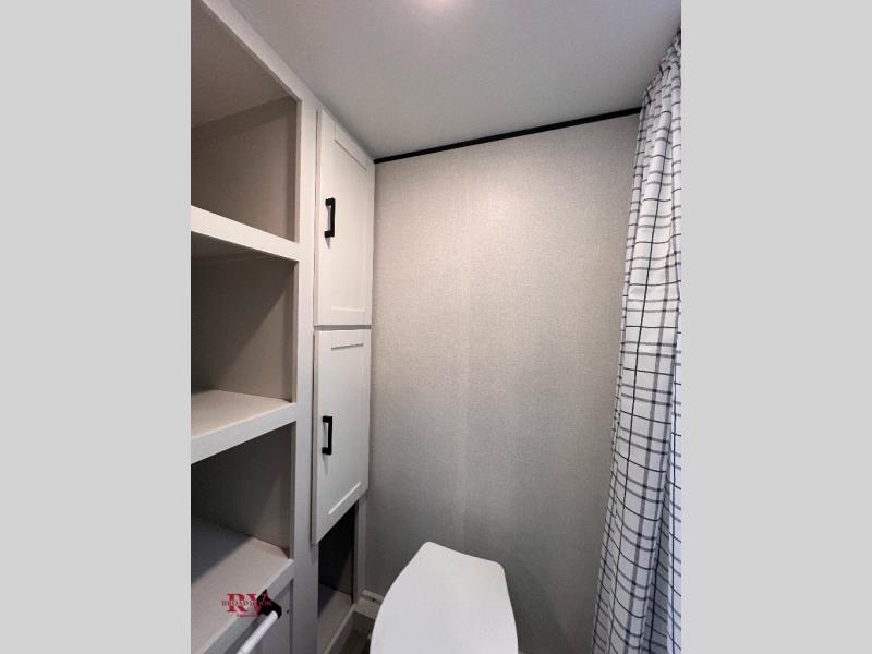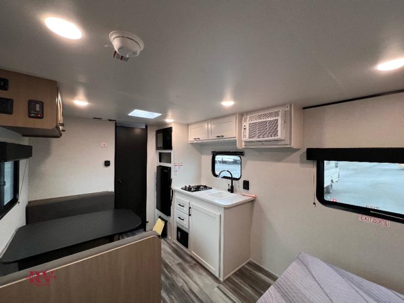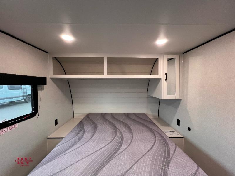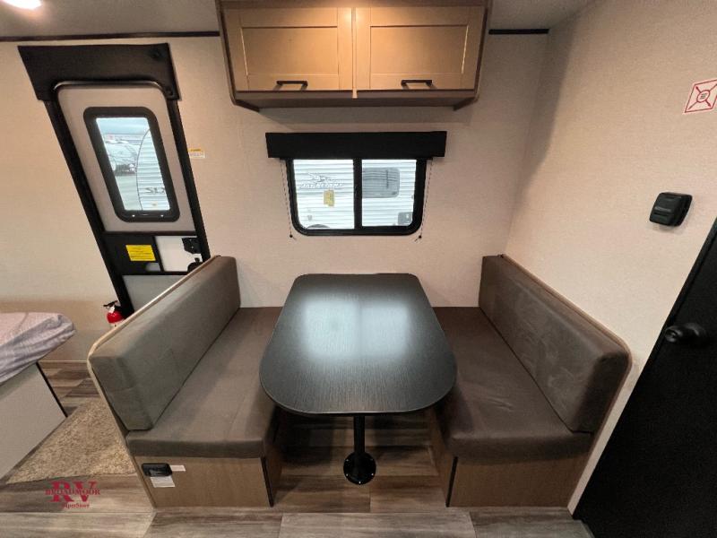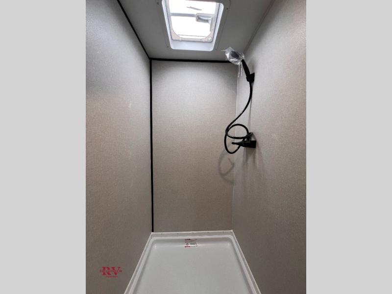 This travel trailer includes everything you need for fun trips at the lake. When you arrive at the campground, you can unload the exterior storage, then put out the 10' power awning. The booth dinette inside will provide a place to dine together, and the full rear bath with a shower will make it easier than ever to clean up after a day of hiking. A front RV queen bed will provide a great night's rest, and the overhead shelf will be perfect for books or personal belongings.