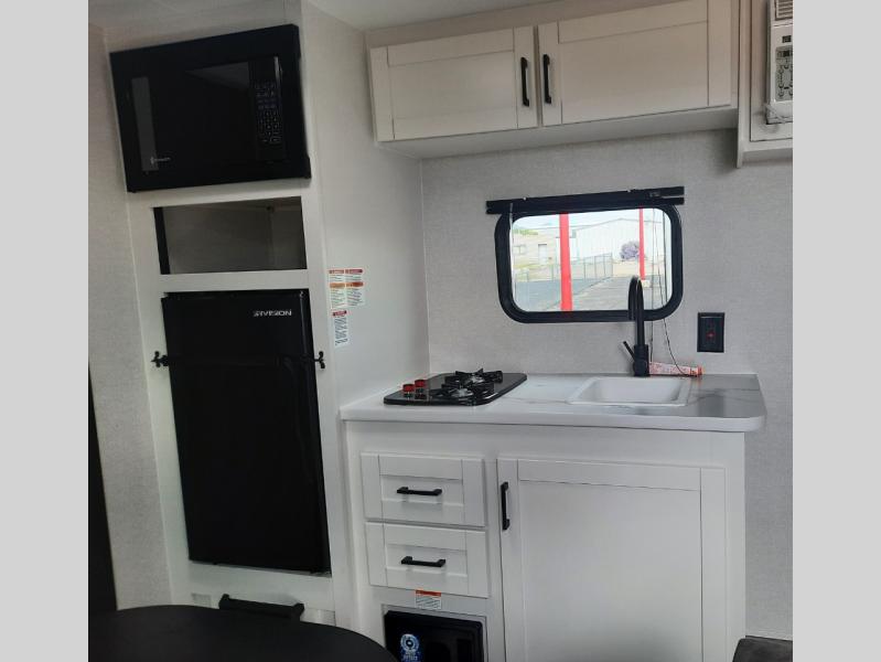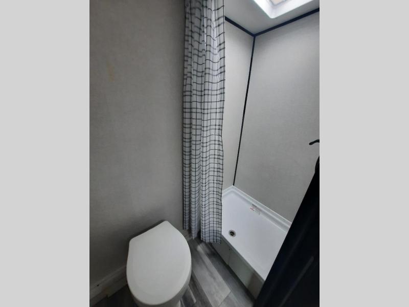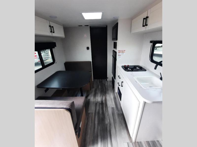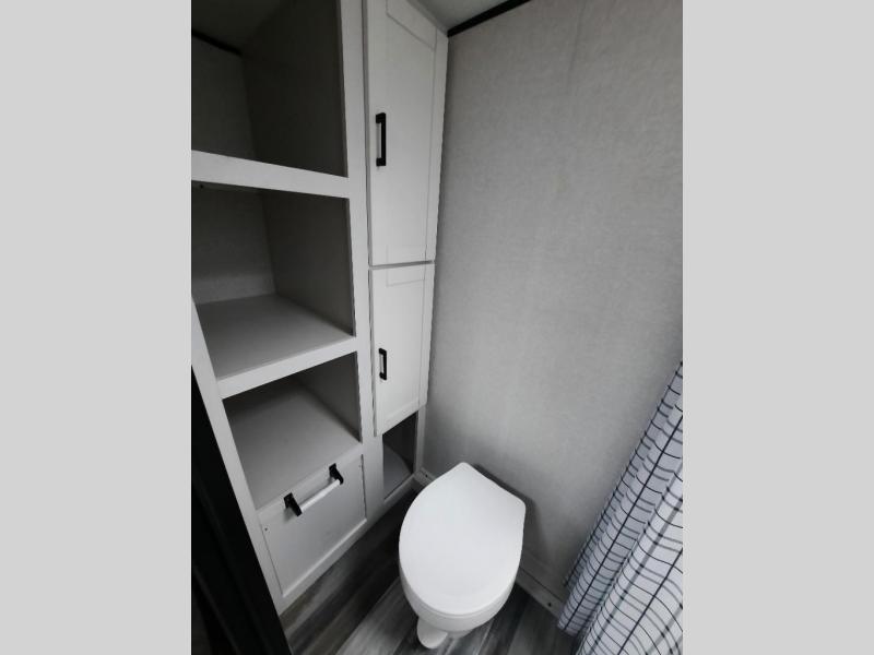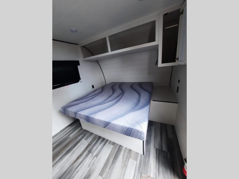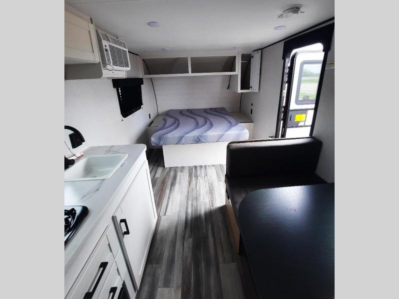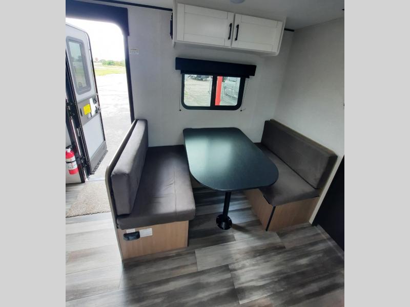 This travel trailer includes everything you need for fun trips at the lake. When you arrive at the campground, you can unload the exterior storage, then put out the 10' power awning. The booth dinette inside will provide a place to dine together, and the full rear bath with a shower will make it easier than ever to clean up after a day of hiking. A front RV queen bed will provide a great night's rest, and the overhead shelf will be perfect for books or personal belongings.