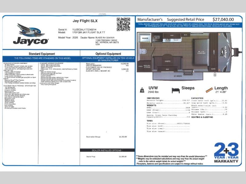 Jayco Jay Flight SLX Sport Edition travel trailer 170FQW highlights: