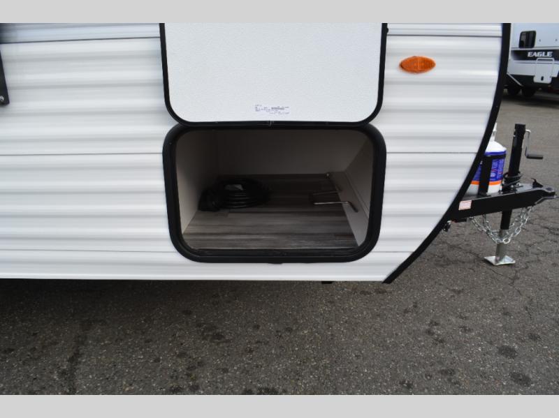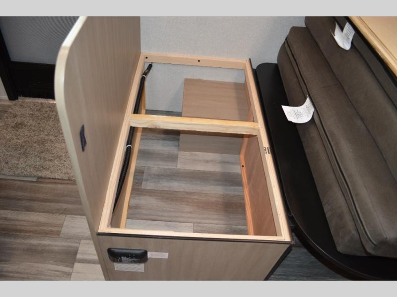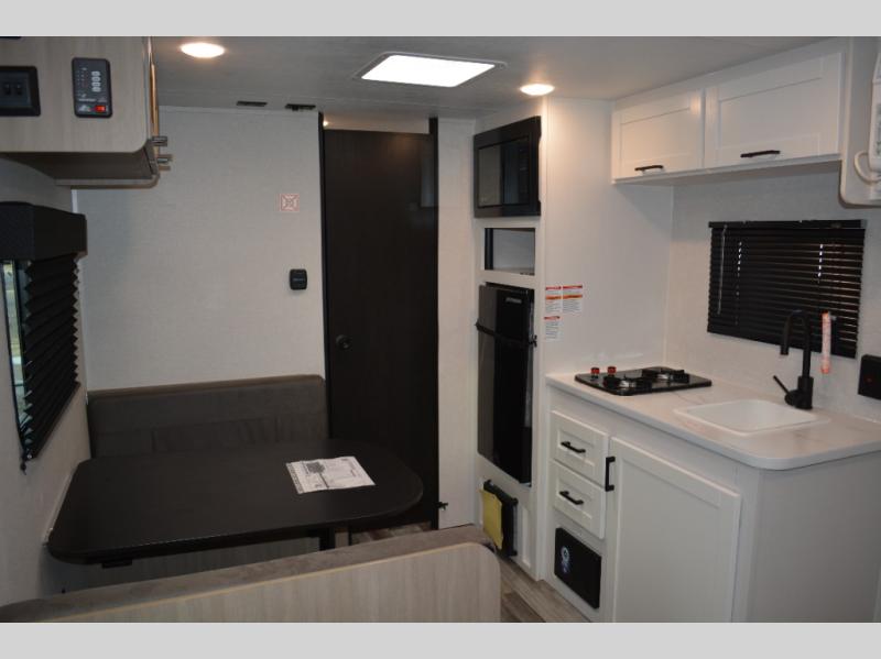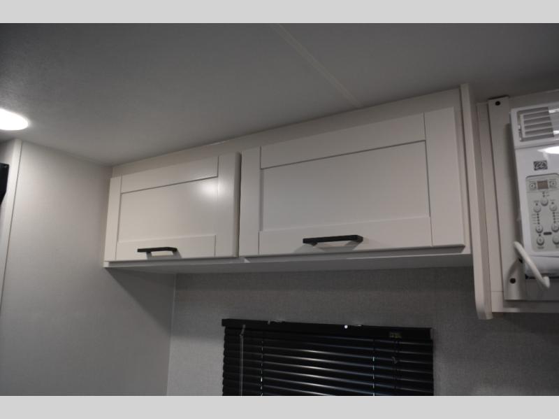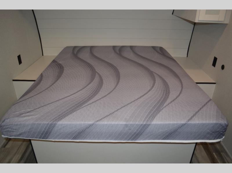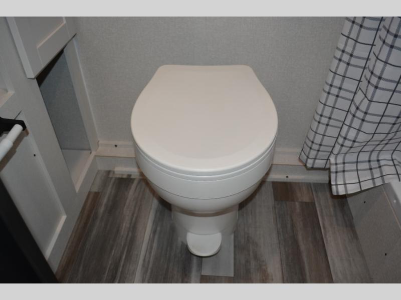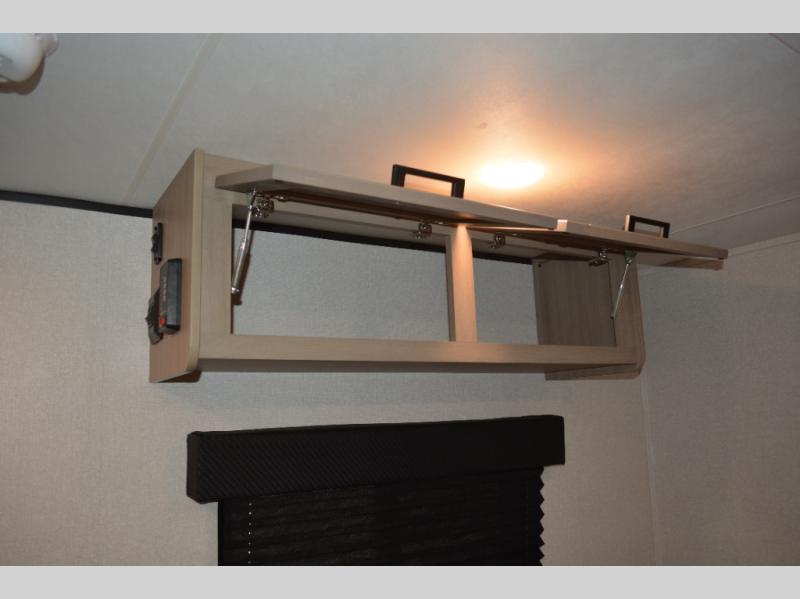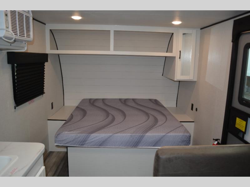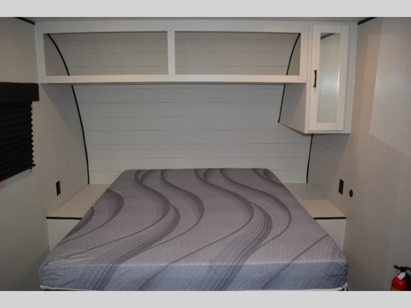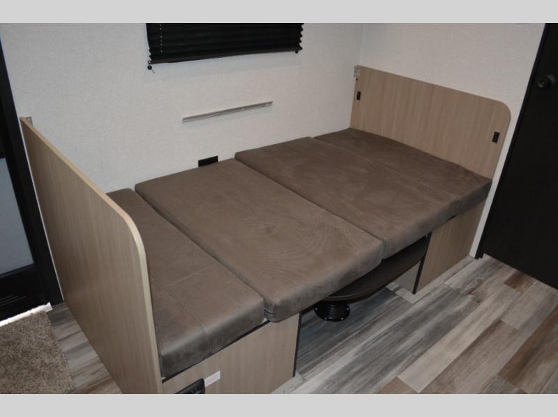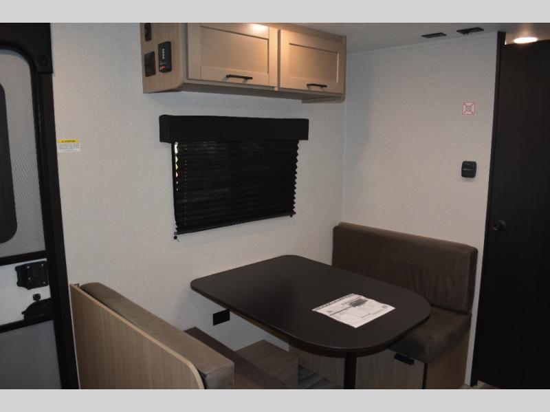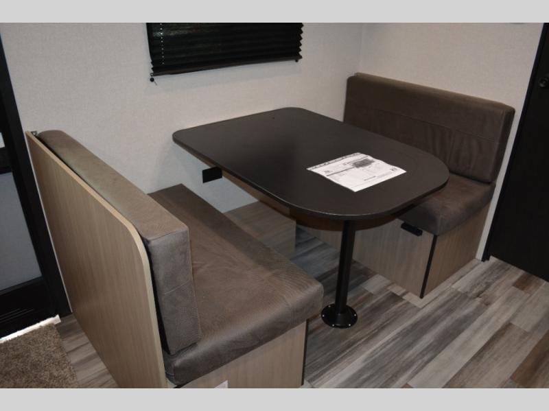 This travel trailer includes everything you need for fun trips at the lake. When you arrive at the campground, you can unload the exterior storage, then put out the 10' power awning. The booth dinette inside will provide a place to dine together, and the full rear bath with a shower will make it easier than ever to clean up after a day of hiking. A front RV queen bed will provide a great night's rest, and the overhead shelf will be perfect for books or personal belongings.