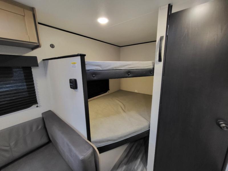 Your crew of six will love camping in this travel trailer! There are double-size bunk beds in the rear corner and a private bath in the other rear corner for easy nighttime use. You will have the front queen bed to yourselves, along with an overhead shelf and a nightstand for your things. And the L-shaped dinette provides a place to dine, play games. The Customer Value Package on this Sport Edition model includes a 19K BTU furnace, stabilizer jacks, a power awning, an entry door with a window and shade prep, and many more stand-out features!